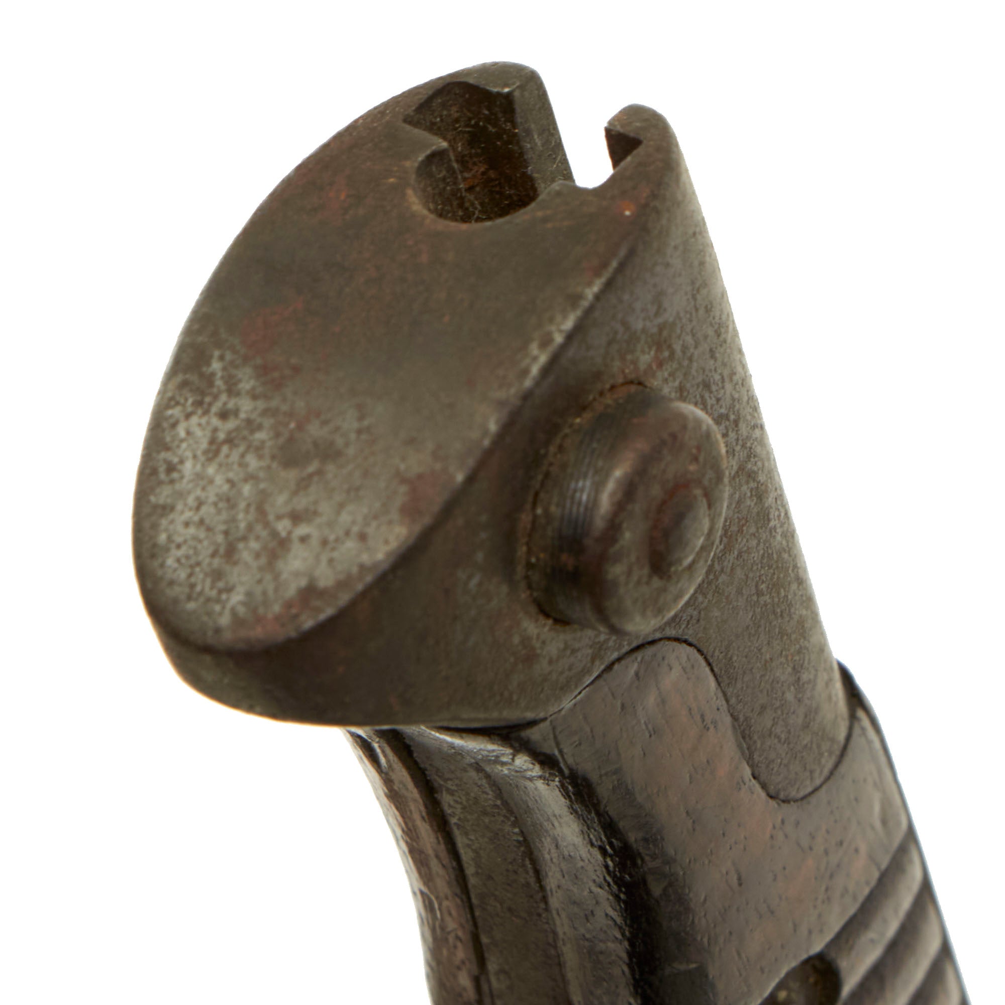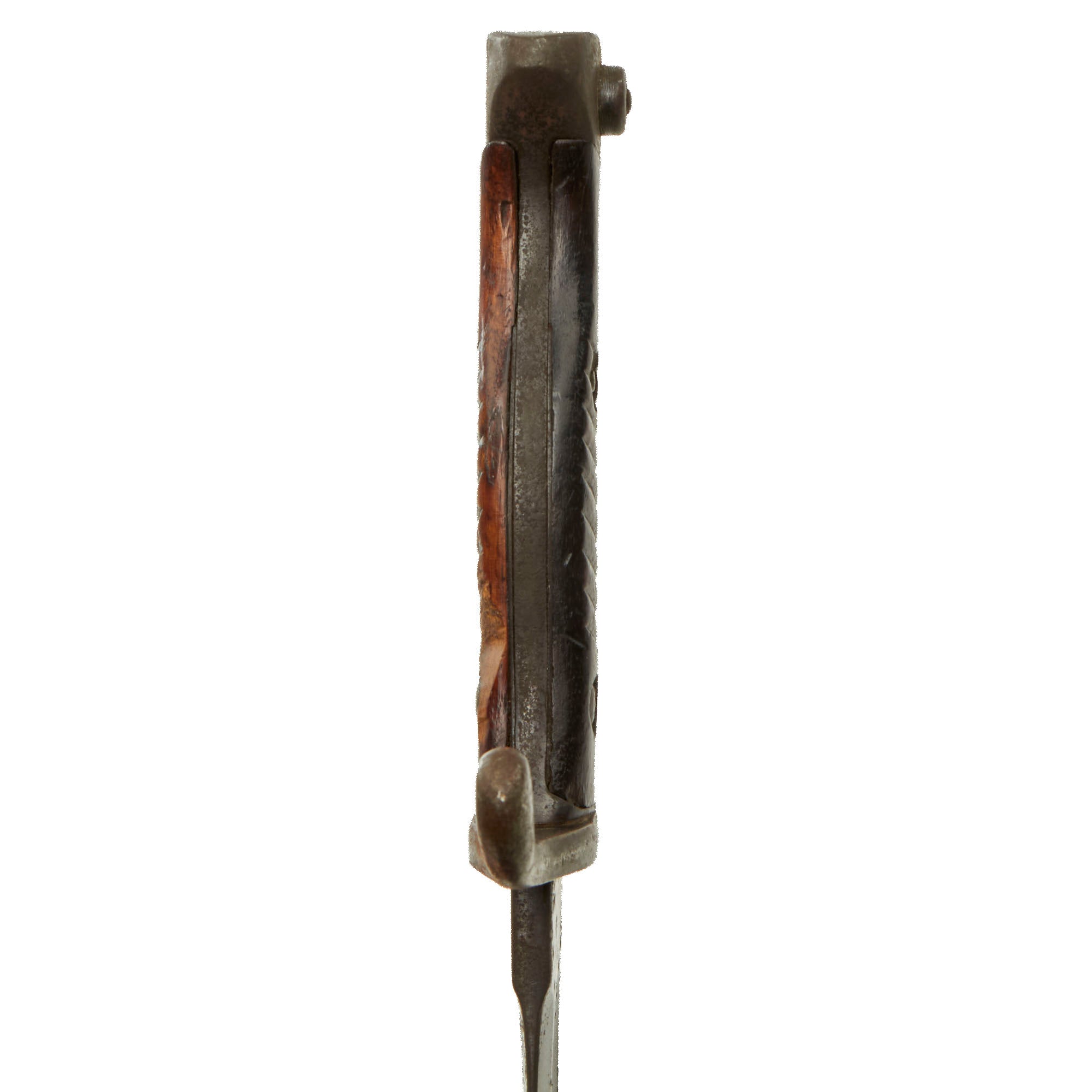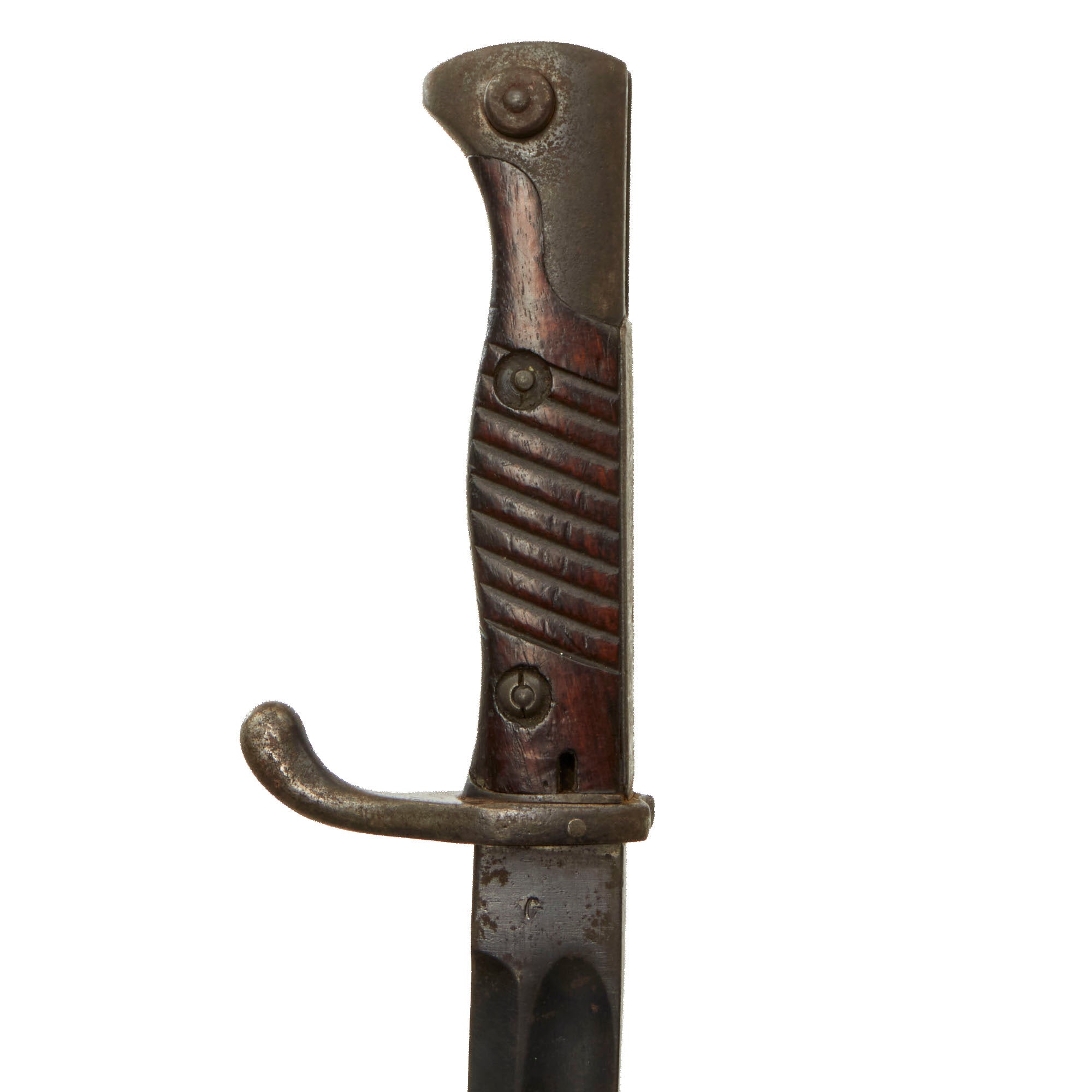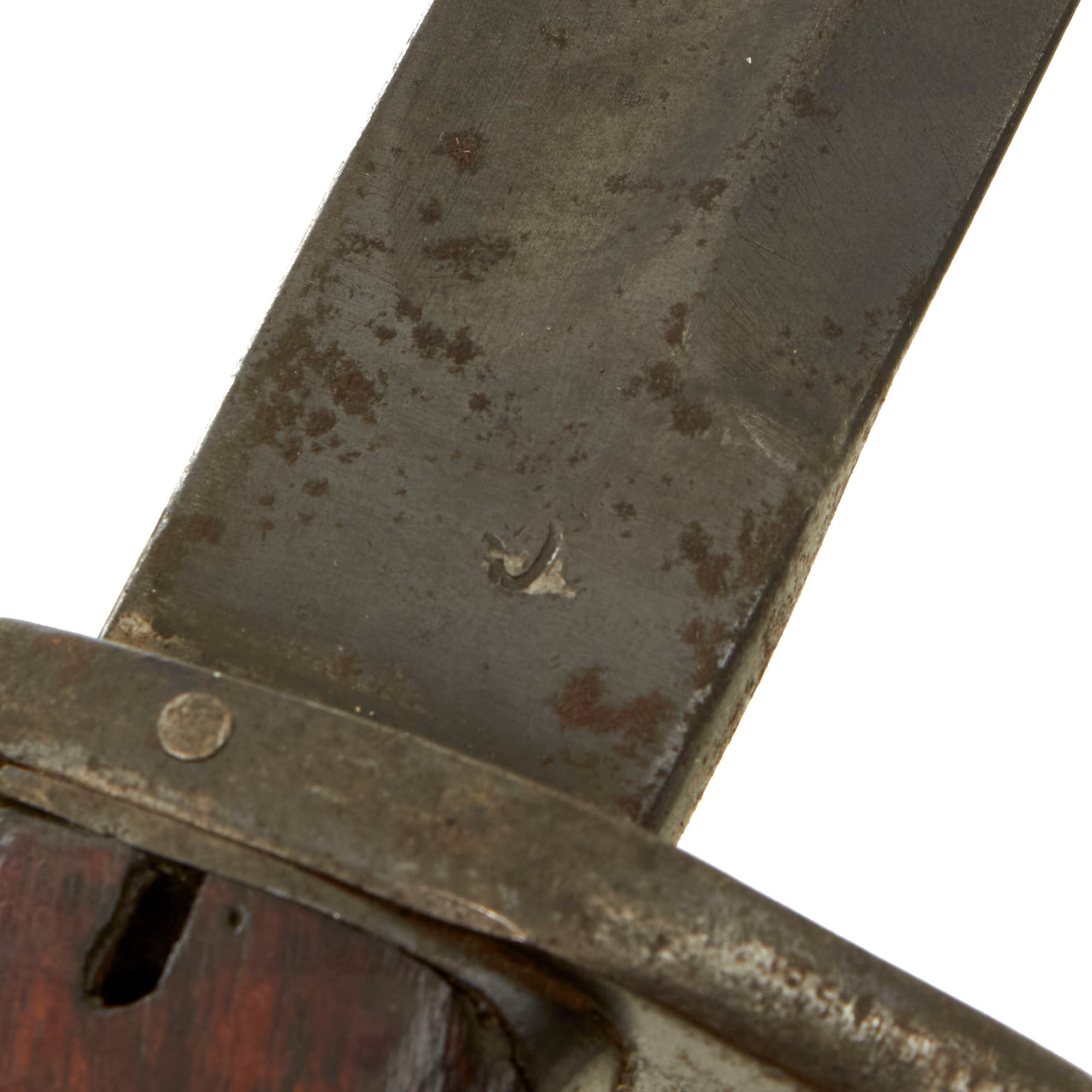 The bayonet blade retains most of its postwar-applied factory darkening, and has a nice set of original grooved wood grips, with heavy denting and some material loss on one side. The hilt and crossguard are solid, though the finish is worn to a grayish patina from use and age. The bayonet lock is fully functional. The blade ricasso is now un-marked on both sides as the blade was resurfaced. There is a small bit of marking on one side, but there is no maker mark and no date or stamp on the spine.