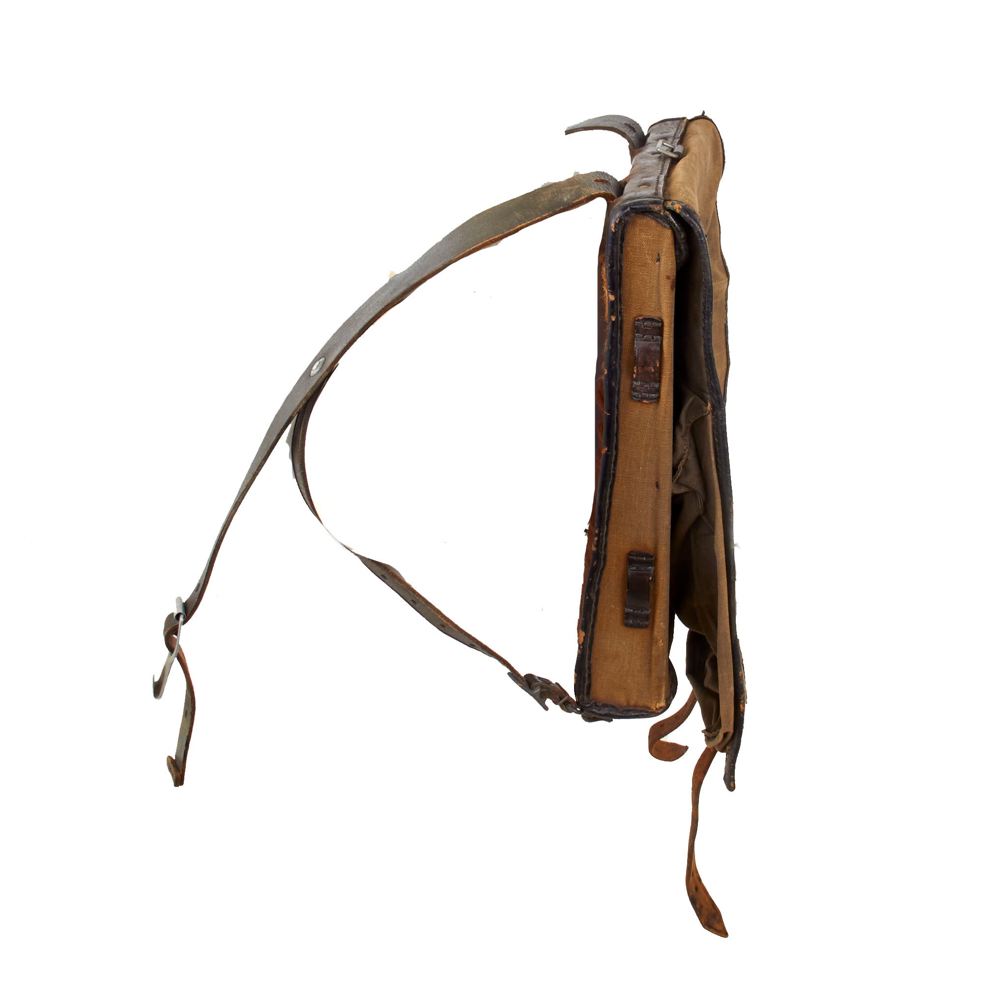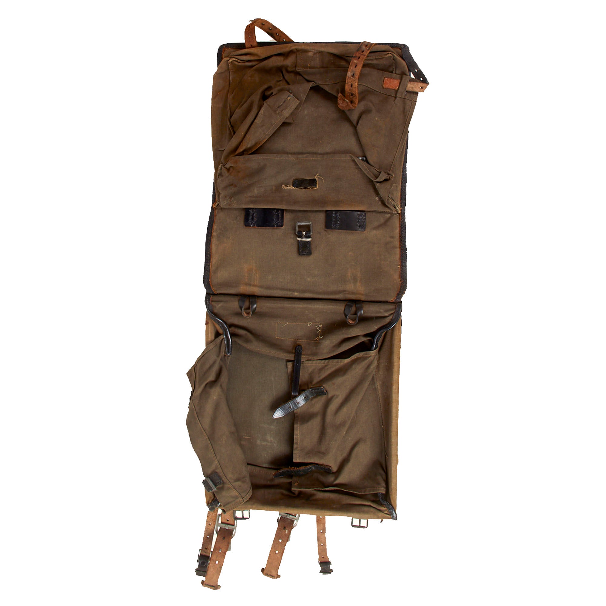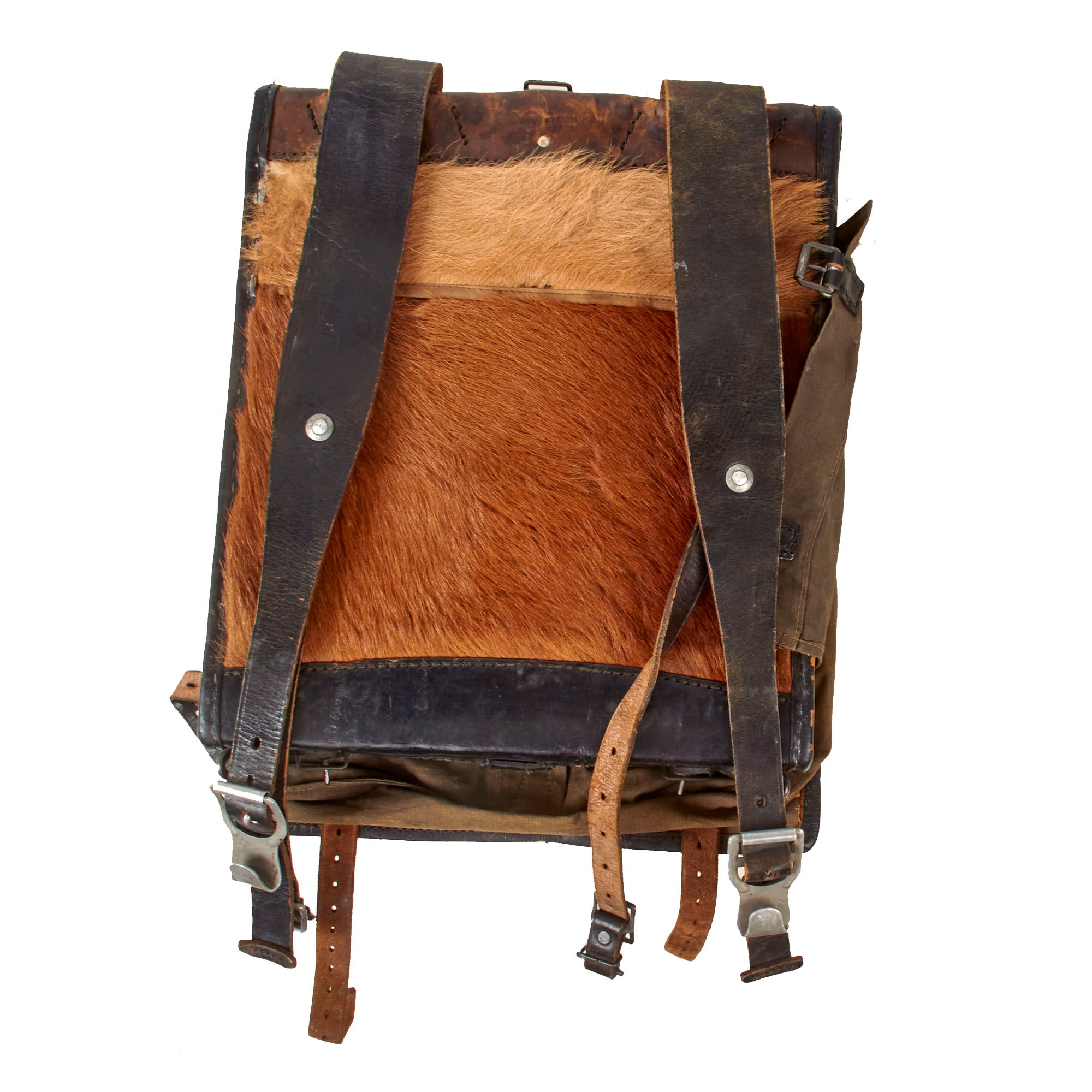 Original Item. Only One Available. These cowhide-covered rucksacks were known as the Tornister (Knapsack) Model 34 (developed in 1934) and this example comes complete with the correct shoulder straps. It looks to have all of the leather components still present, though definitely worn. As the war progressed the design was simplified for economical and practical reasons so the cowhide cover was eliminated making these packs especially scarce on today's collector market. These are often described as being covered with "pony fur", however research shows that this was just a nickname, and was never used on these. The German nickname for these packs was Affe, or ape.