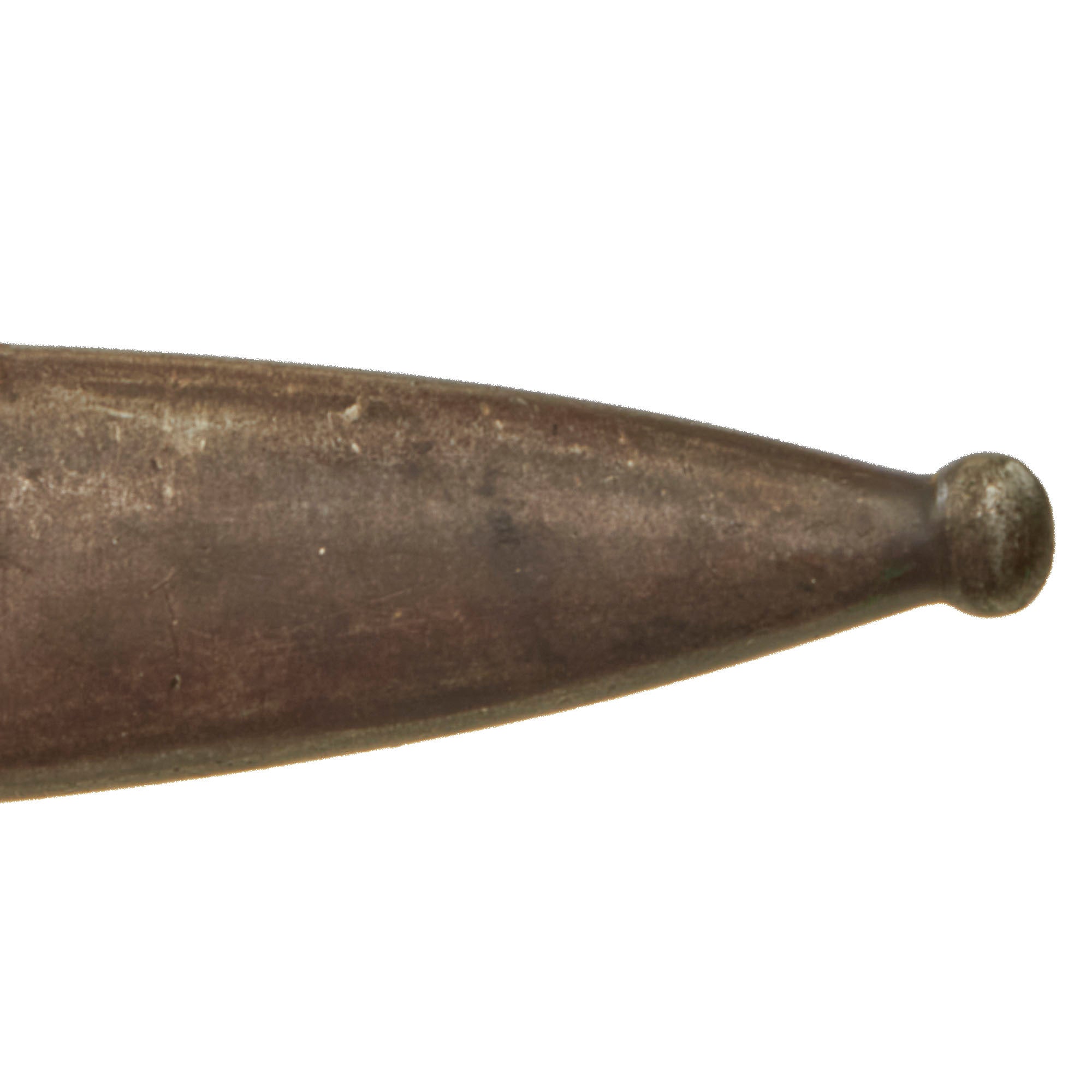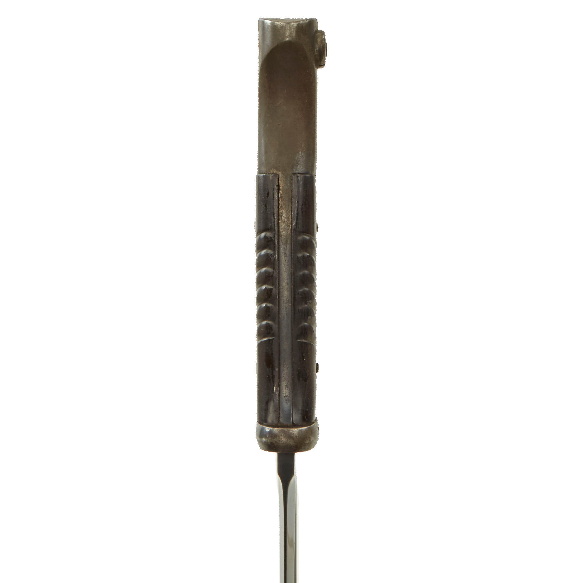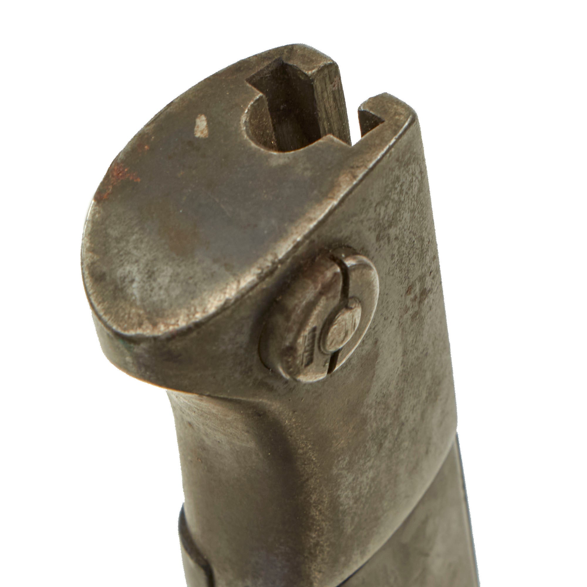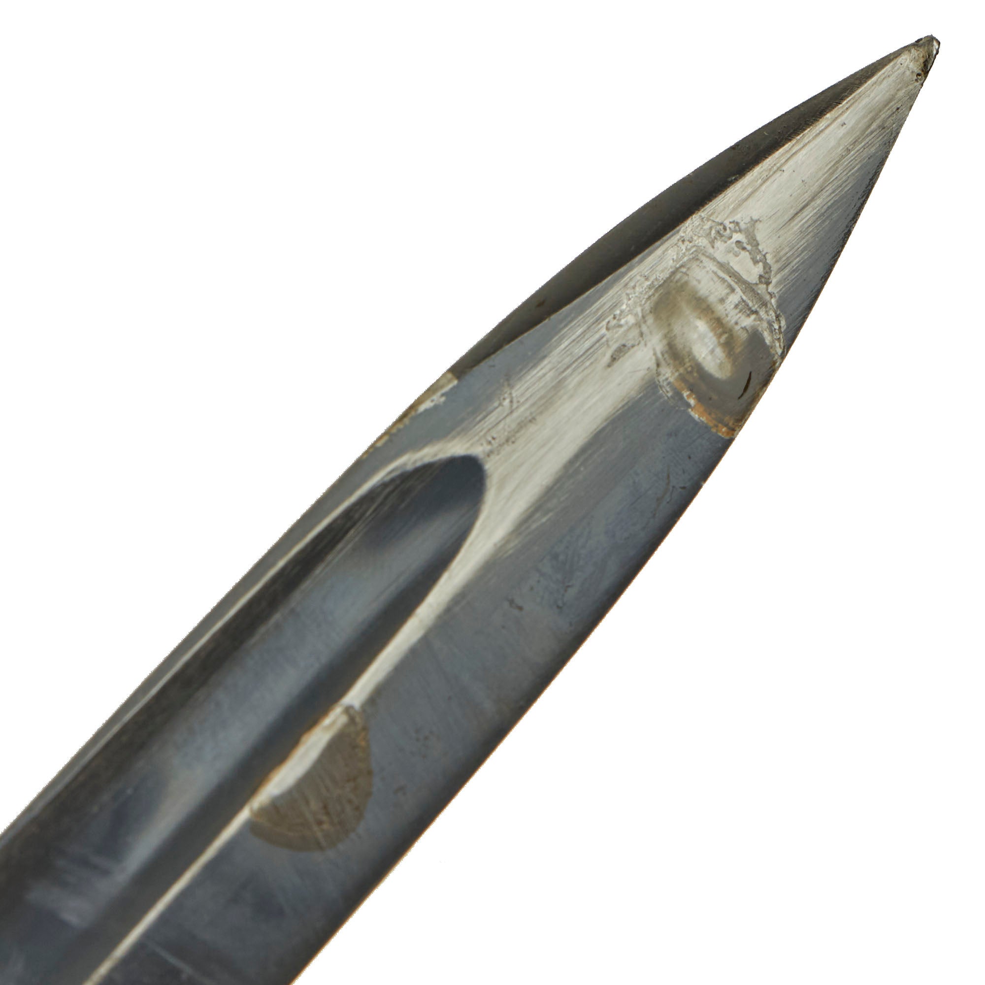 Condition is very good with original bluing on blade, bakelite grips intact and a working locking button. The blade has the factory "sharpening", which did not really make the blade sharp: that was up to the soldier. There is some runner wear to the finish, and also a few spots of finish loss and water stains from contact with the runner, which is wavy spring steel. There is also a bit of damage to the tip of the blade, and the edge has some roughness and scuffing. The pommel retains the finish fairly well, however there is definitely water staining and oxidation on one side, probably from contact with a leather frog over a long period of time. The scabbard finish is still in good condition, showing wear and peppering but no denting, and the top of the scabbard still has the original bluing, having been protected by a frog, which is no longer present.