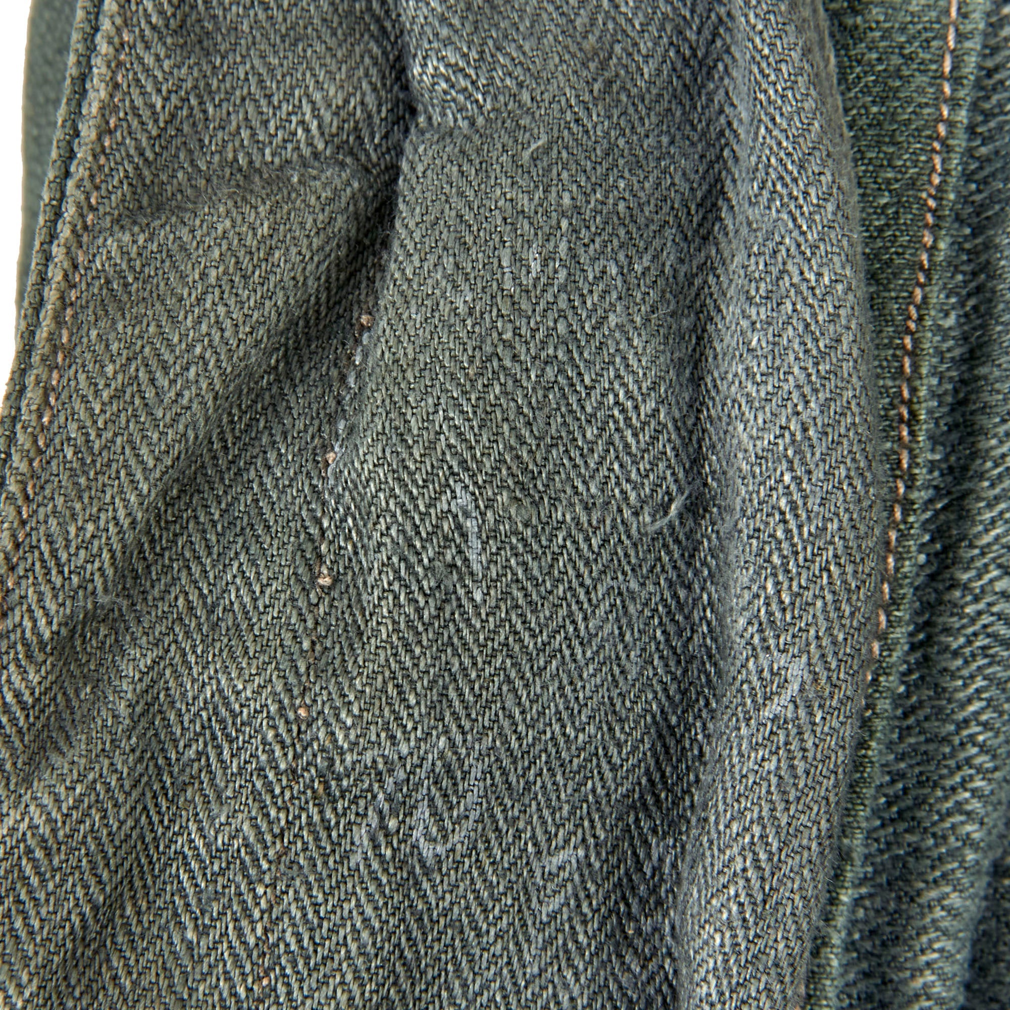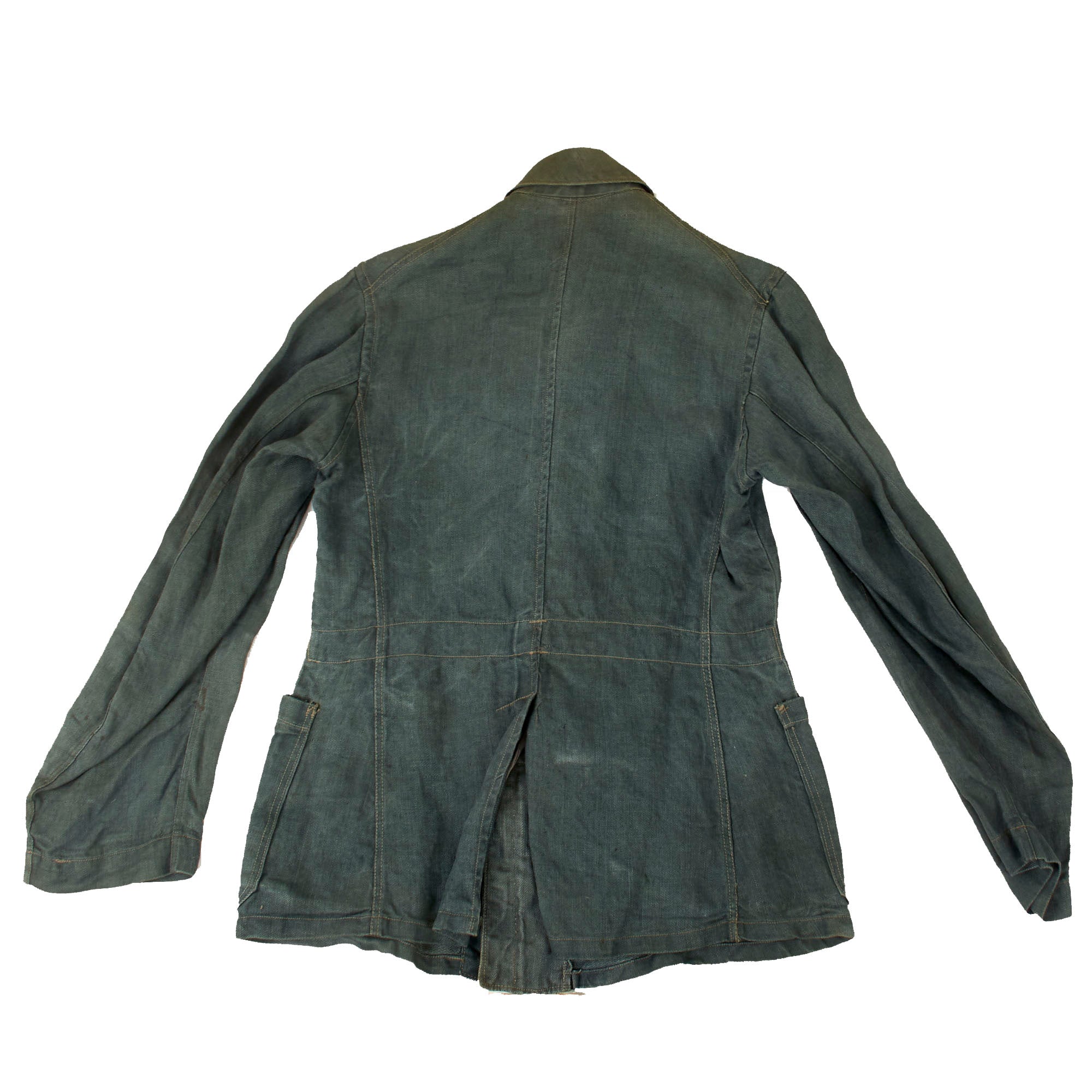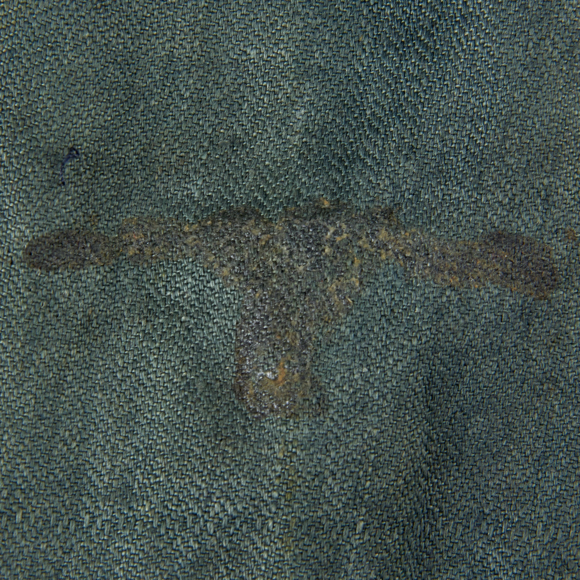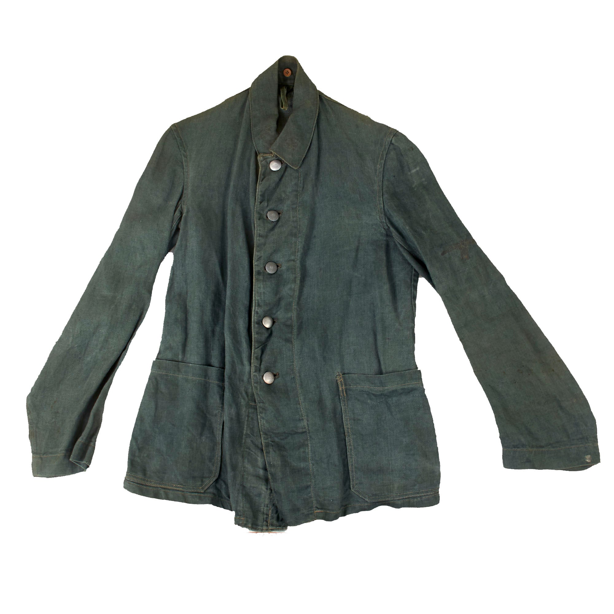 Here we have one of those early "reed green" colored HBT Drilljacke Tunics, which does not appear to have ever been outfitted with any type of insignia. We can see an area on the left sleeve where some type of eagle was attached post war, now removed. Close inspection of the shoulders, collar, and right chest do not show any evidence of insignia ever having been stitched on. As these earlier tunics did not have any provision for shoulder insignia, usually they would have been sewn on directly, which would have definitely left evidence.