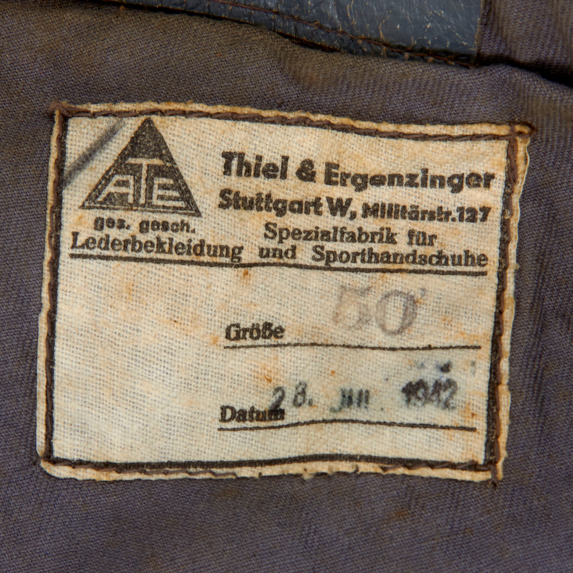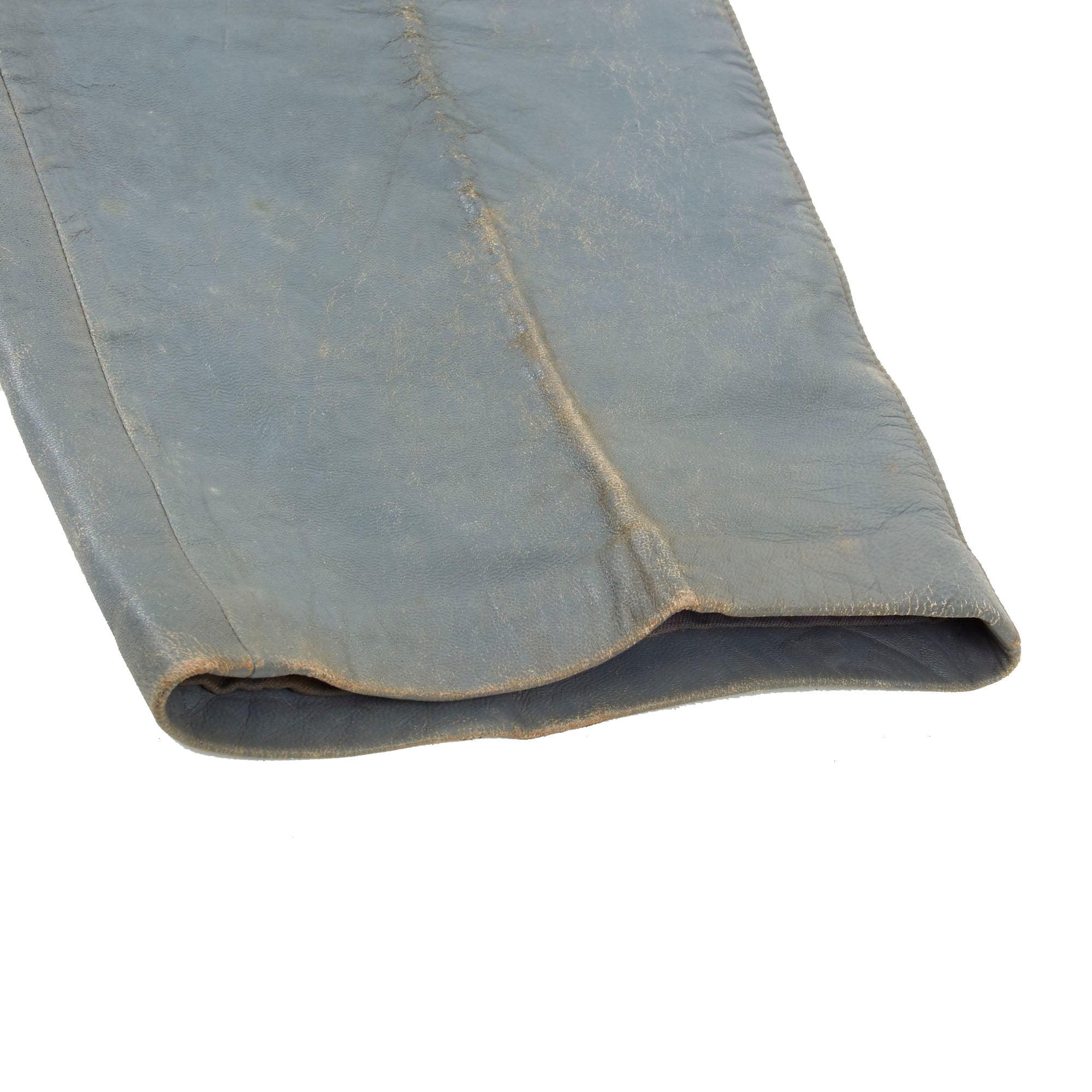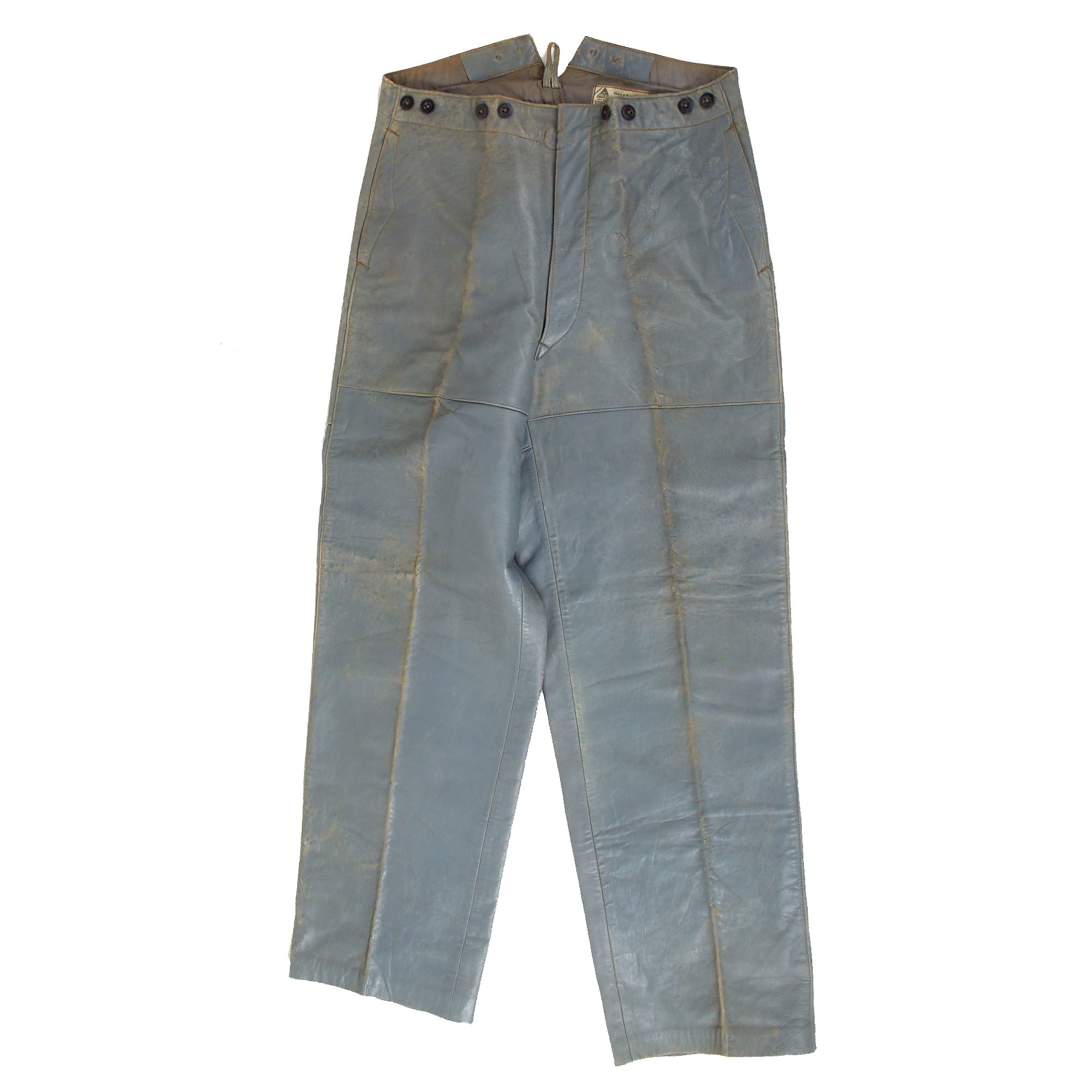 Original Item: Only One Available. This is a lovely pair of blue gray leather trousers, part of the grey leather deck uniform in a variant pattern as worn by lower ranked Kriegsmarine personnel. These would be used with a similar colored leather deck jacket, designed to protect the wearer from the elements.