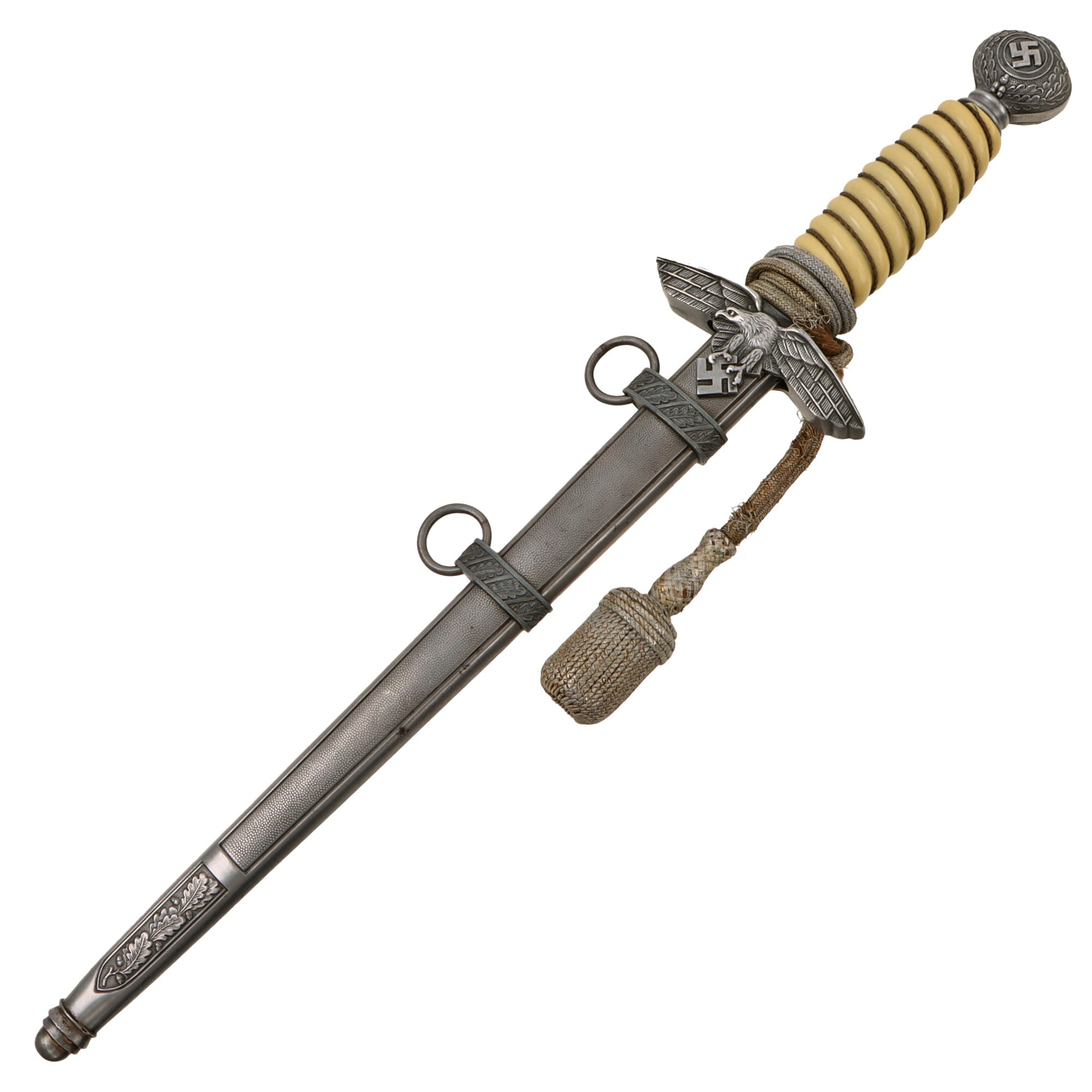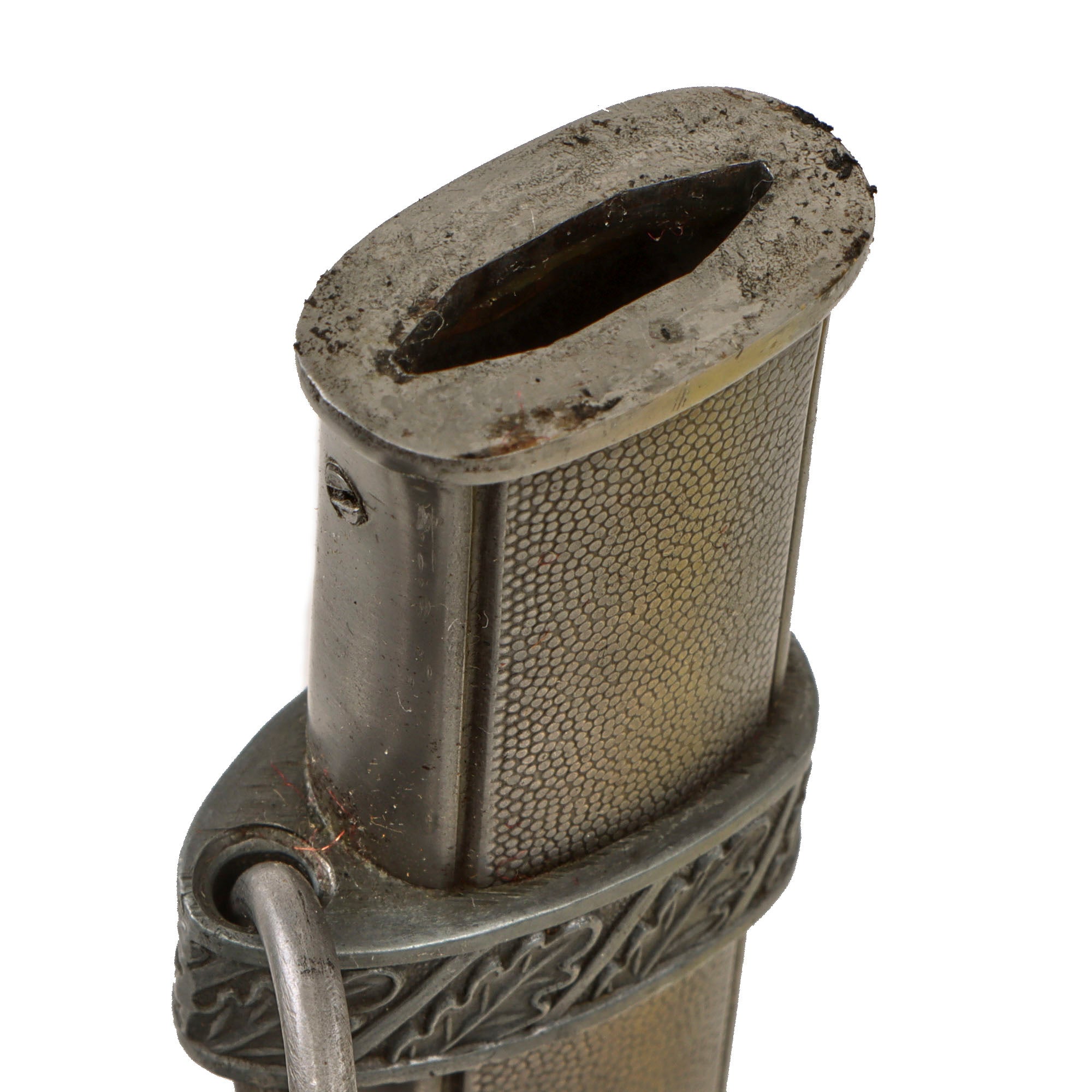 This steel scabbard is a fine, straight example, and is the correct Luftwaffe type, with large pebbled panels on both sides and smaller panels bearing oak leaves and acorns near the bottom. It looks to be zinc plated, and shows just a bit of oxidation in a few scattered areas. The bands are zinc alloy, and are well defined and have outstanding hand enhanced oak leaves tipped at a 45 degree angle. The throat is retained by two flush-mount screws on the narrow sides of the scabbard. Really a great example of a Luftwaffe scabbard.