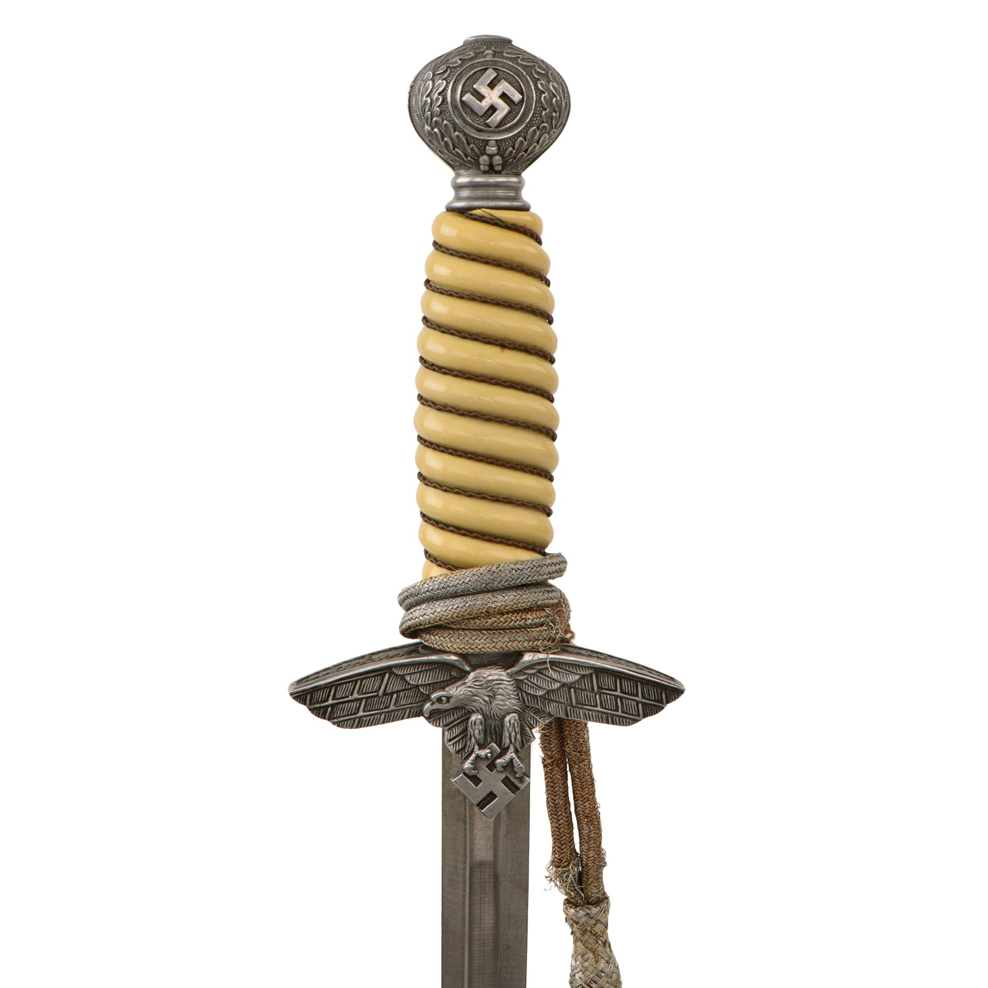 Original Item: Only One Available. This is a very nice example of mid-war production 2nd Model Luftwaffe dagger. It is a fine Solingen-Produced example made by the well- known firm of P.D. Lüneschloss, Fabrik blanker Waffen (Factory of bare weapons). The celluloid grip of this dagger is still the original ivory color, and hasn't faded to orange or darker like so many that we have seen. It has a great color like lightly stained ivory and has a nice tapered shape. The grip is wrapped with twisted and bullion wrapped wires, which show oxidation, and there is just a tiny crack in the celluloid near the pommel.