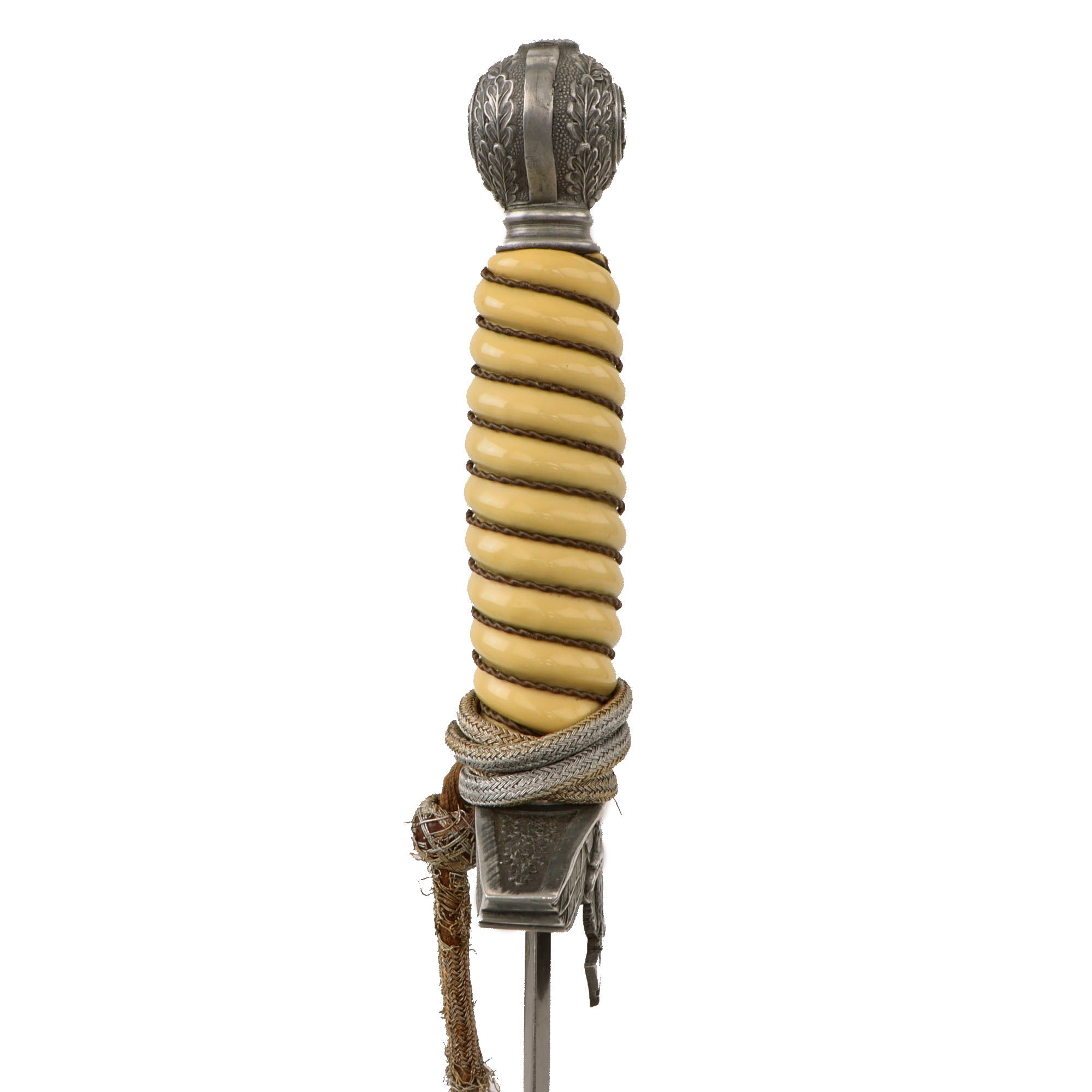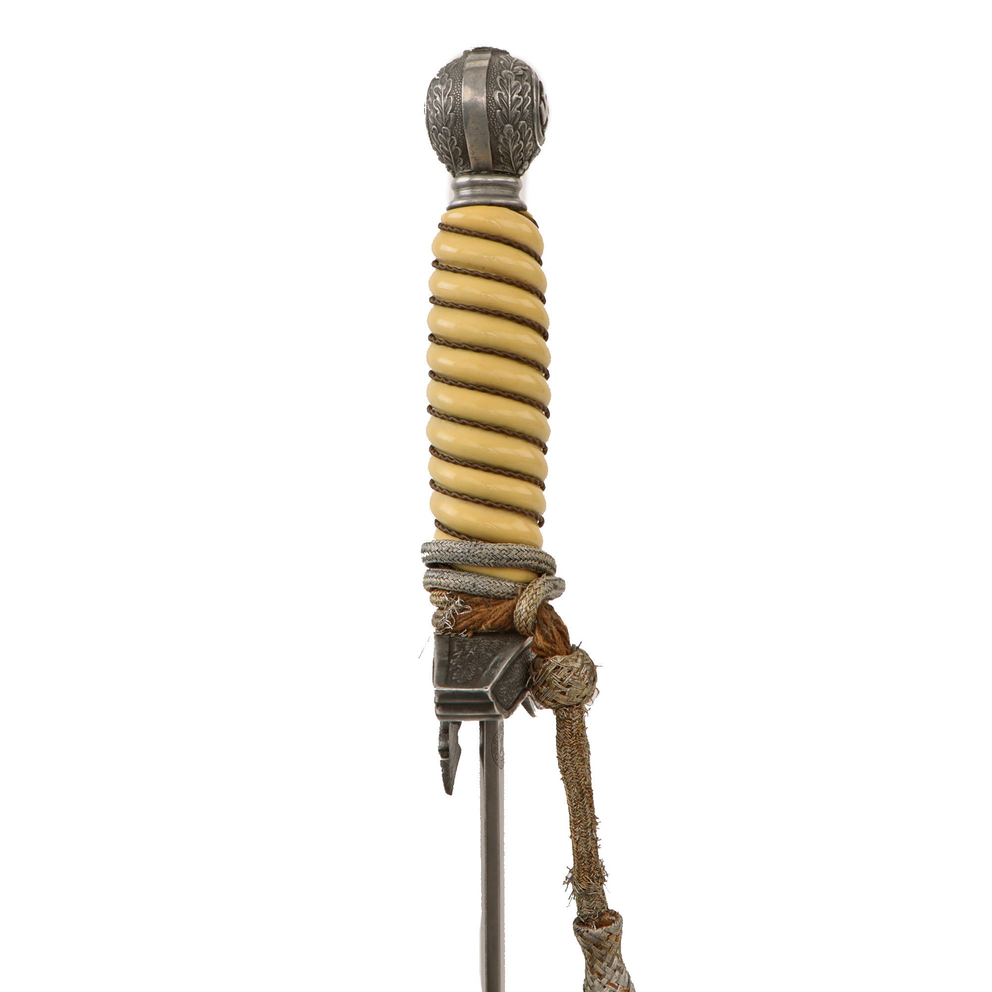 The ferrule looks to be plated steel, and it is still in very good condition, showing little oxidation. Tied around this is an original portepee, which is in very good service used condition, and tied in the Luftwaffe style. There is definitely degradation of the core threads and bullion near the end "knot", and some areas where the bullion covering is completely missing.