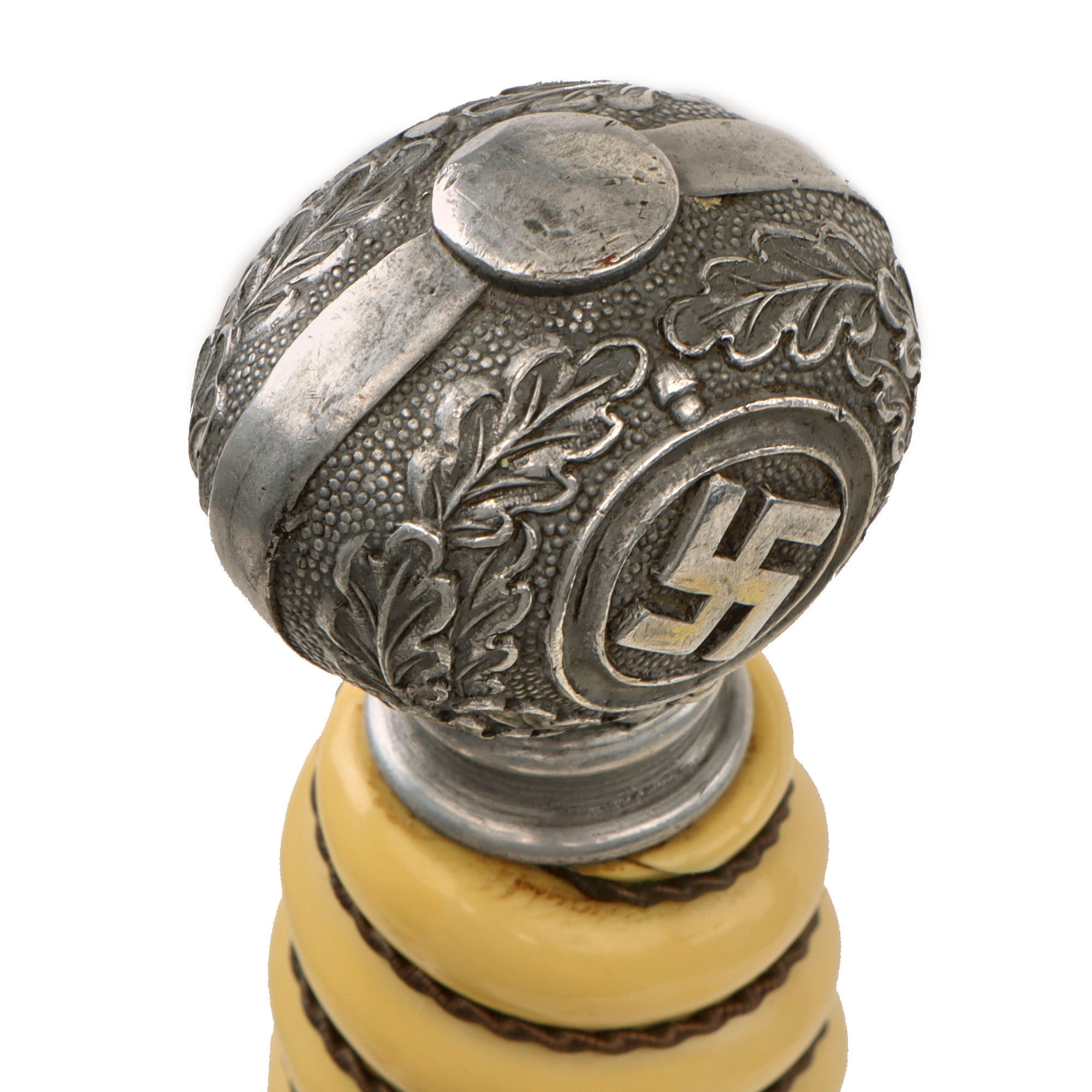 The hilt mounts are in similar condition with a lovely patina of age. The pommel is very good and still shows most of the original detail. The "mobile" swass on both sides are clear and the oak leaves around them are raised out and heavily hand enhanced. The pommel appears to be solid aluminum, which has some antiquing in the recesses of the design. The crossguard is also made of Aluminum, which was an "Air Age" material, which was used to make most airplanes. It was considered fitting and desirable for the eagle-shaped guard to be made of this material. The front side is an eagle with a breast and talon area that is vaulted out much more so than the crossguards seen on other types of daggers. The guard shows little wear and has great feathering on the eagle. The bird, of course, flies to the left and grasps a mobile swas in his talons. The reverse panel is decorated with small pebbling, which is still clear.