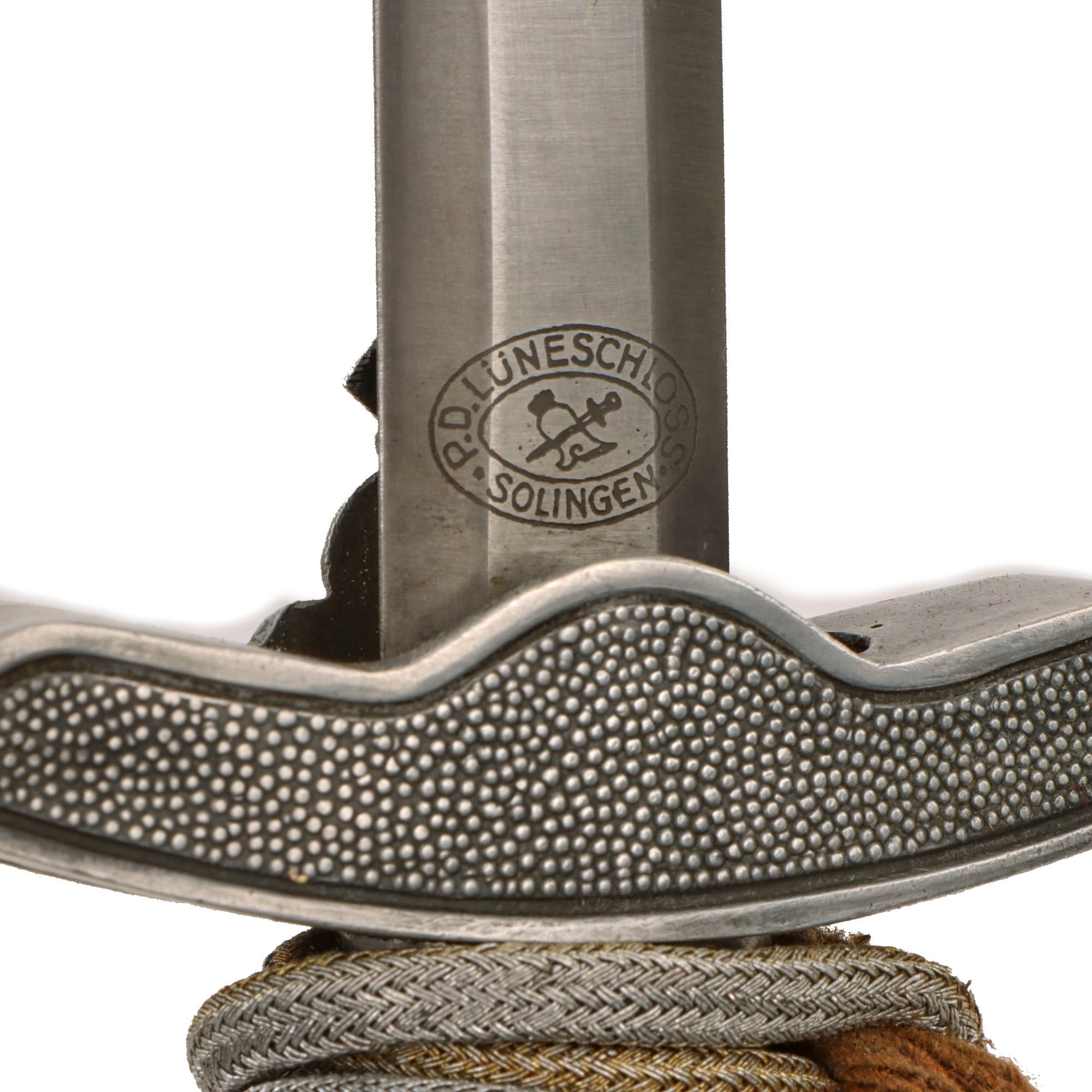 The ricasso is stamped with the P.D. Lüneschloss trademark oval logo, mostly hidden by the cross guard: