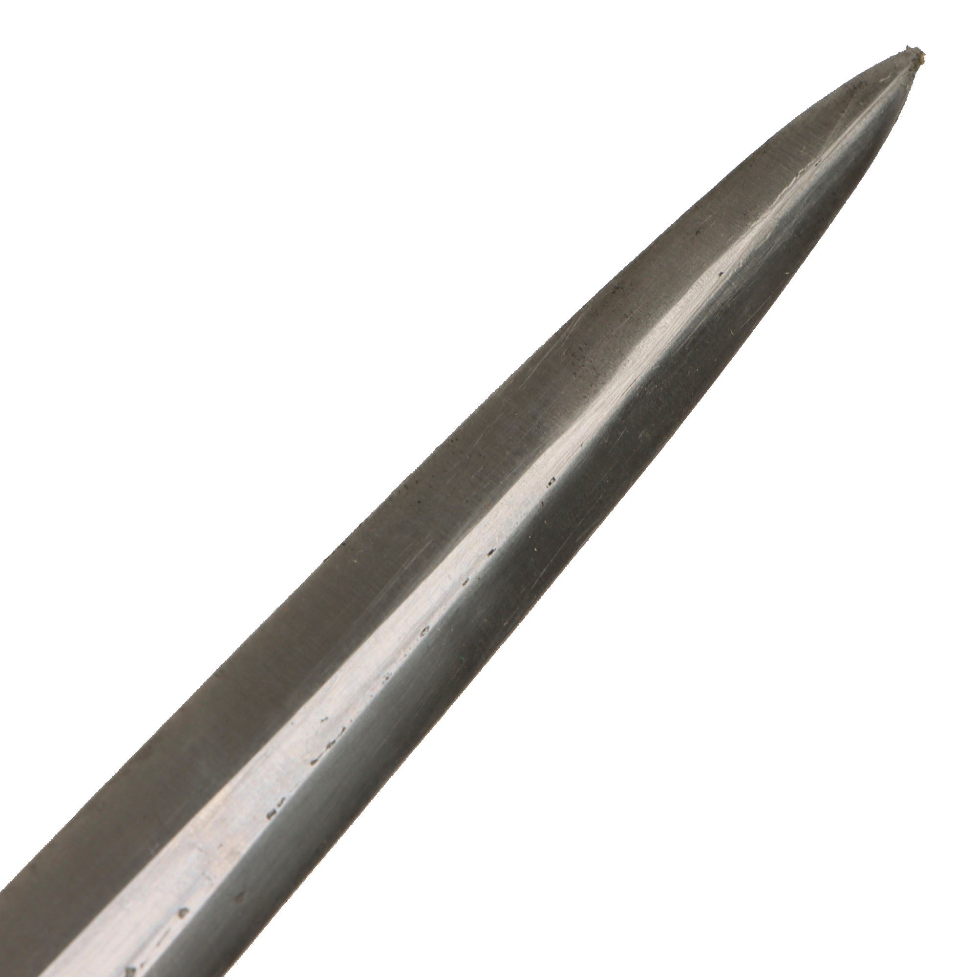 The very good condition blade is bright throughout, showing almost all of the original cross grain. This texture is iconic, and is the definitive identifying characteristic for a real WWII German Blade. We can see a few areas on the blade flats that look to have suffered oxidation from the runners, which was then polished out. The tip is still intact, with no bending, just some light wear. There also is the usual runner wear on the blade surface, however this is present on just about every dagger out there. Definitely a great blade. The original leather blade buffer is still present in the recess on the guard.