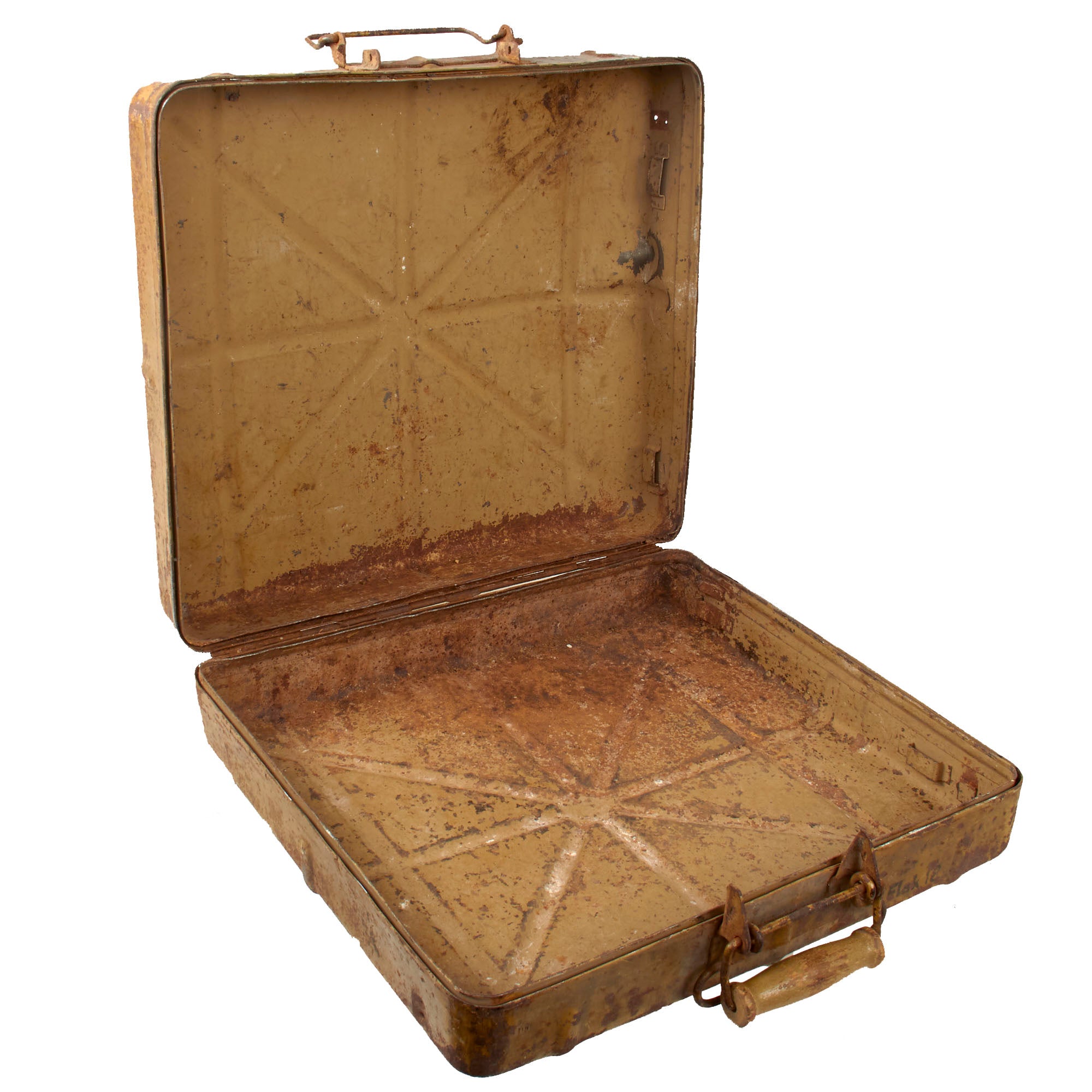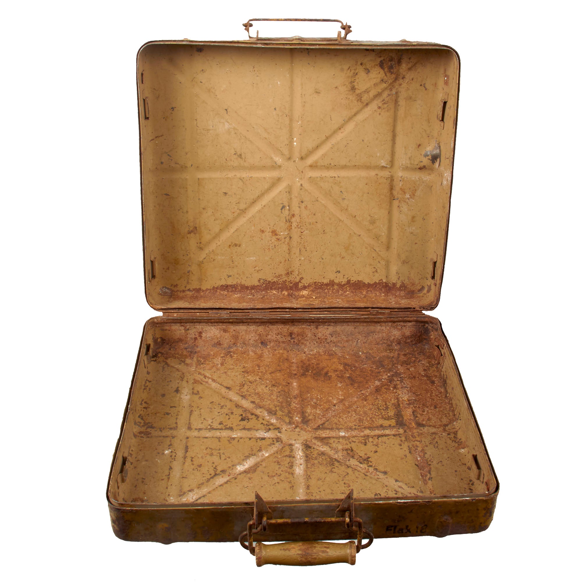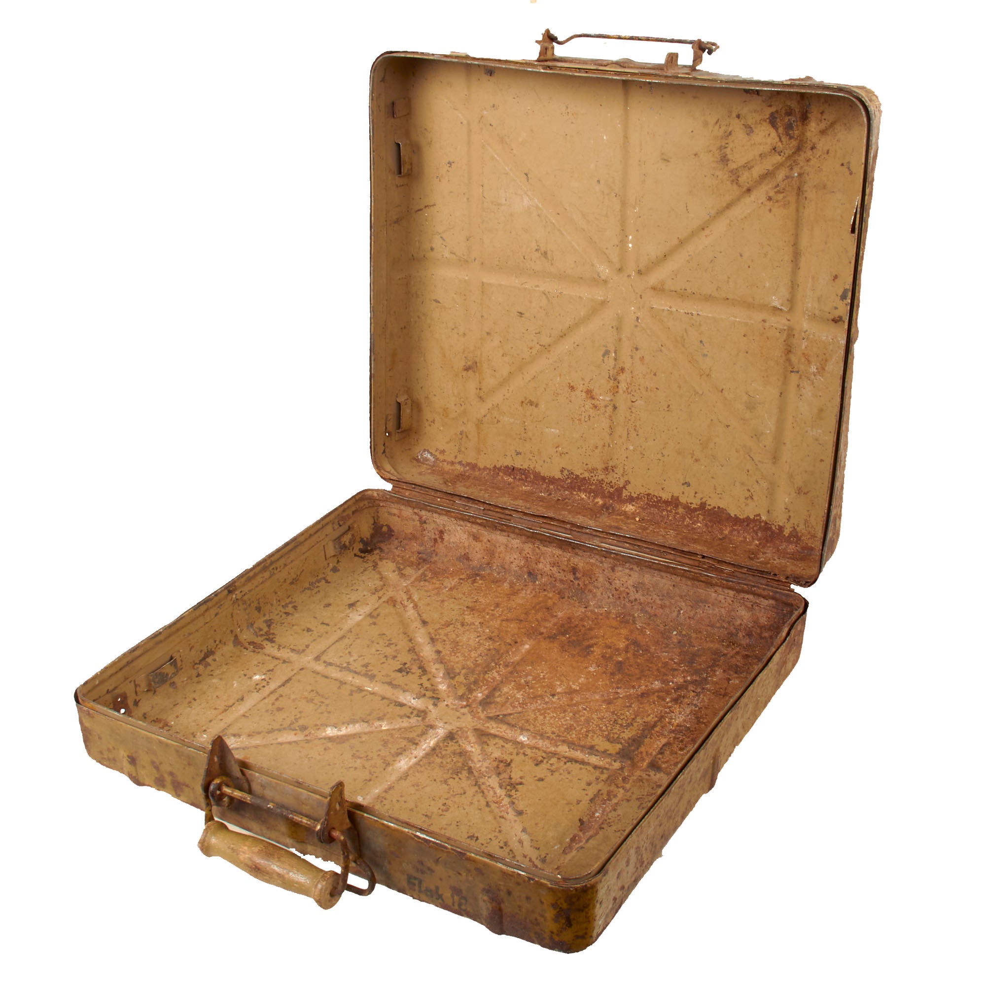 This ammunition box was used to safely transport FLAK shells. The case itself is nearly identical to the German WWII M24 Stick Grenade Case, however the internal rack is different. This excellent example is in the original Afrikakorps tan color paint with original black paint stencil on the exterior writing that reads: