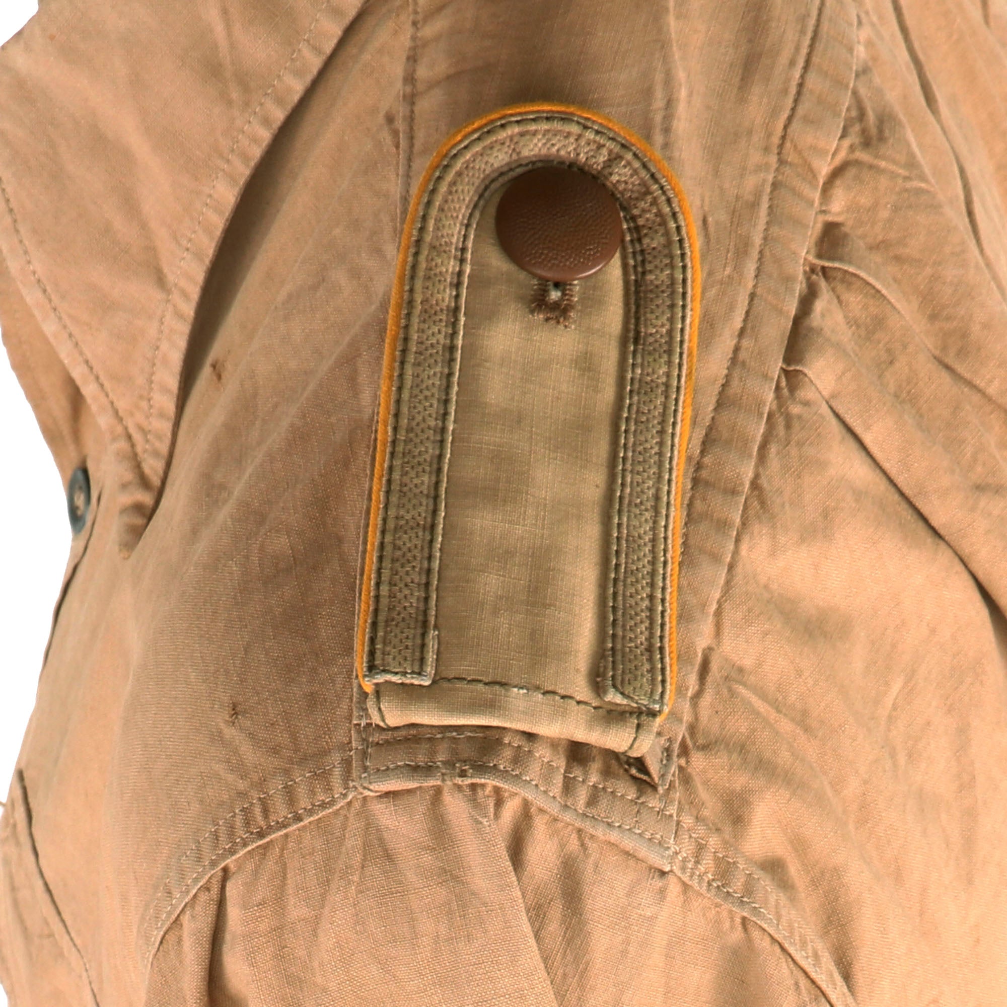 The button-attached style Unteroffizier Schulterklappen (NCO Shoulder Boards or Epaulettes) are actually made from tan fabric to match the shirt. These are piped in Goldgelb (Gold-Yellow), the correct Waffenfarbe (Corps Color) for Aviator troops such as pilots and ground personnel, as well as Fallschirmjäger (parachute troops). Inside the piping is a single row of DAK Tan 10mm NCO tress open at the edges, indicating the Junior NCO rank of Unteroffizier (sergeant).