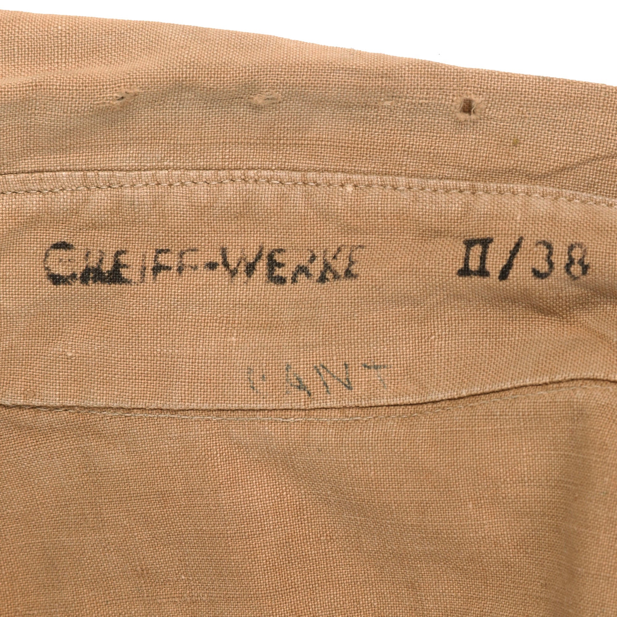 There are no maker markings on the shirt, but the inside of the collar is marked CHEIFF-WERKE II / 38, indicating the manufacturer, and that it is a size II jacket, and the 38 is supposed to indicate the measure of the collar in centimeters, which we have confirmed with a measuring tape.