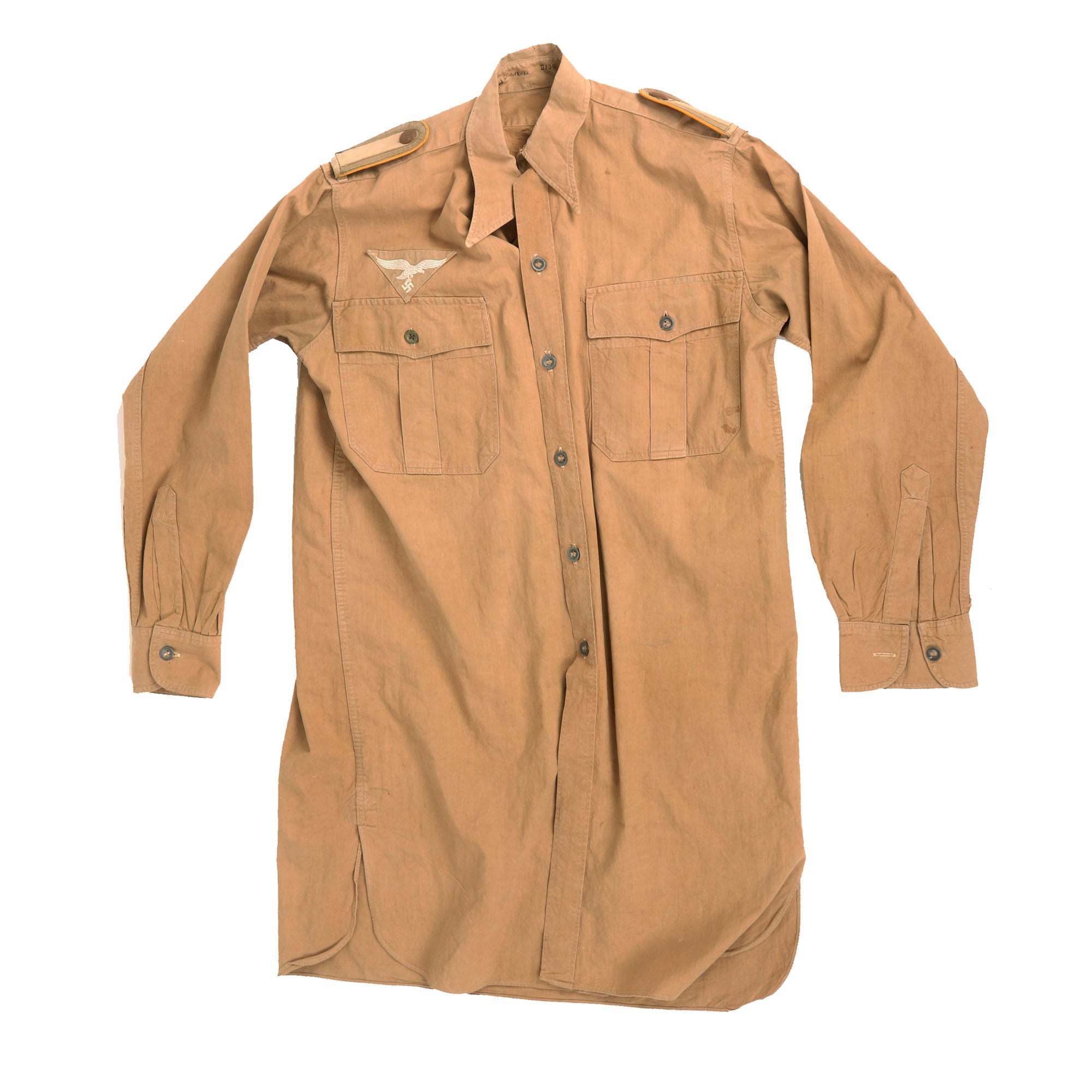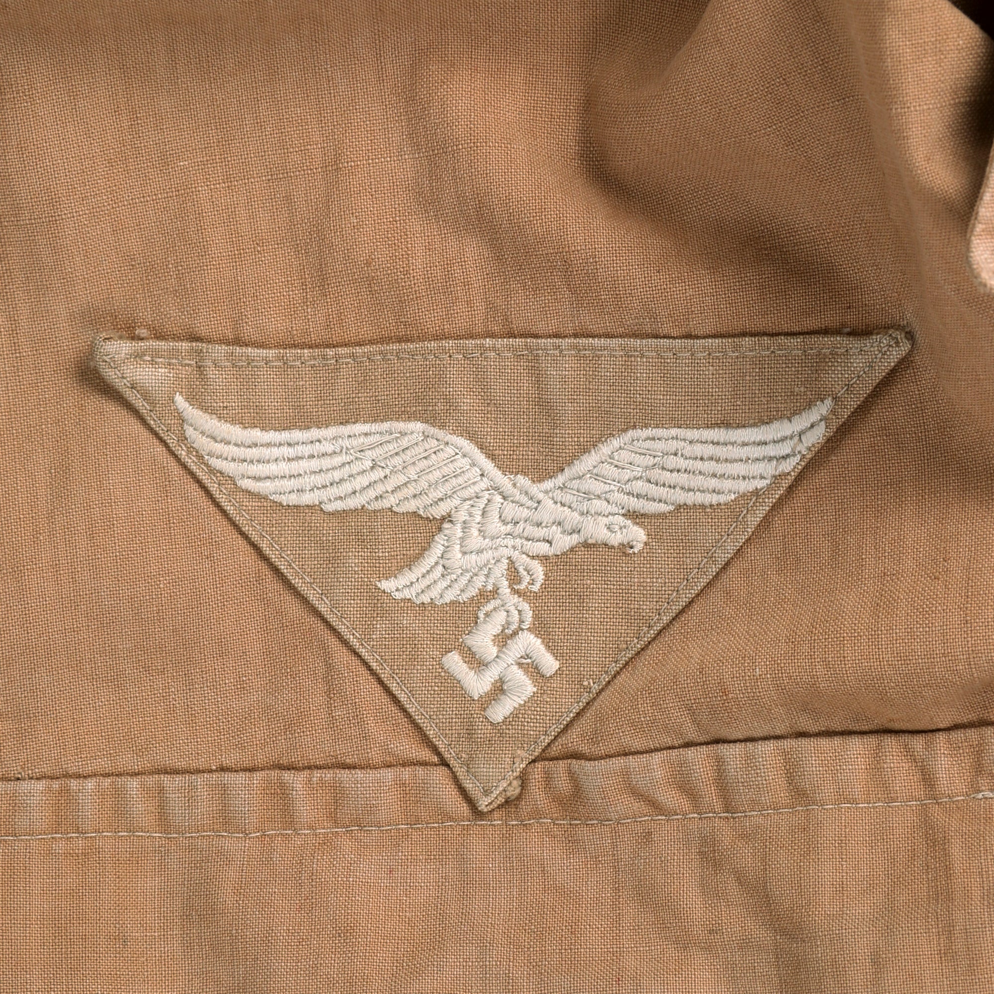 The shirt is adorned with the usual rank and branch insignia used on German Luftwaffe uniforms. The right chest has a lovely machine embroidered Luftwaffe eagle made from silver gray thread on a triangular tan background, which matches the color of the shirt perfectly. It is machine stitched to the shirt with the correct tan thread, and is 100% correct.