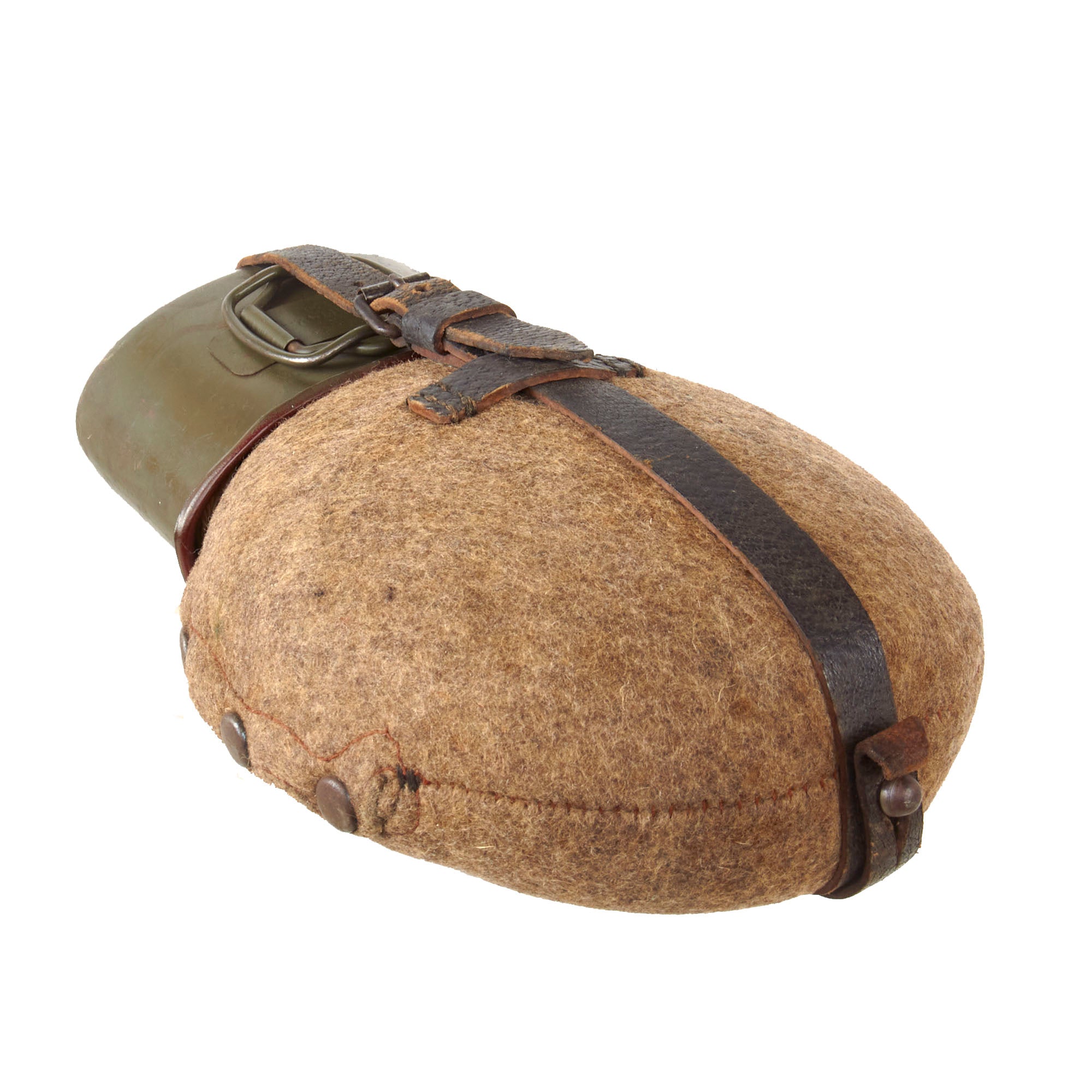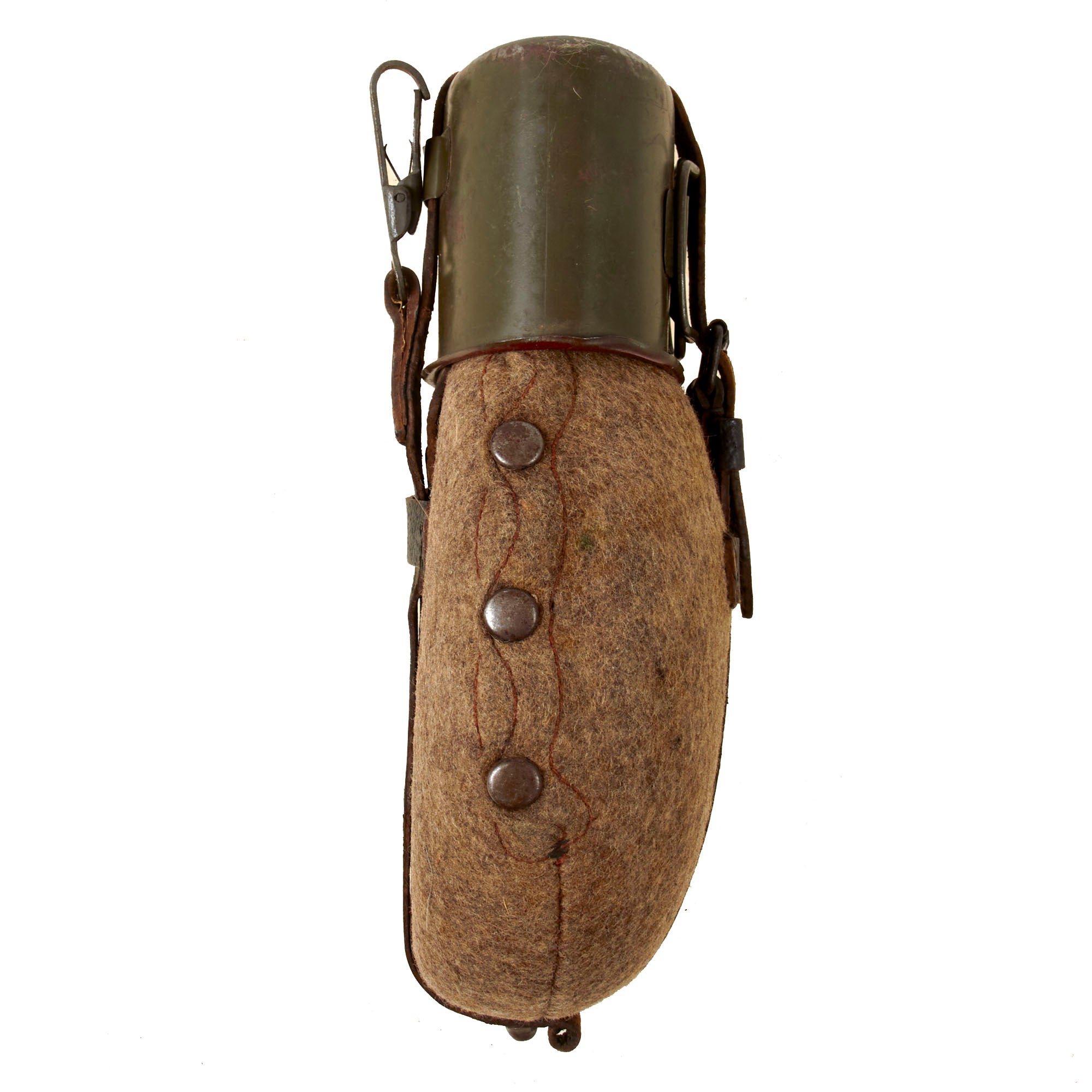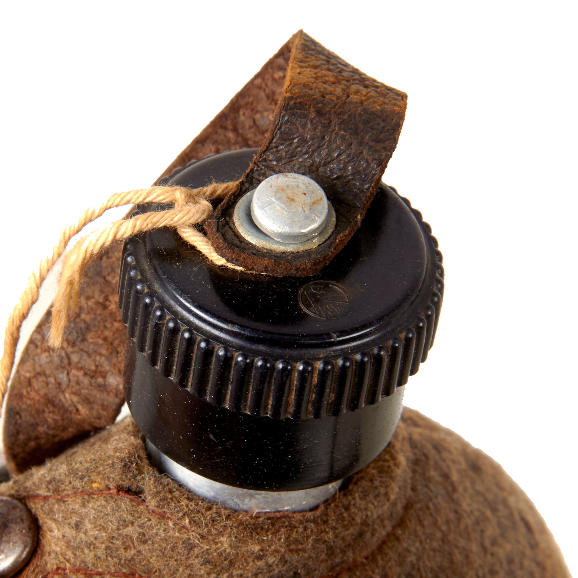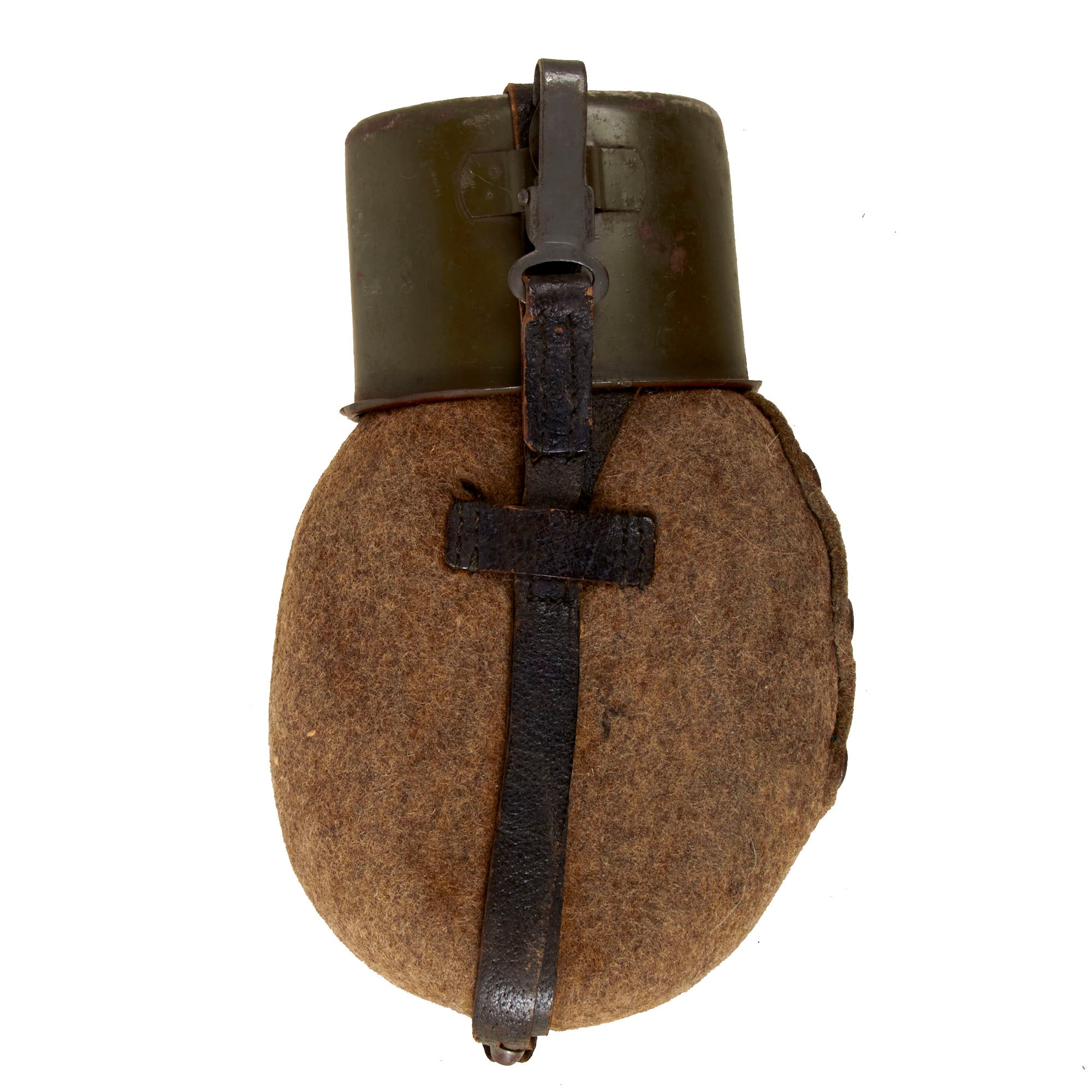 Original Item: Only One Available. This is a very nice example of a German WWII Issue M31 Feldflasche (Field Bottle) aluminum canteen water bottle rig, with all parts except for the bakelite cup, but there is an aluminum cup, so it displays as complete. It has the correct aluminum screw top cap, a genuine wool cover with unmarked snaps, and an aluminum cup. This is held together by the standard black leather belt harness, which has a painted steel belt hook on the back, for attaching to the combat rigging.