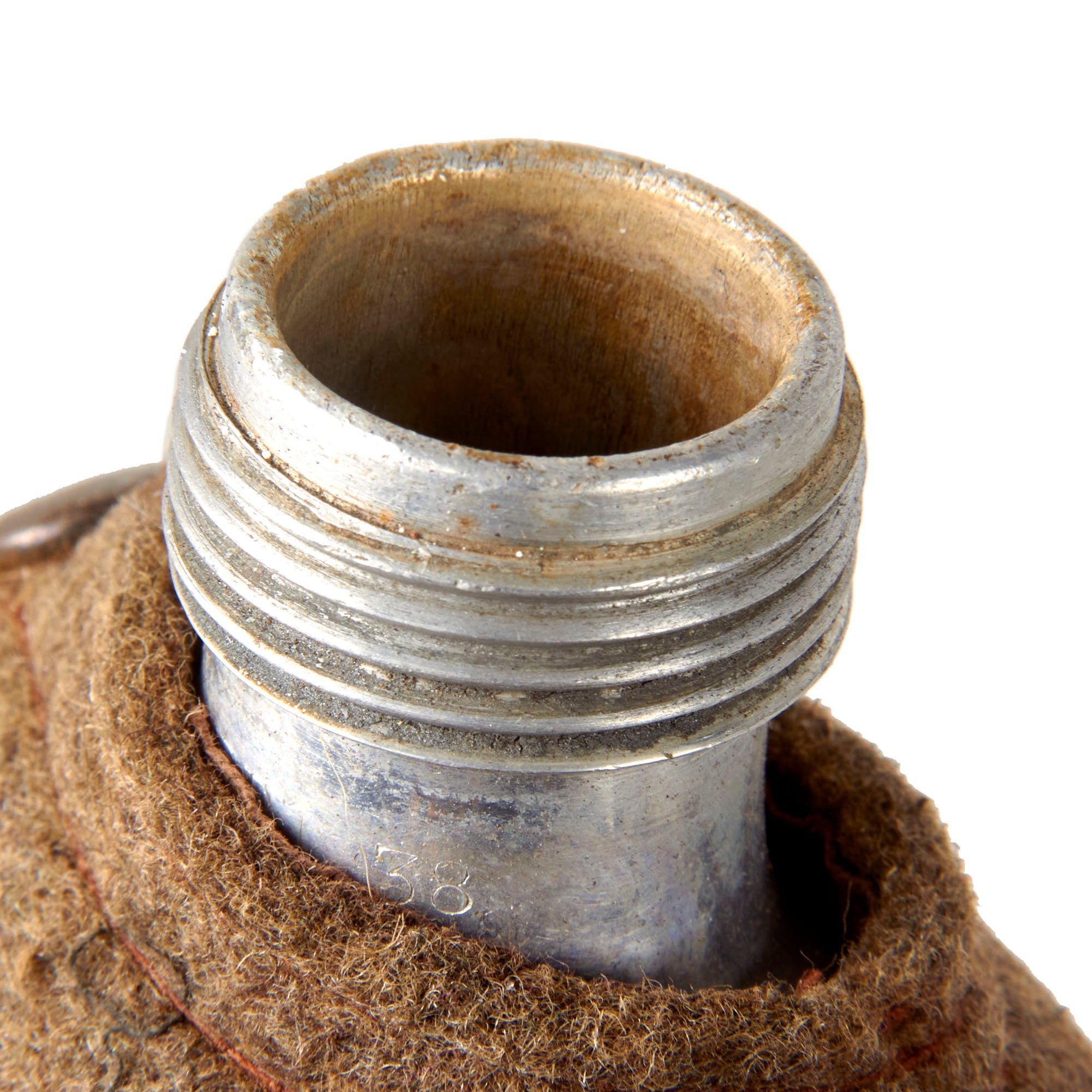 The maker’s stamp on the aluminum cup, MN42, is for the maker Metallindustrie GmbH. Neunkirchen-Saar (MENESA), and the 42 indicates production year, 1942. Canteen makers never switched to the three letter code system during the war, and continued to use abbreviations throughout the war. The aluminum top cap still has the sealing washer, though we cannot guarantee it still holds water.