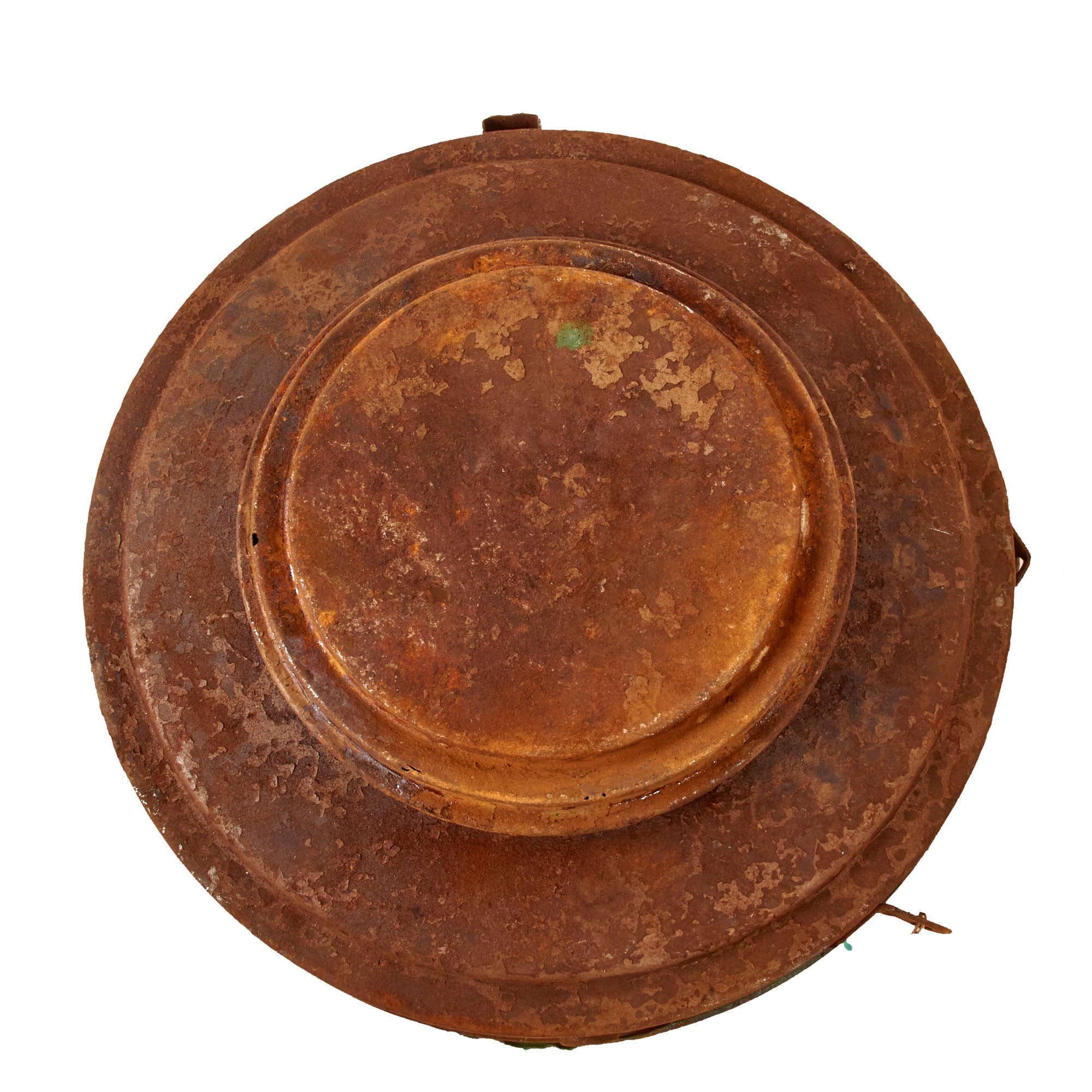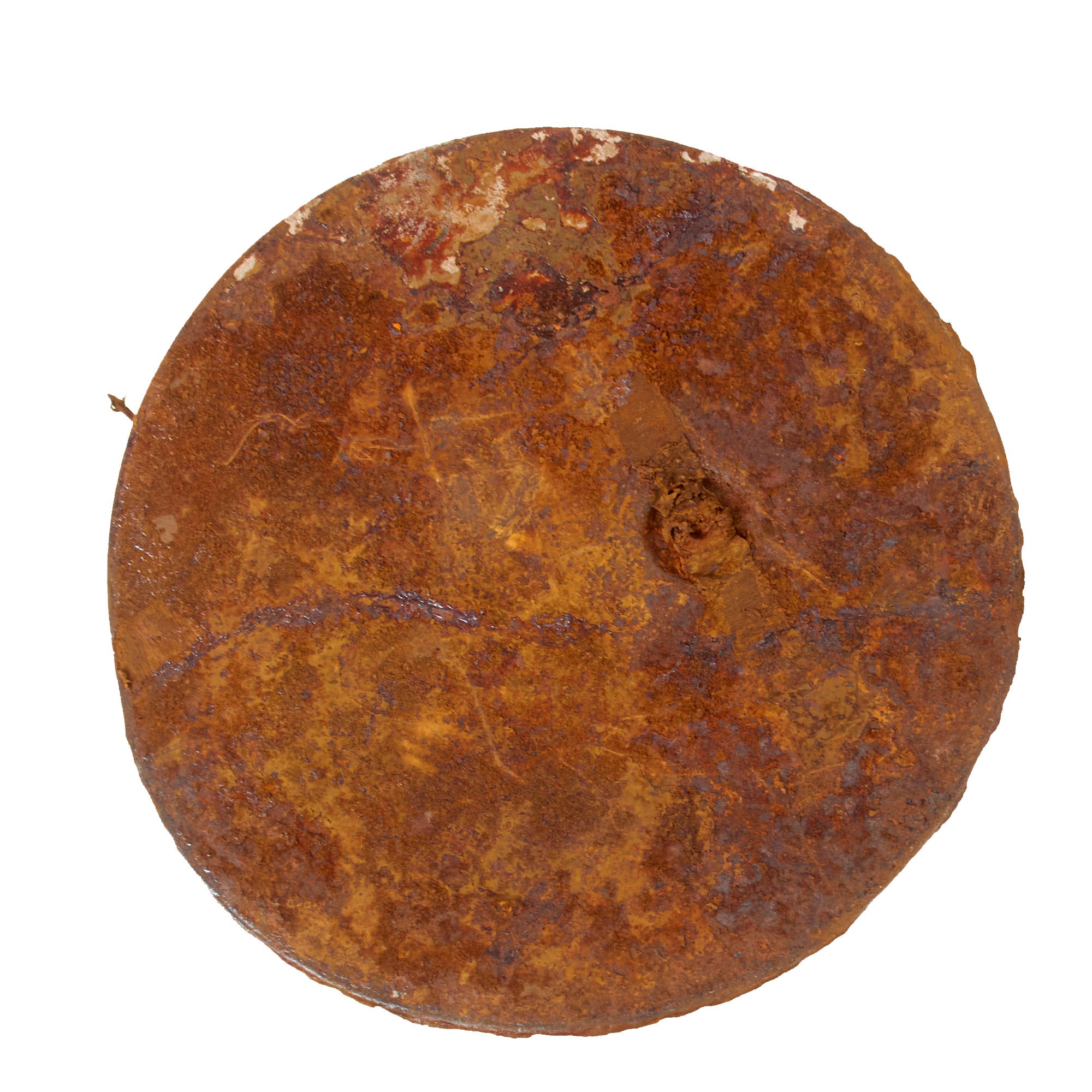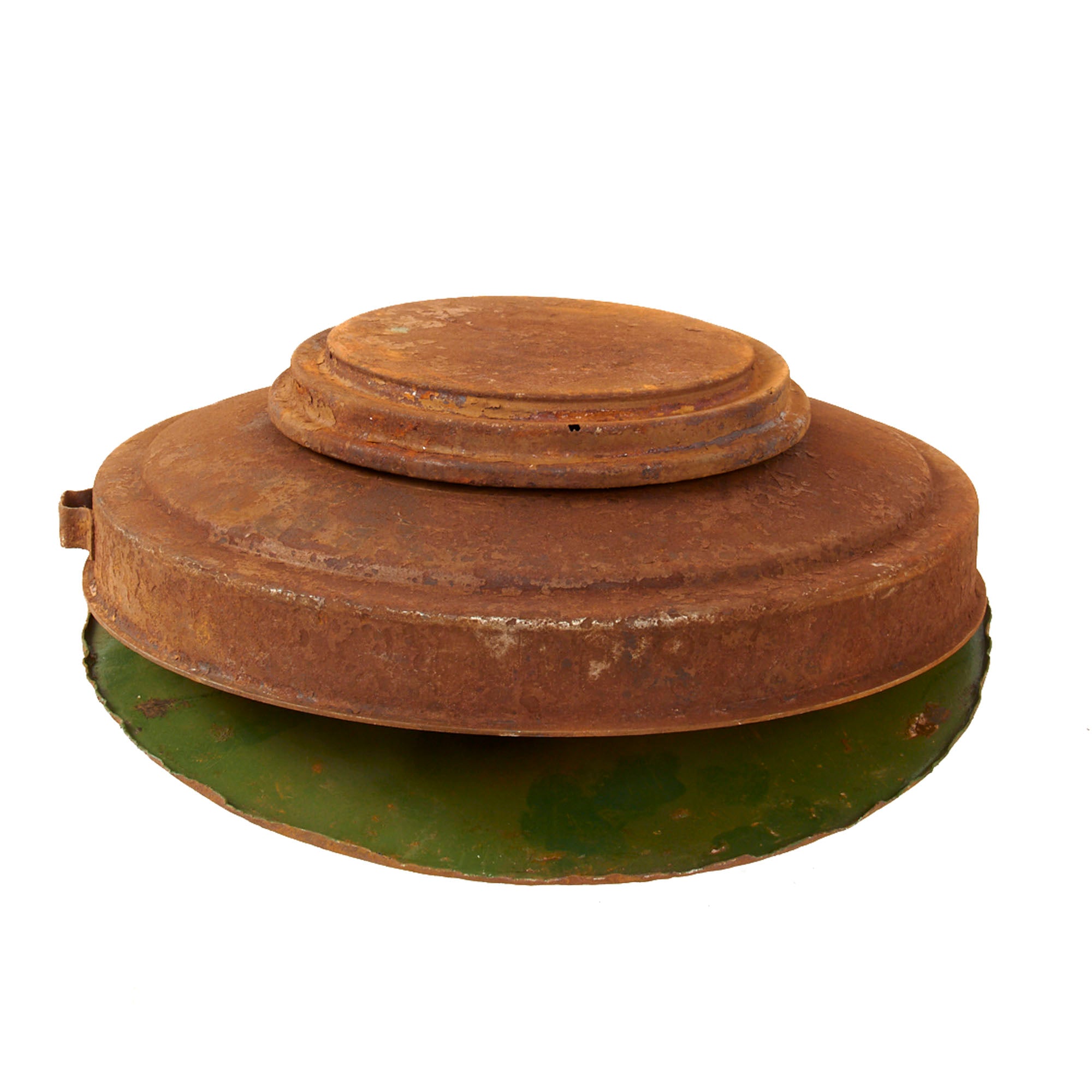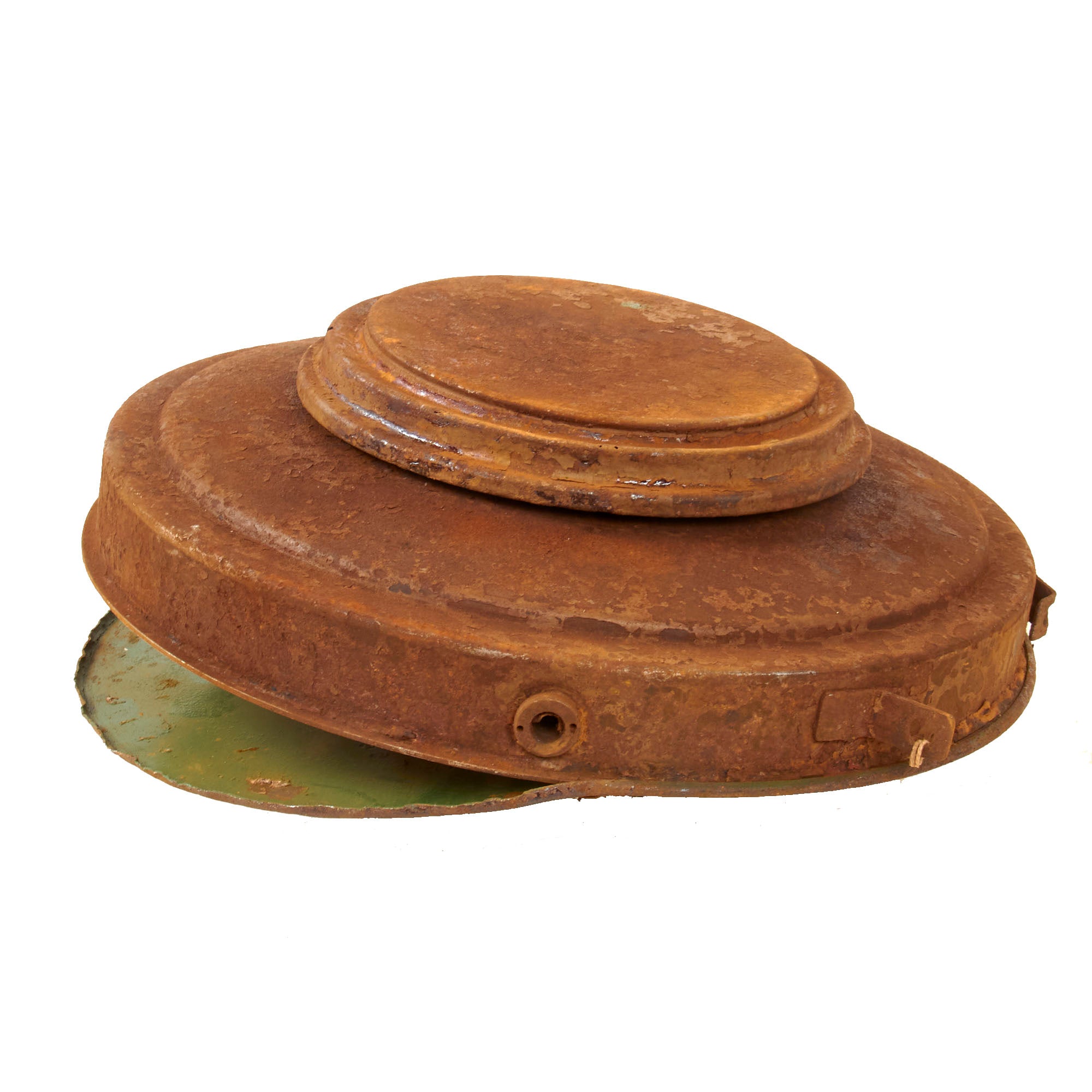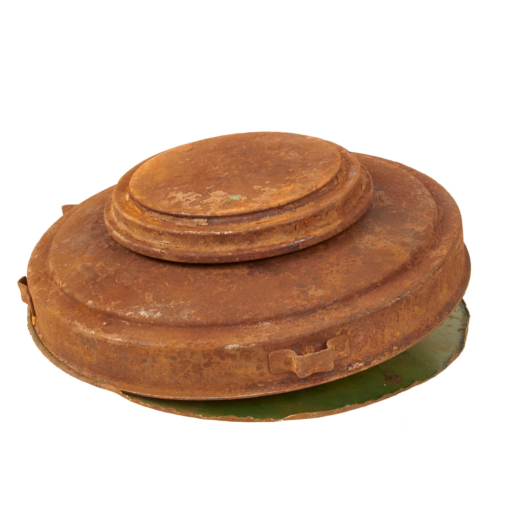 The mine definitely has the appearance of one dug up after the war, and the cop plate looks a bit crushed, so it is very possible that it was a failed detonation that was later dug up and fully disarmed. The top of the mine very faintly has the original T.-Mi.-Pilz. 43 / T marking present, while the second stencil that would note the type of detonator is no longer legible. The mine retains the original paint at about 10%, extreme surface oxidation where the paint is missing, and as noted previously the base plate is entirely detached, and the interior painted green. The handle is gone as is one of its mounts.