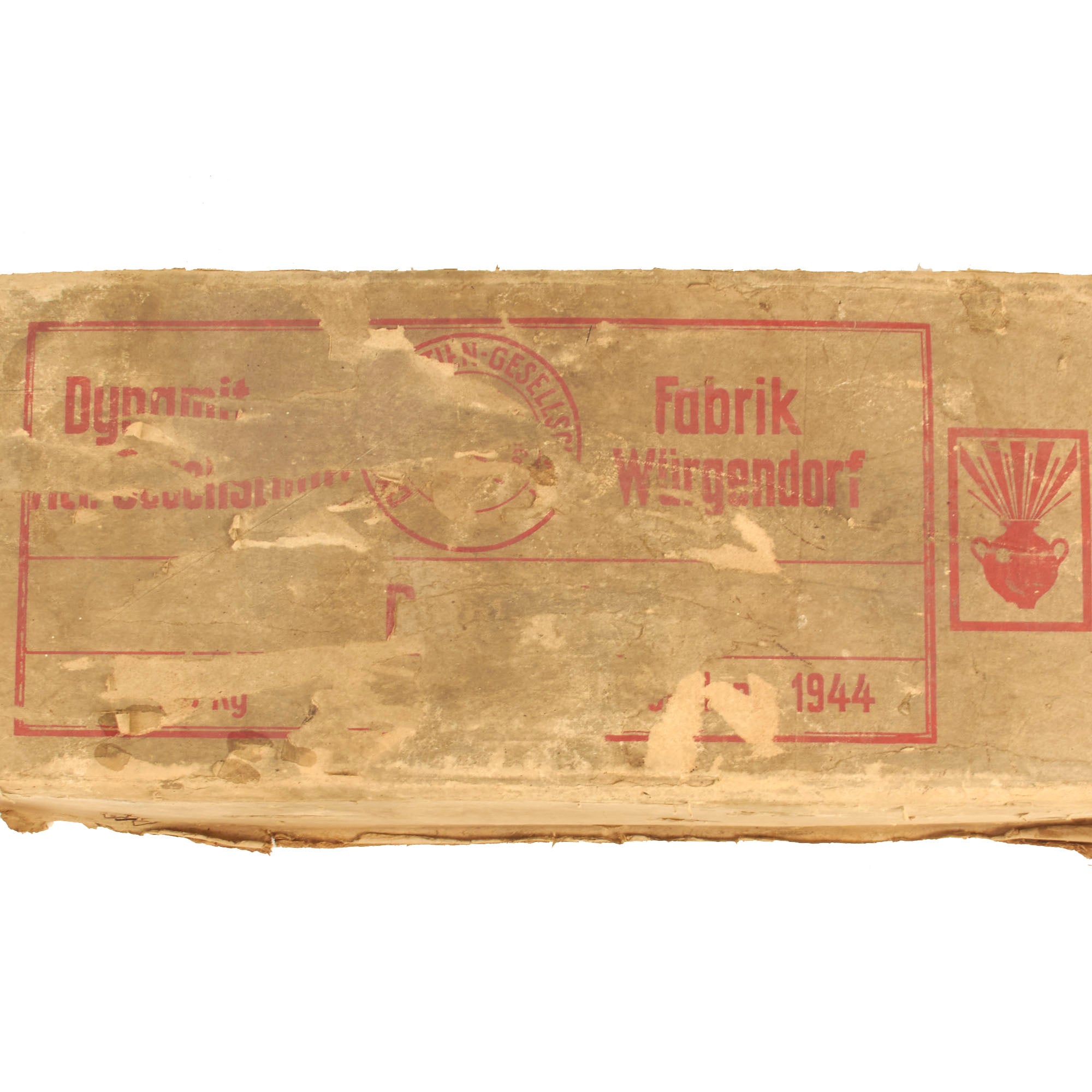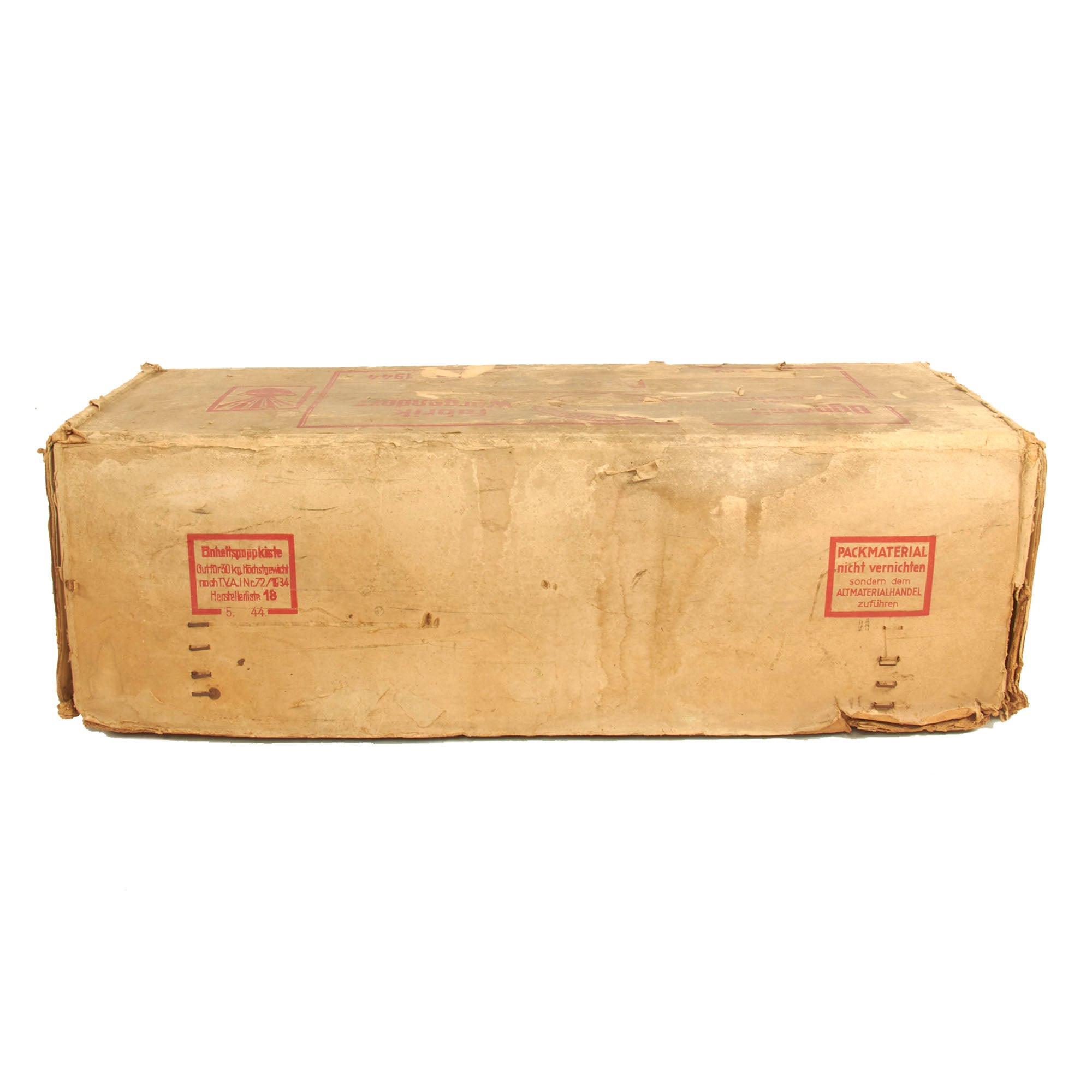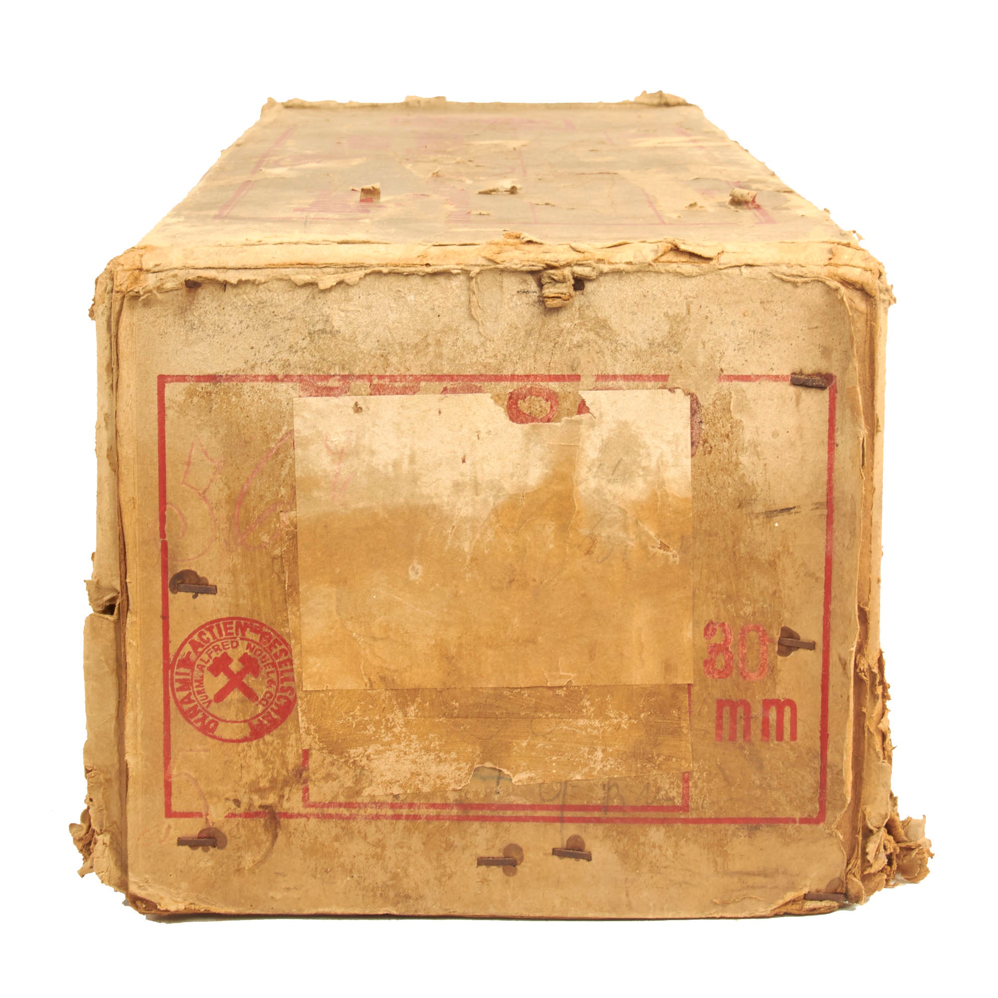 Original Item: Only One Available. This is a fantastic VERY hard to find Cardboard Crate for 30mm sticks of dynamite, marked 30mm on the side, and Dynamit on the top. The explosive had a wide variety of uses during the war, and was definitely needed in relatively large quantities. Cardboard does not hold up well to time and wear at all when compared to wooden crates, which is why these boxes are so hard to find. It measures 29 1/2" x 10 3/4" x 9 1/2", and definitely shows some wear to the exterior, which has unfortunately removed some of the original markings.