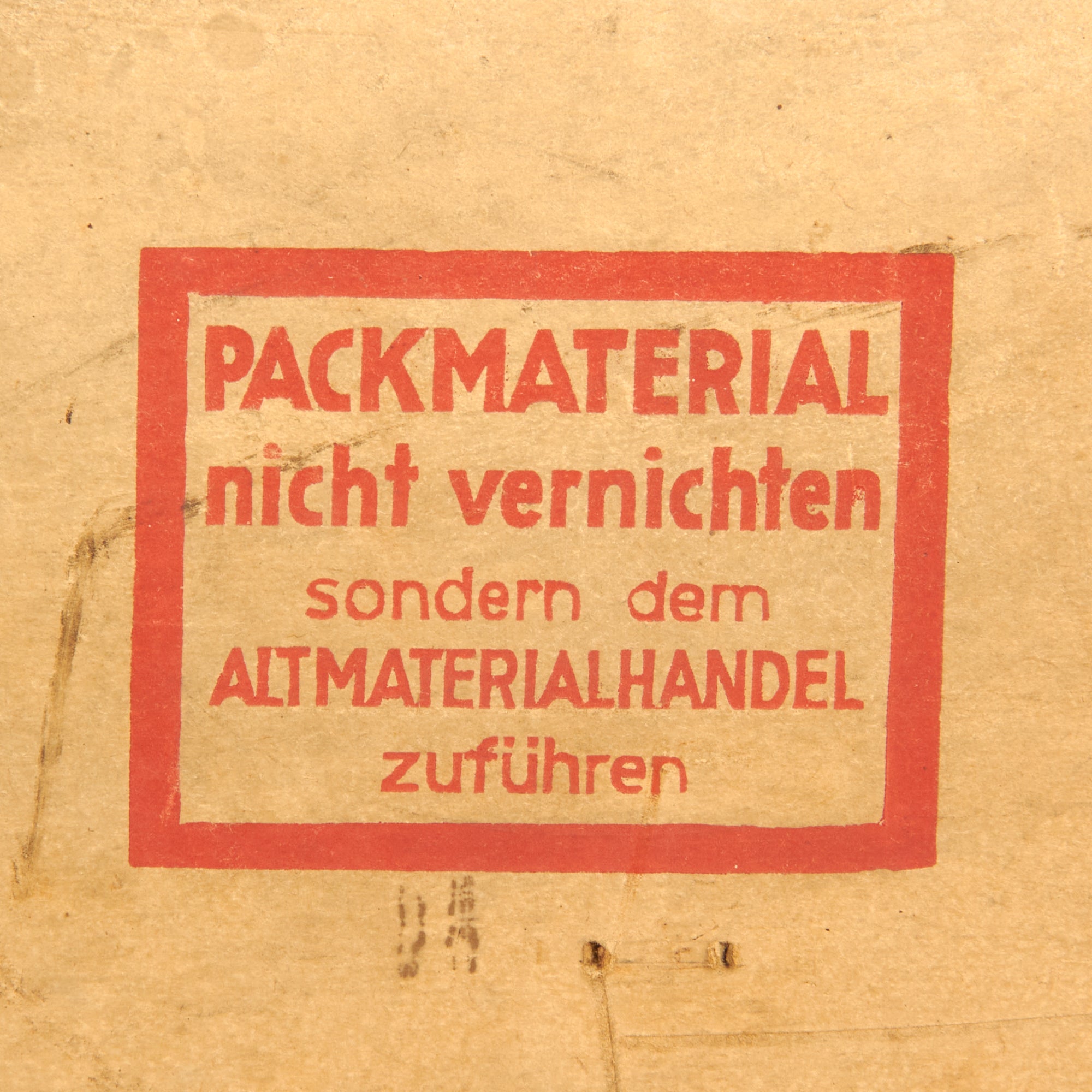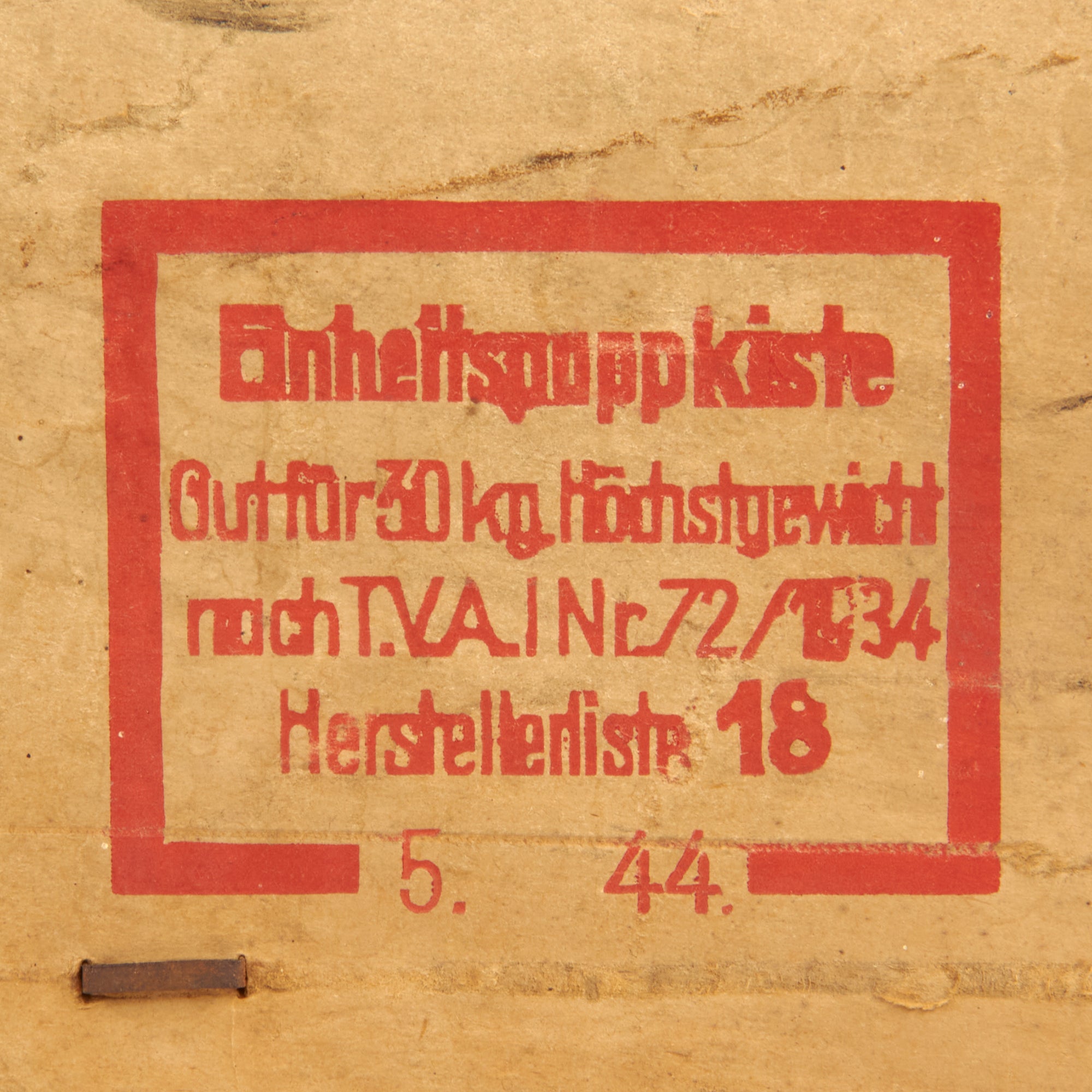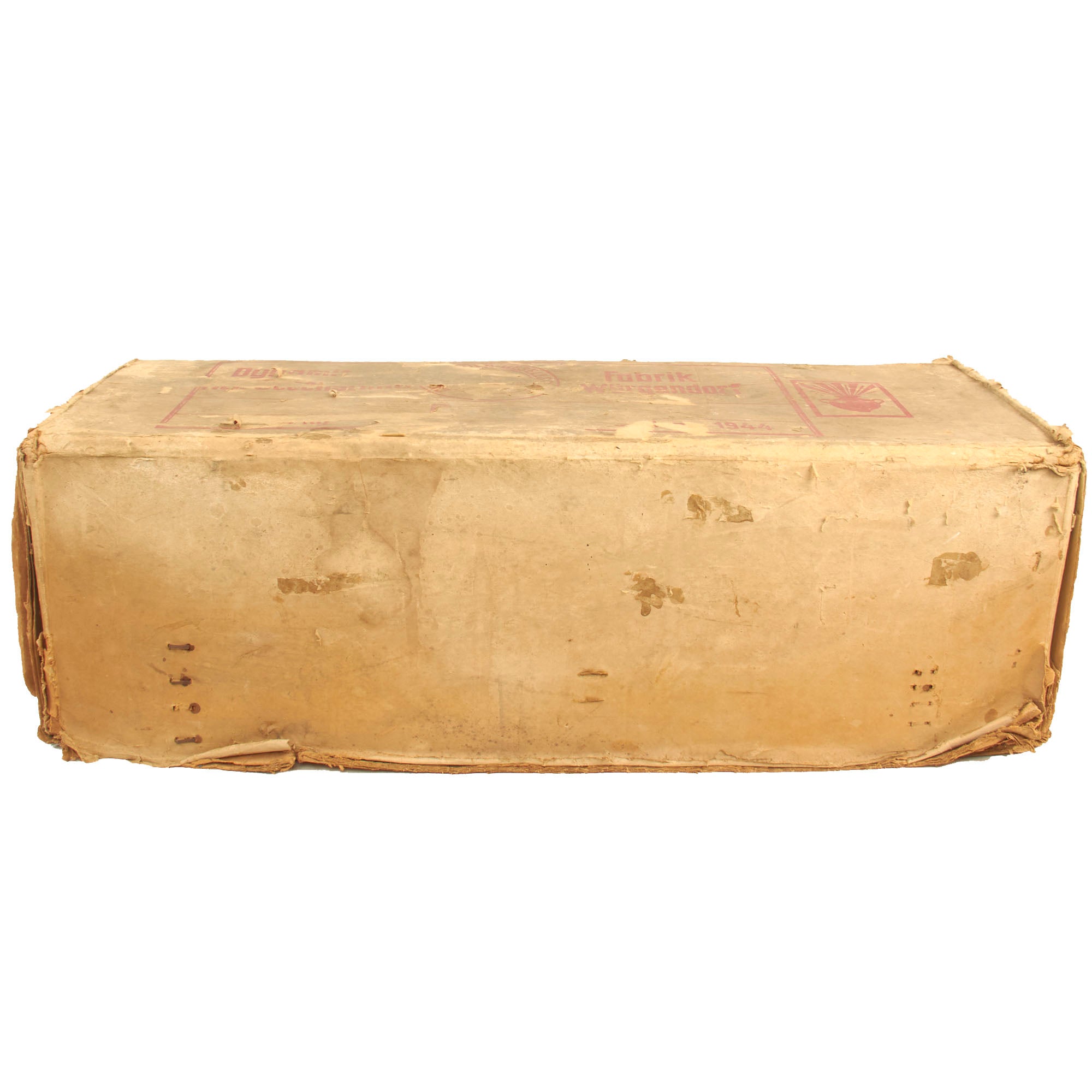 Original Item: Only One Available. This is a fantastic VERY hard to find Cardboard Crate for 30mm sticks of dynamite, marked 30mm on the side, and Dynamit on the top. The explosive had a wide variety of uses during the war, and was definitely needed in relatively large quantities. Cardboard does not hold up well to time and wear at all when compared to wooden crates, which is why these boxes are so hard to find. It measures 29 1/2" x 10 3/4" x 9 1/2", and definitely shows some wear to the exterior, which has unfortunately removed some of the original markings.