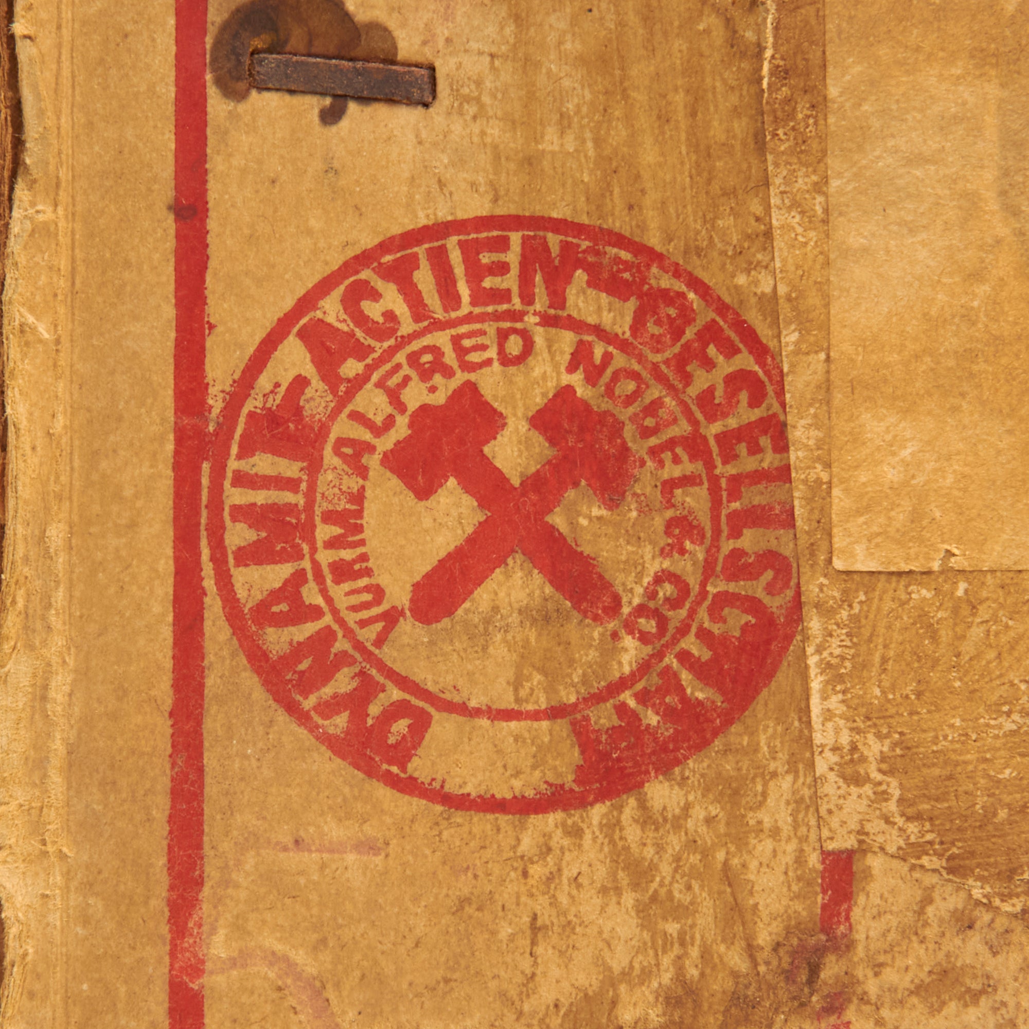We can however still see a clear manufacturer rondel marking on the side, indicating it was produced by DYNAMITE-ACTIEN-GESELLSCHAFT (Dynamite Stock Company), VORM. ALFRED NOBEL & CO. (Formerly Afred Nobel & Co.), one of the companies founded by the inventor of Dynamite, Alfred Nobel. The top of the box indicates it was made at the factory in Würgendorf, Germany, and also has a clear 1944 date. The side of the lid has additional packing information on the back, giving a more precise date of 5 44 (May 1944.