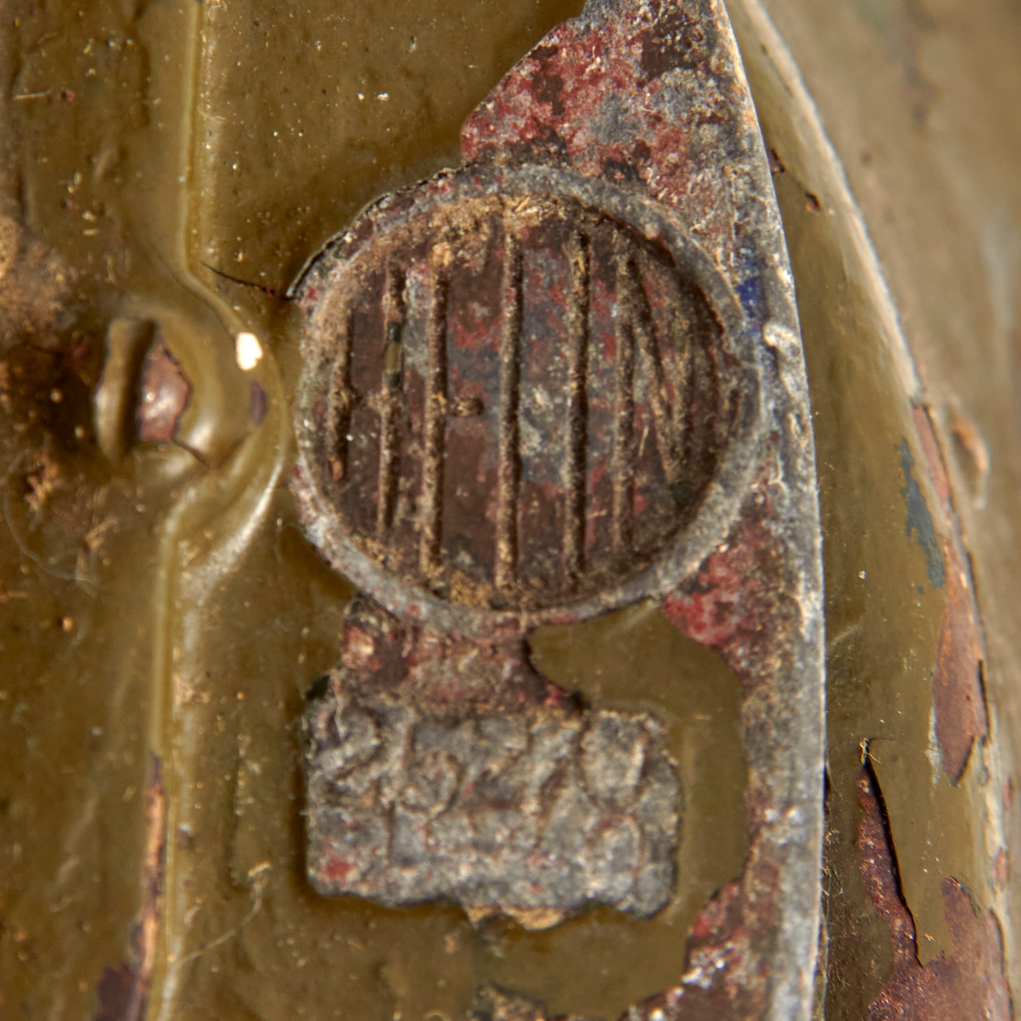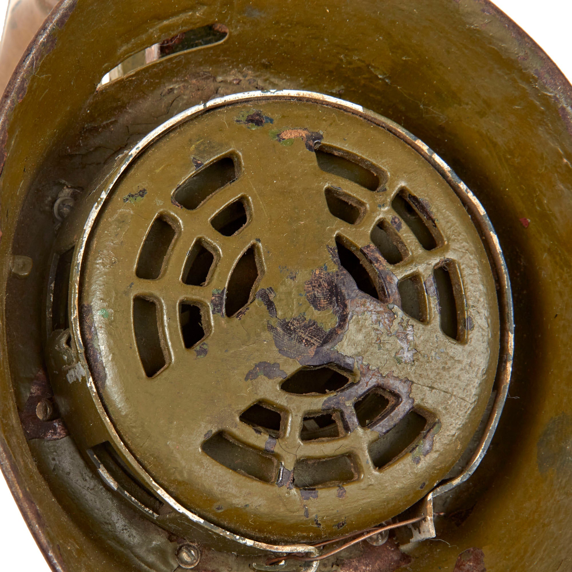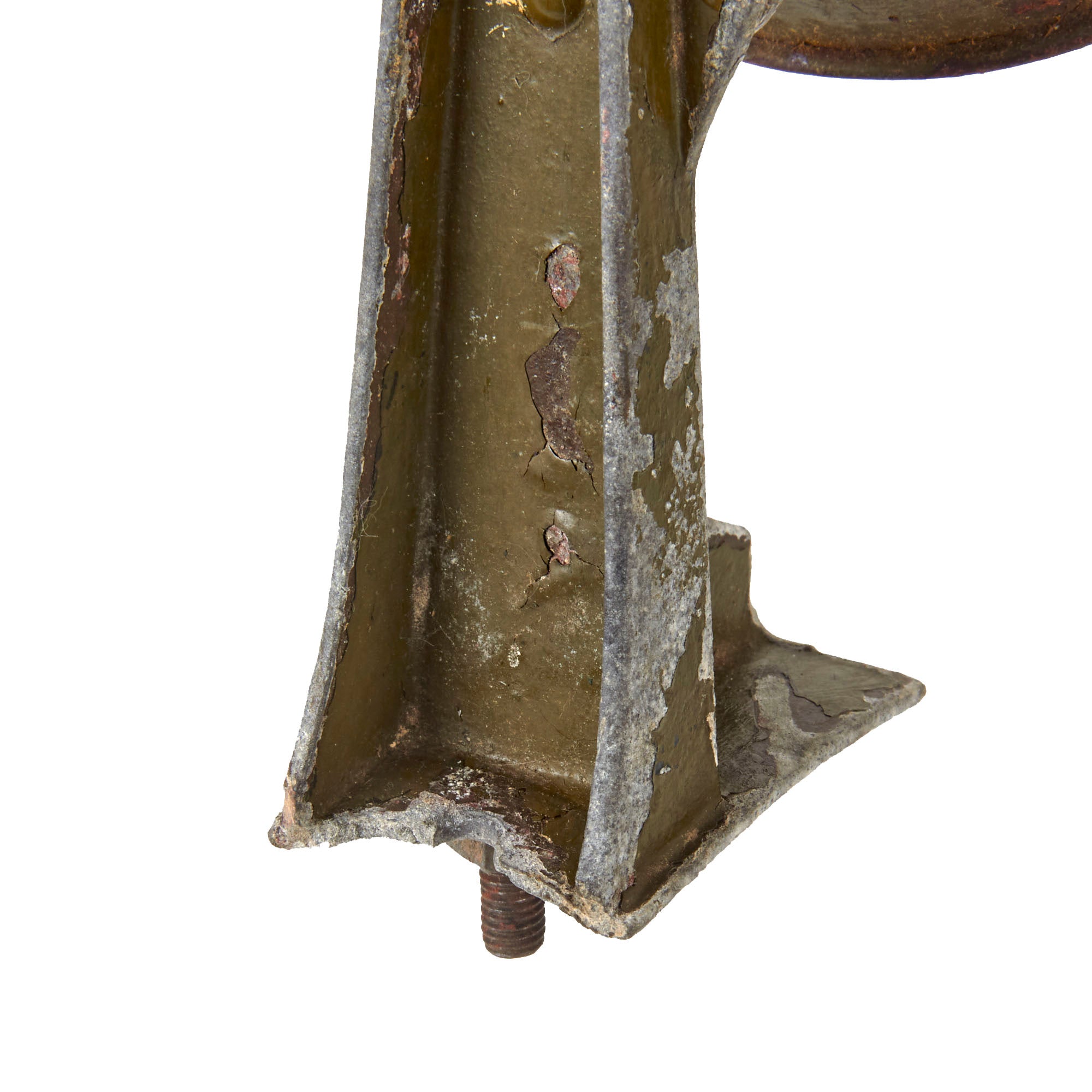 The sound damper is broken on this example and needs to be moved by hand, with a piece of wire holding it in place. There is heavy oxidation to the steel "horn" and aluminum body, as well as some paint loss. There is also heavy deformation to the siren "dish" or horn around the main body.