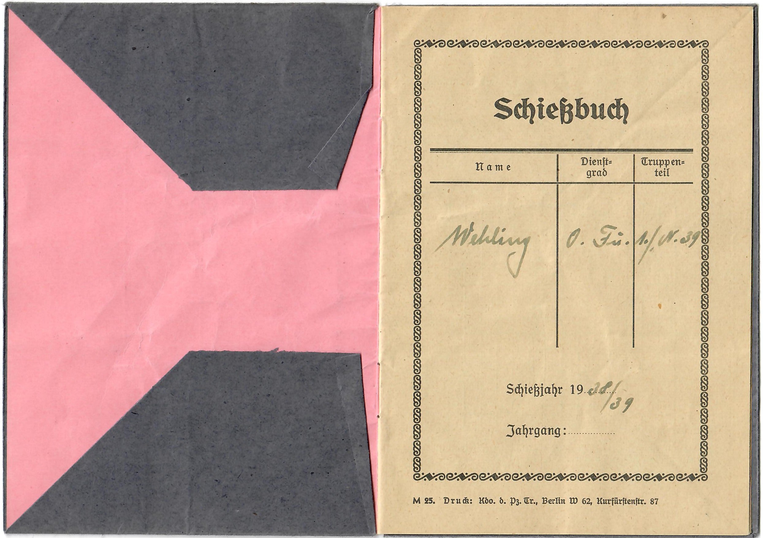 - Wehling's Schießbuch (Shooting Qualification Book), for the years 38/39. Of interest is that the original pink cover had a blue cover folded over it, which gives his rank on the cover as: