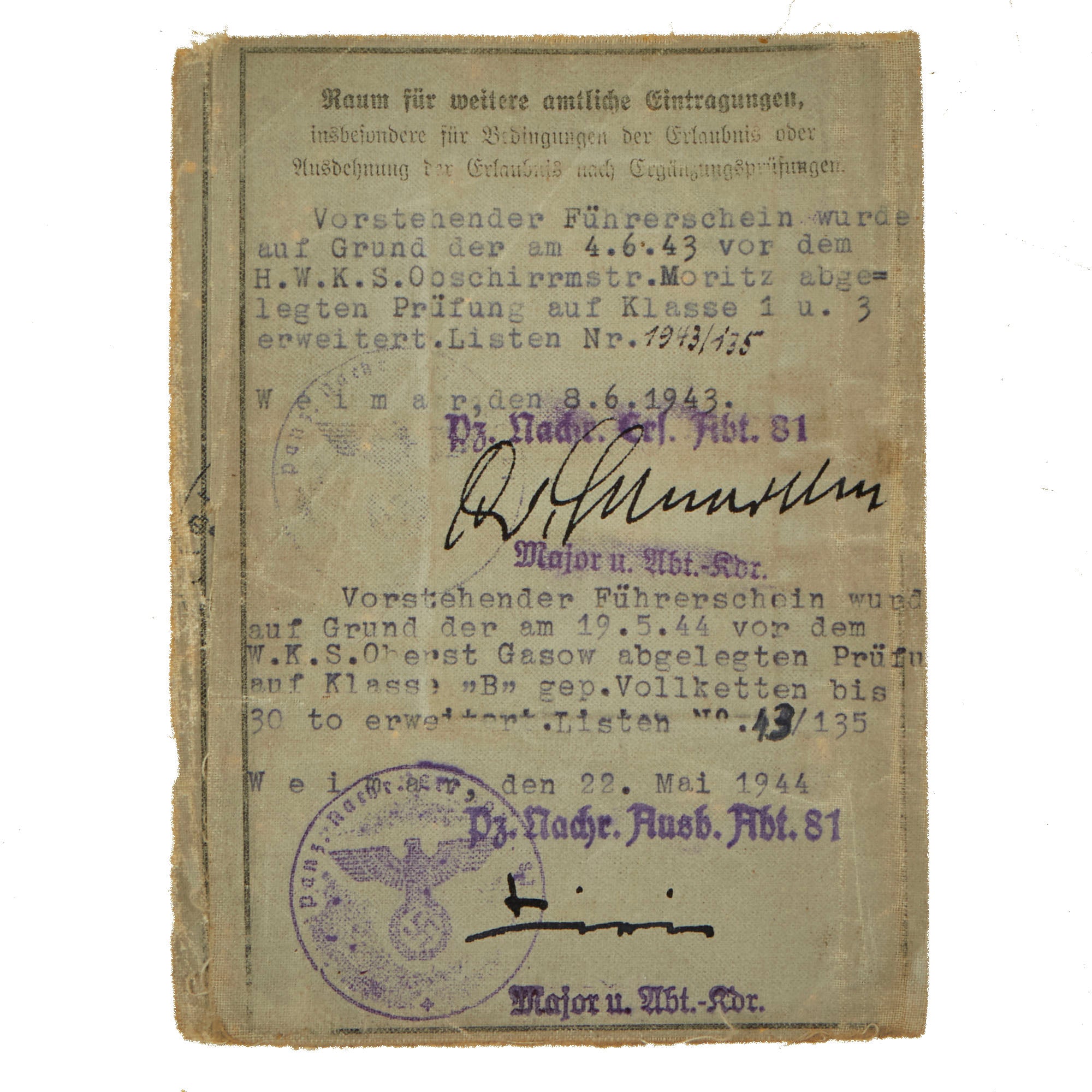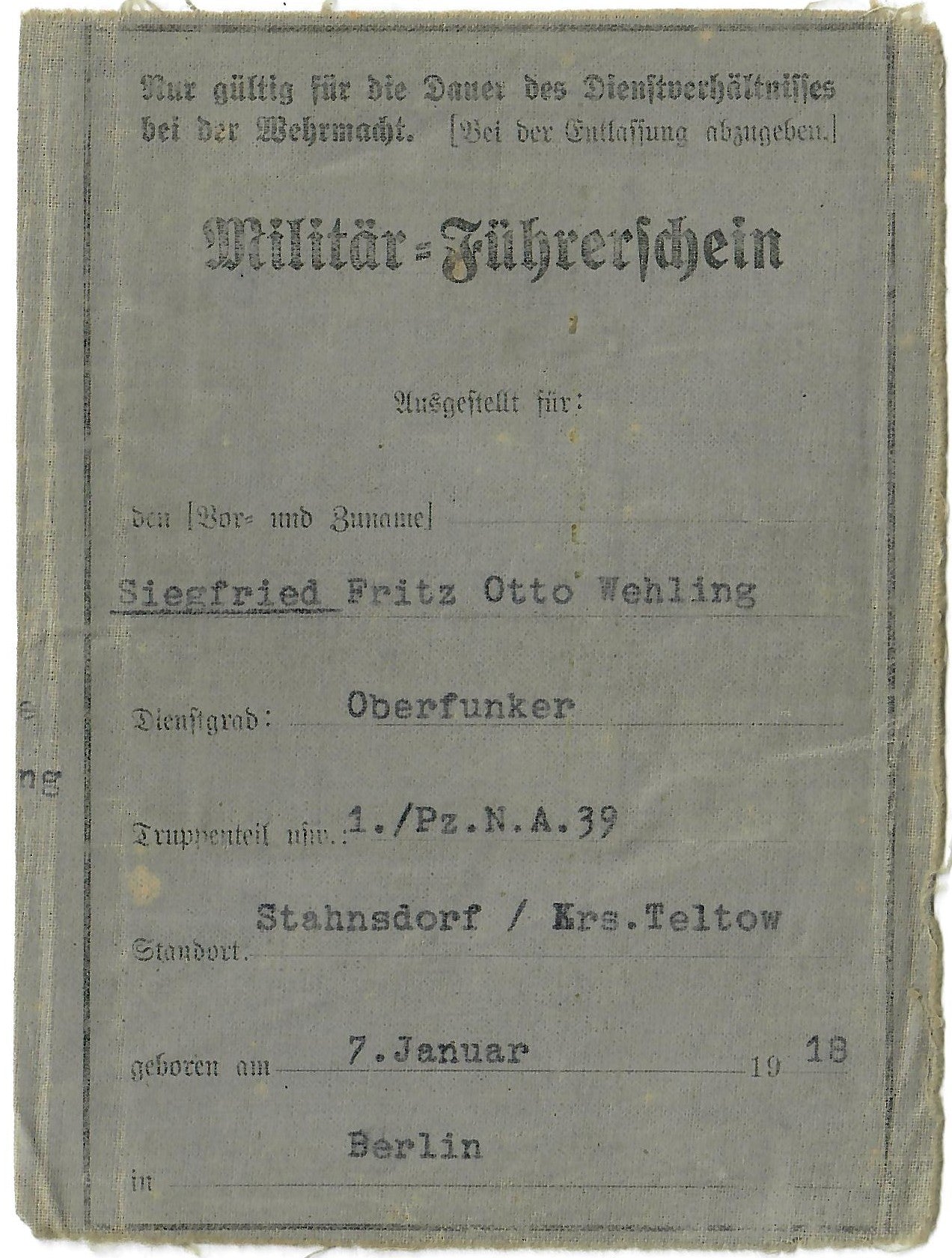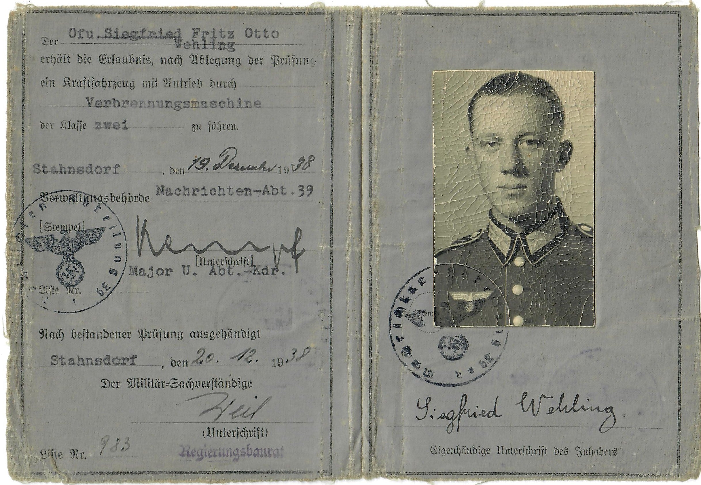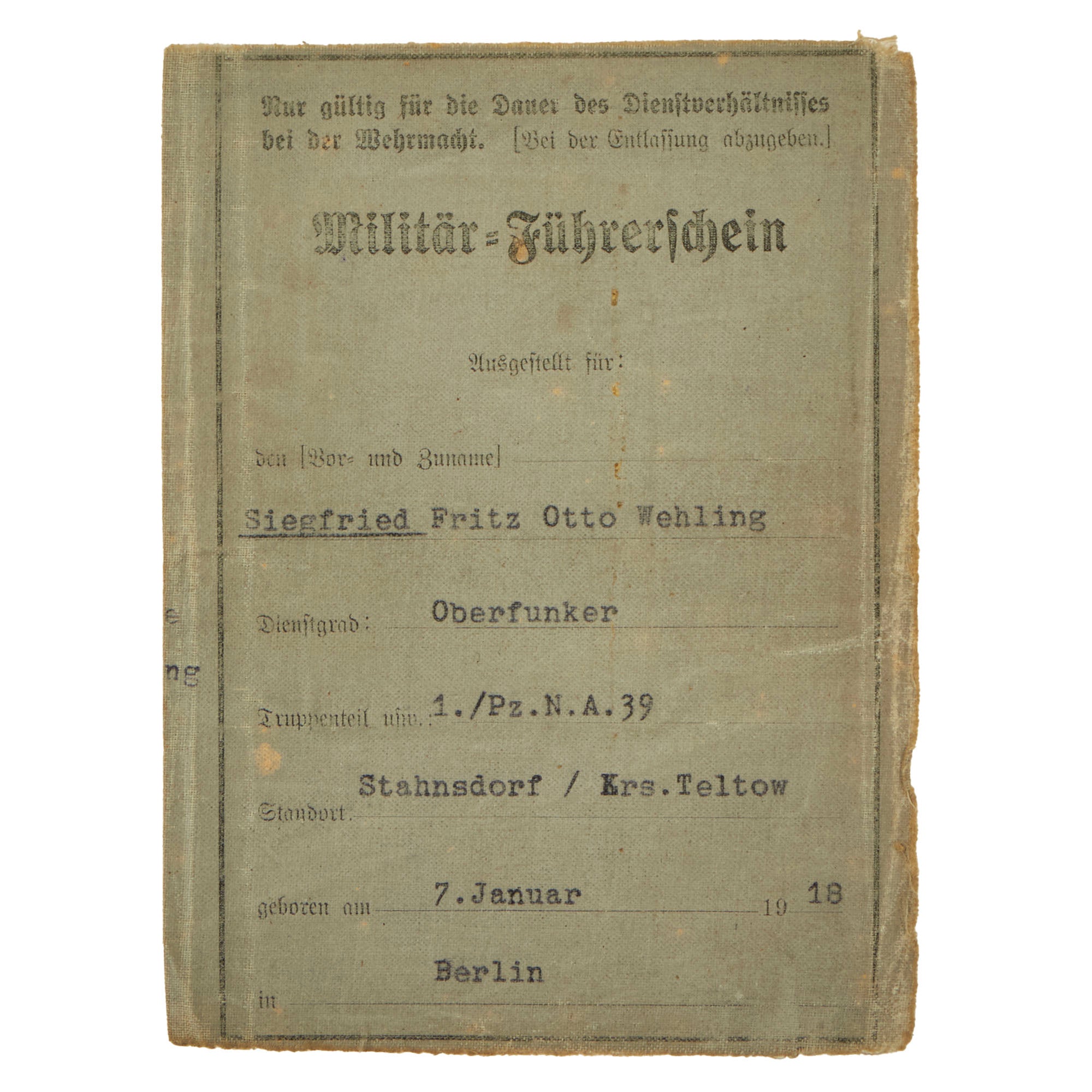 - Wehling's Militär=Führerſchein (Military Drivers License), issued 20. 12. 1938, when he was a member of 1. / Pz. N. A. 39. It indicates that he is qualified to drive Verbrennungsmaschine, or combustion engine vehicles. It has all the correct the correct issue stamps and signatures, and is made from gray oilcloth type material.