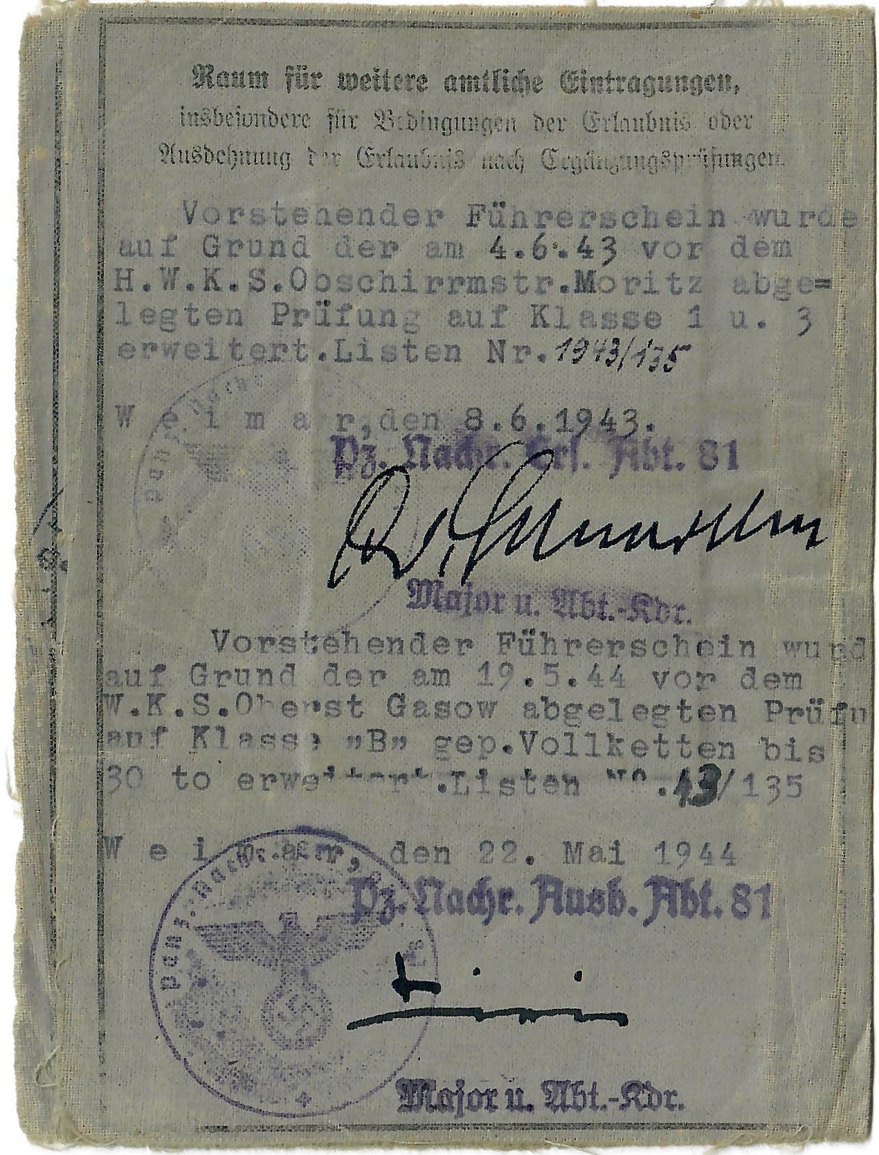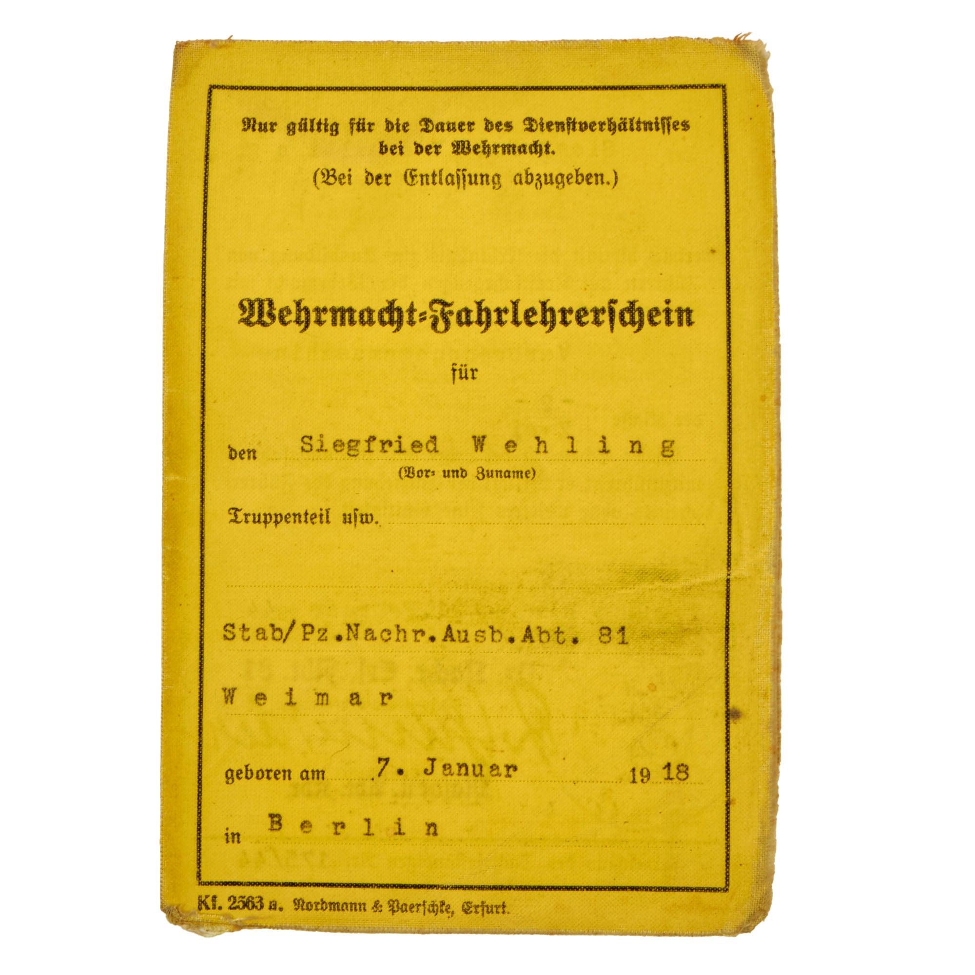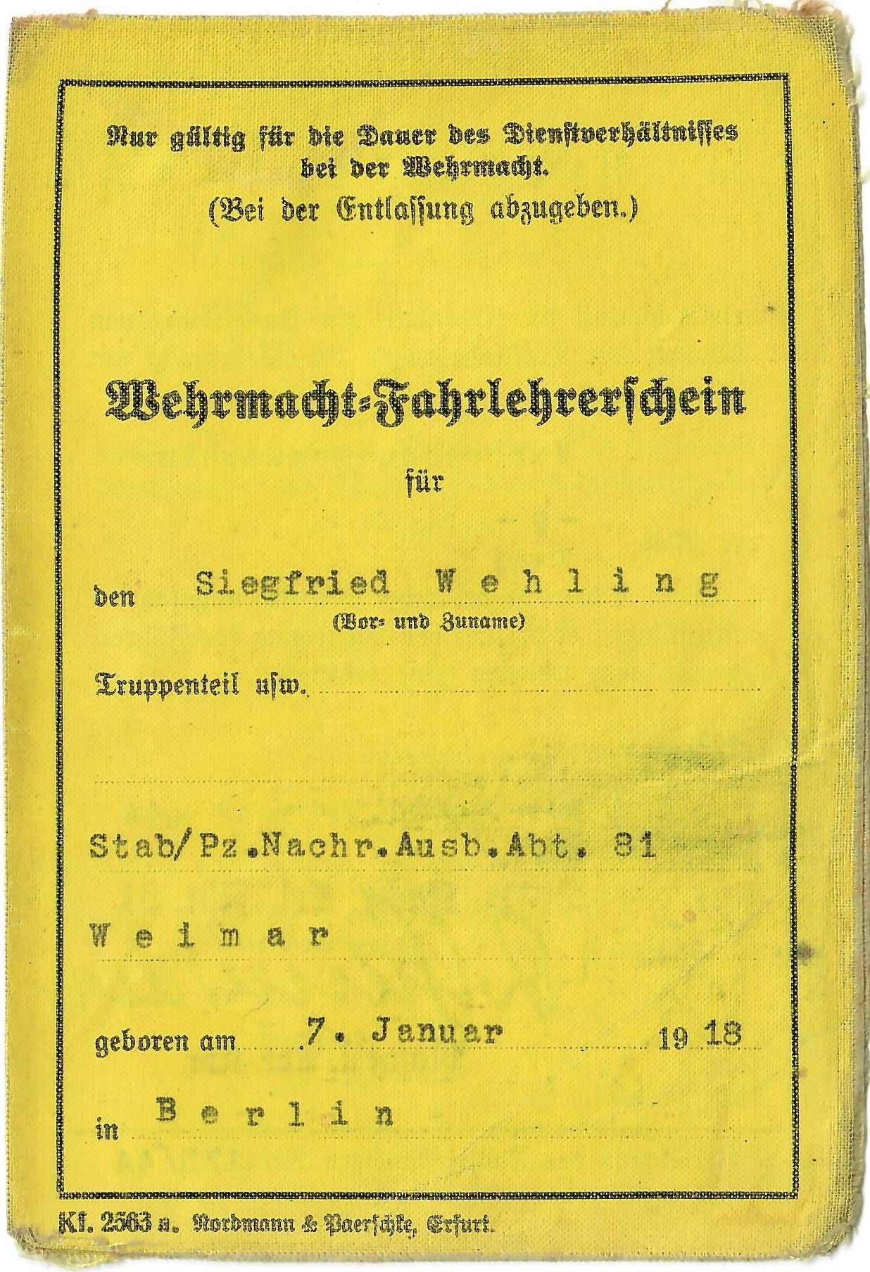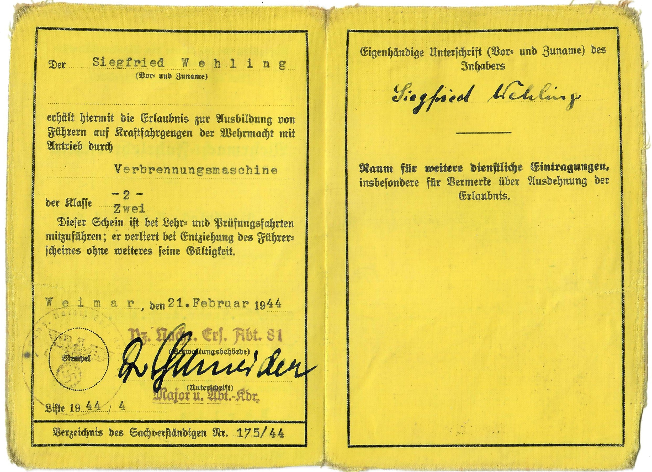 - Wehling's Wehrmacht=Fahrlehrerſchein (Armed Forces Driving Instructor's License), issued 21. Februar 1944. It indicates that he is qualified to instruct others in the driving of Verbrennungsmaschine, or combustion engine vehicles. It has all the correct the correct issue stamps and signatures, and is made from yellow oilcloth type material.