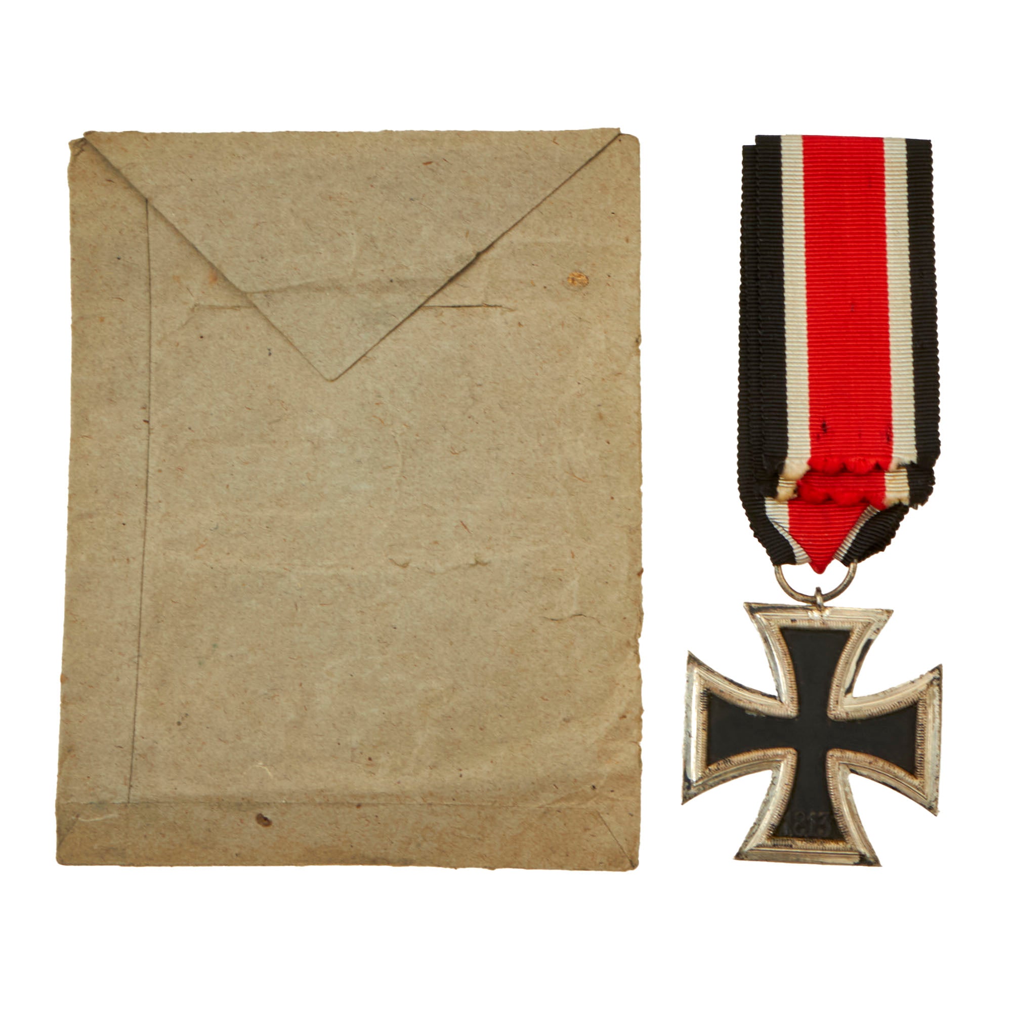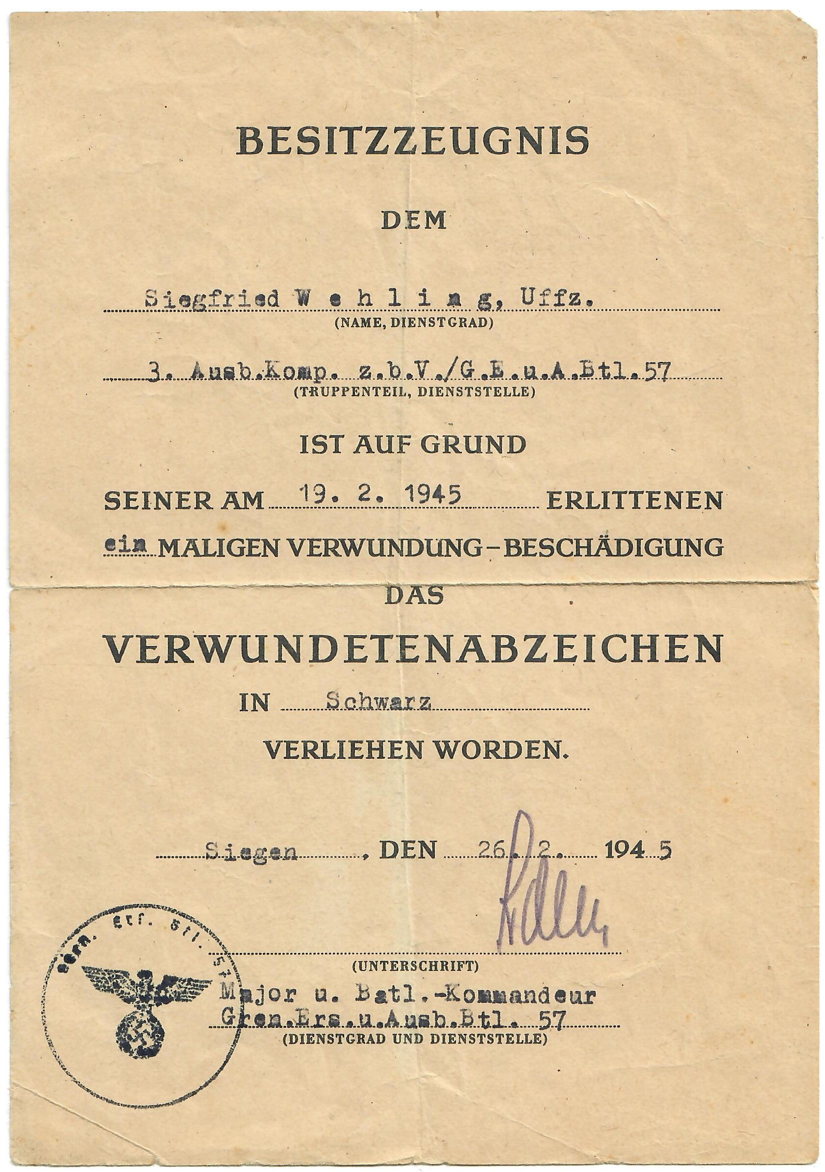 Of particularly interest is that the item with the latest date we have is the BESITZZEUGNIS possession certificate for a VERWUNDABZEICHAN IN Schwarz (Black Wound Badge), dated 26. 2. 1945. It indicates that he was a member of 3. Ausb. Komp. z.b.V. / G. E. u. A. Btl. 57, which was part of Grenadier Regiment 57. This unit was part of the reconstituted 9. Volksgrenadier-Division, which took part in the Battle of the Bulge during late WWII, meaning there is a very good chance that Wehling took part! The Wound Badge is not included, but there is a very nice Iron Cross 2nd Class 1939 included, complete with its original ribbon and blue issue packet.