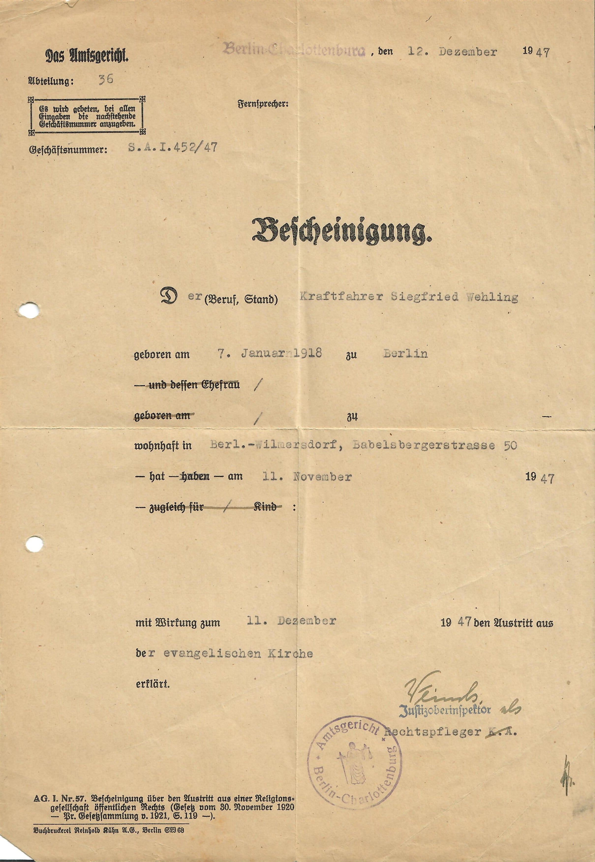 The last item in this set is a Beſcheinigung (Certification) dated 12. Dezember 1947, stamped at the bottom by the Amtsgericht (District Court) of Berlin-Charlottenburg, which we assume is Wehling's discharge from post war internment.
