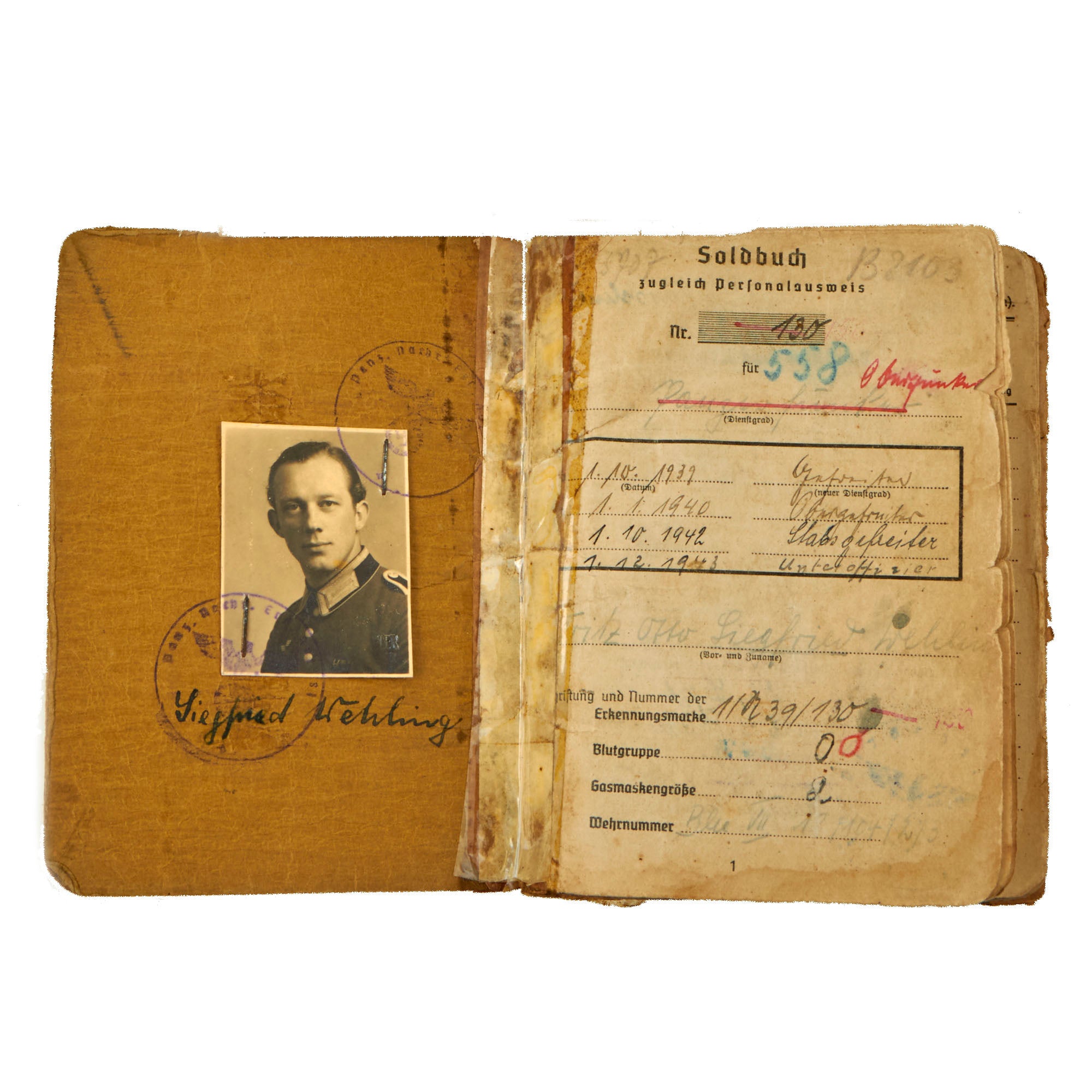 - Wehling's Heer Army Soldbuch zugleich Personalausweis (Paybook and identity card), which is definitely well worn, held together with both paper and plastic tape. Issued 23. Sept 1938, it indicates his rank progression on Page 1, and the other pages of the book give details about his service. It does look like he was injured during his service, and spent a significant amount of time recuperating after his injury. There is also mention of the book of him being assigned to the Grenadier Regiment mentioned previously.