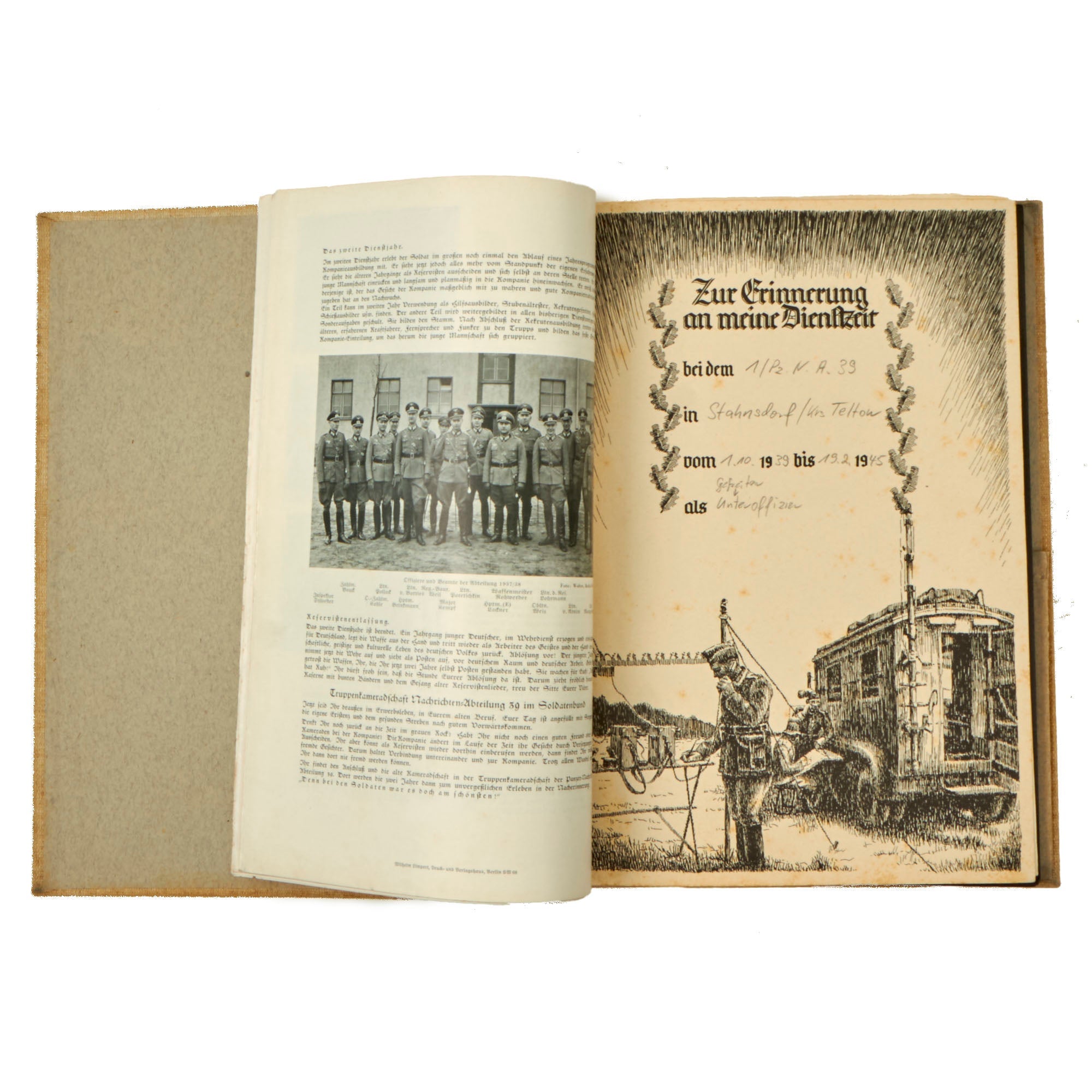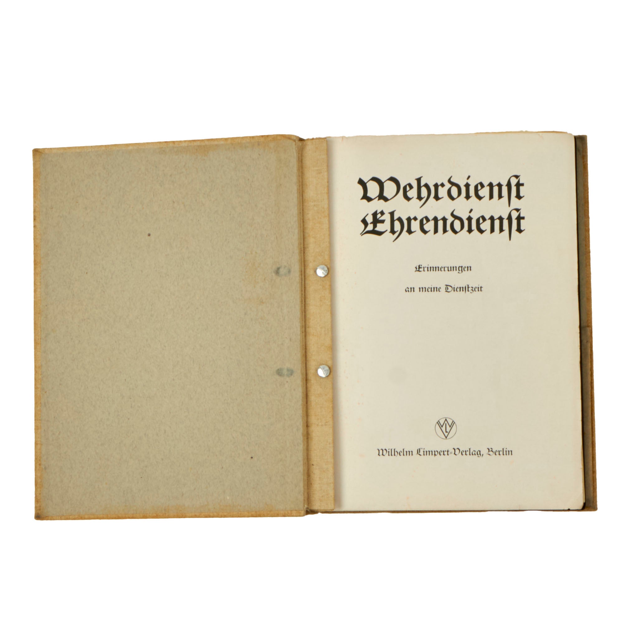The centerpiece of this set is really Wehling's photo album, which is a military issued type, which has the German Reichskriegsflagge Battle standard on the front, with Wehrdienſt-Ehrendienſt ("Military Service & Honorary Service") over Erinnerungen an meine Dienſtzeit ("memories of my service). These are common phrases used on German military photo albums, and this example was published by Wilhelm Limpert-Verlag in Berlin, measuring about 8 3/4" x 12" with a 1 1/4" spine. The first pages start with pictures of important NSDAP figures and Generals, followed by a history of Germany and its armed forces.