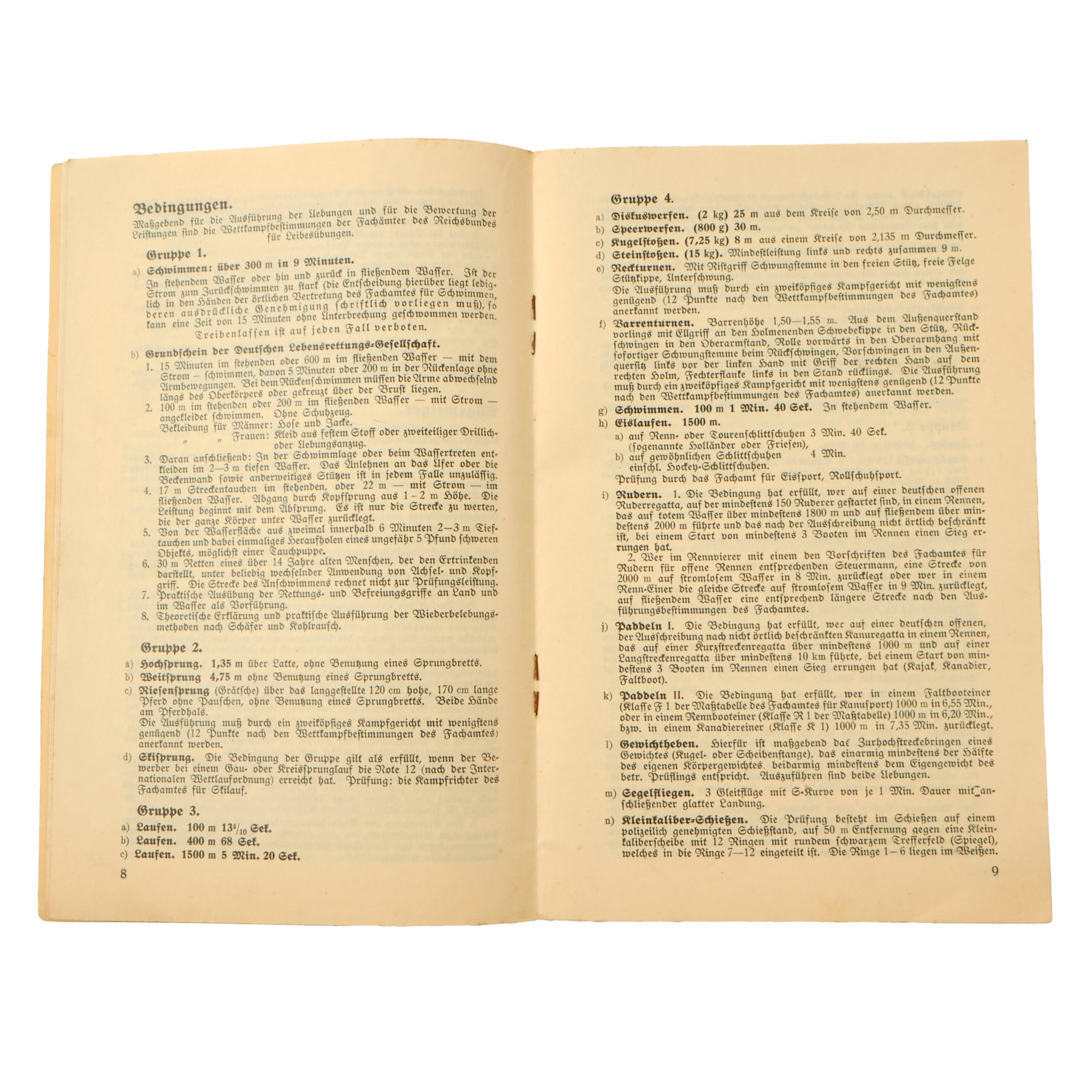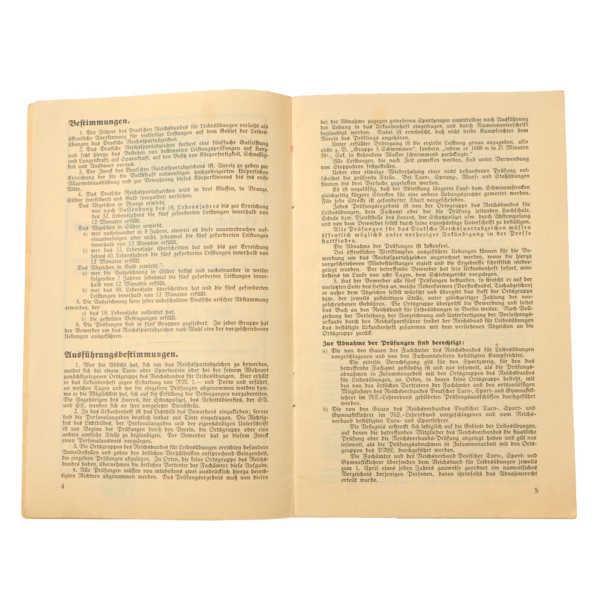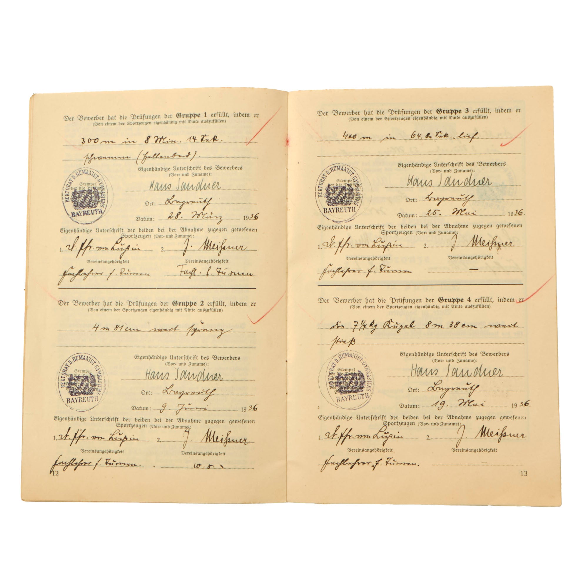 Original Item: One of a Kind. This is a great identification and record pamphlet / book from the German National League for Physical Exercise (Deustcher Reichsbund für Leibesübungen - DRL). After the 1938 annexation of Austria, the group would be renamed the National Socialist League of the Reich for Physical Exercise (German: Nationalsozialistischer Reichsbund für Leibesübungen, abbreviated NSRL). The booklet measures 5 3/8" x 8 5/8", and is embossed on the front with the design of the DRL sports badge. The first page is blank, with page 2 showing a picture of the owner Hans Landner, along with stamps from BAYREUTH Germany. He looks to be wearing an SA uniform, and on page 3 there is an award document for receiving the DRL sports badge on Bronze, with a stamp dated 17. JUN. 1938.
