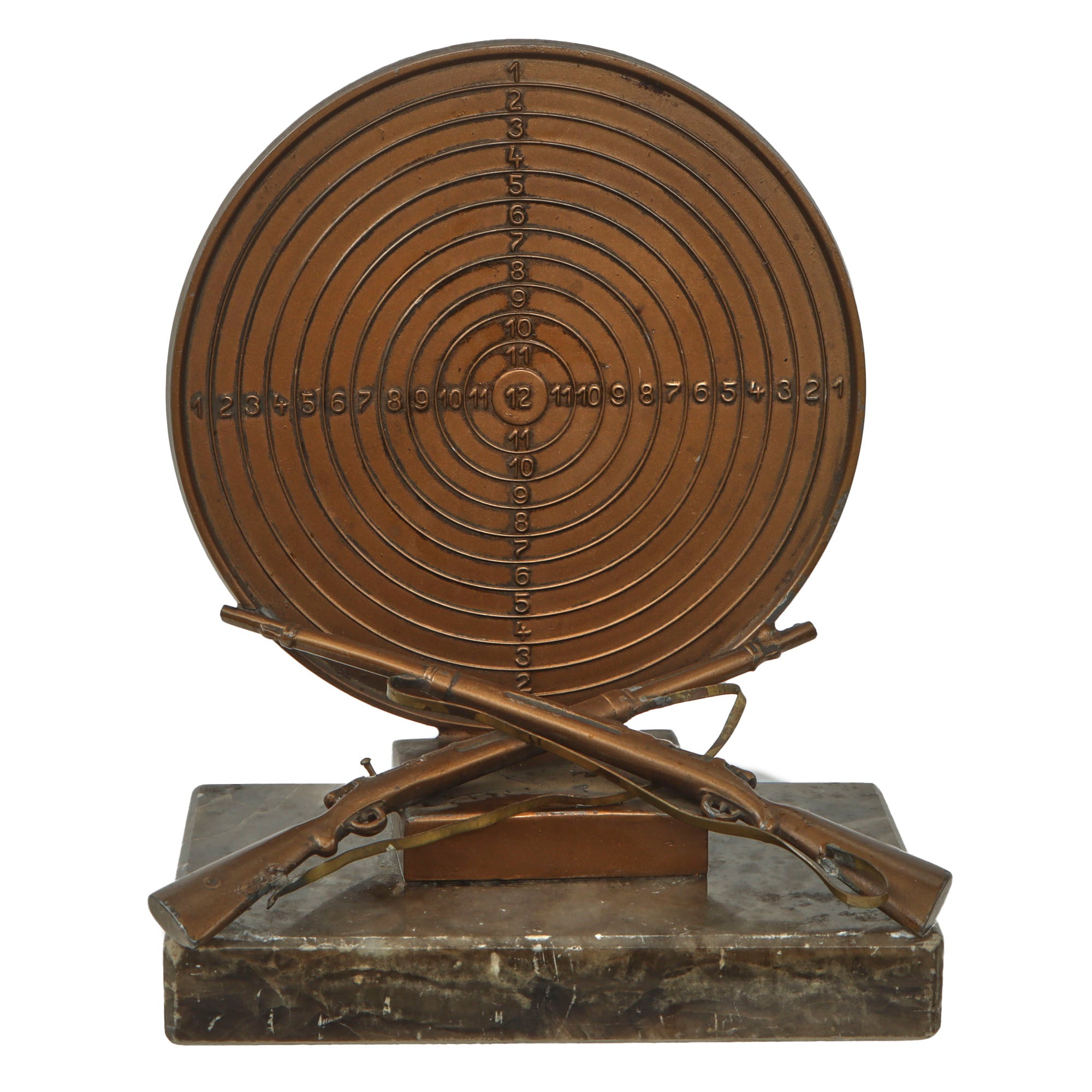 The award depicts a large brass shooting target with values from 1-12 with 12 being the center. There are crossed rifles below this which appear to be Gewehr 98 rifles, and there are sheet brass slings attached to both, but both slings are disconnected at one end, so they could use some glue.