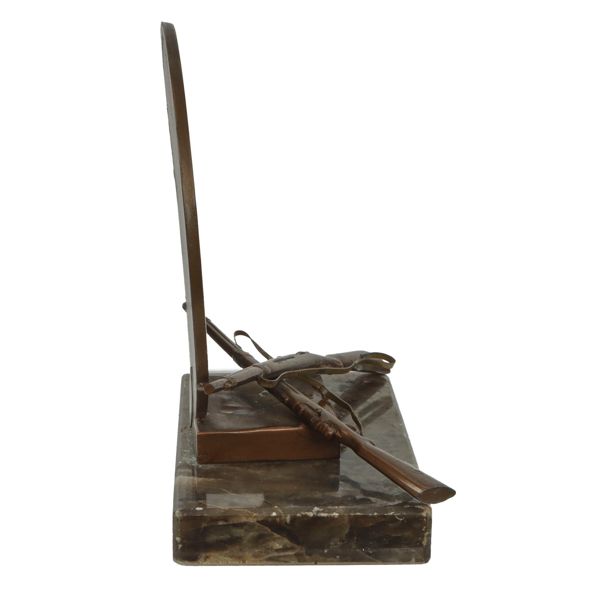 Original Item. Only One Available. This is a very interesting WWII era shooting award likely awarded during a marksmanship competition. The piece is made from brass and sits atop a marble base. It measures 6 x 5 ¼ x 3, and the marble base measures 3 x 5 x ¾”.