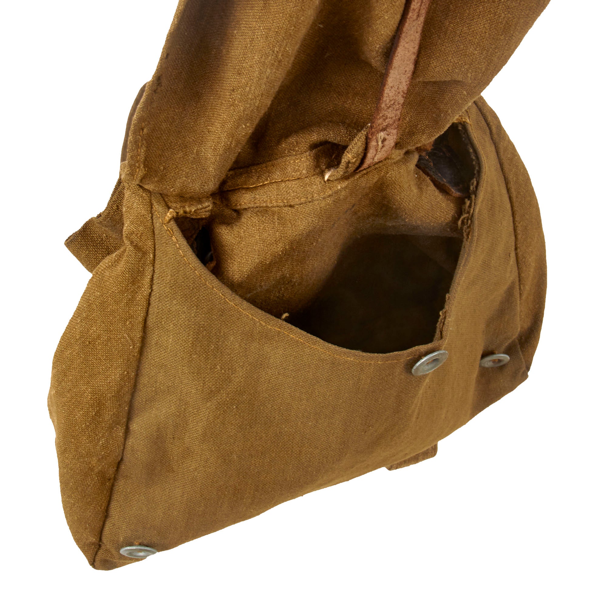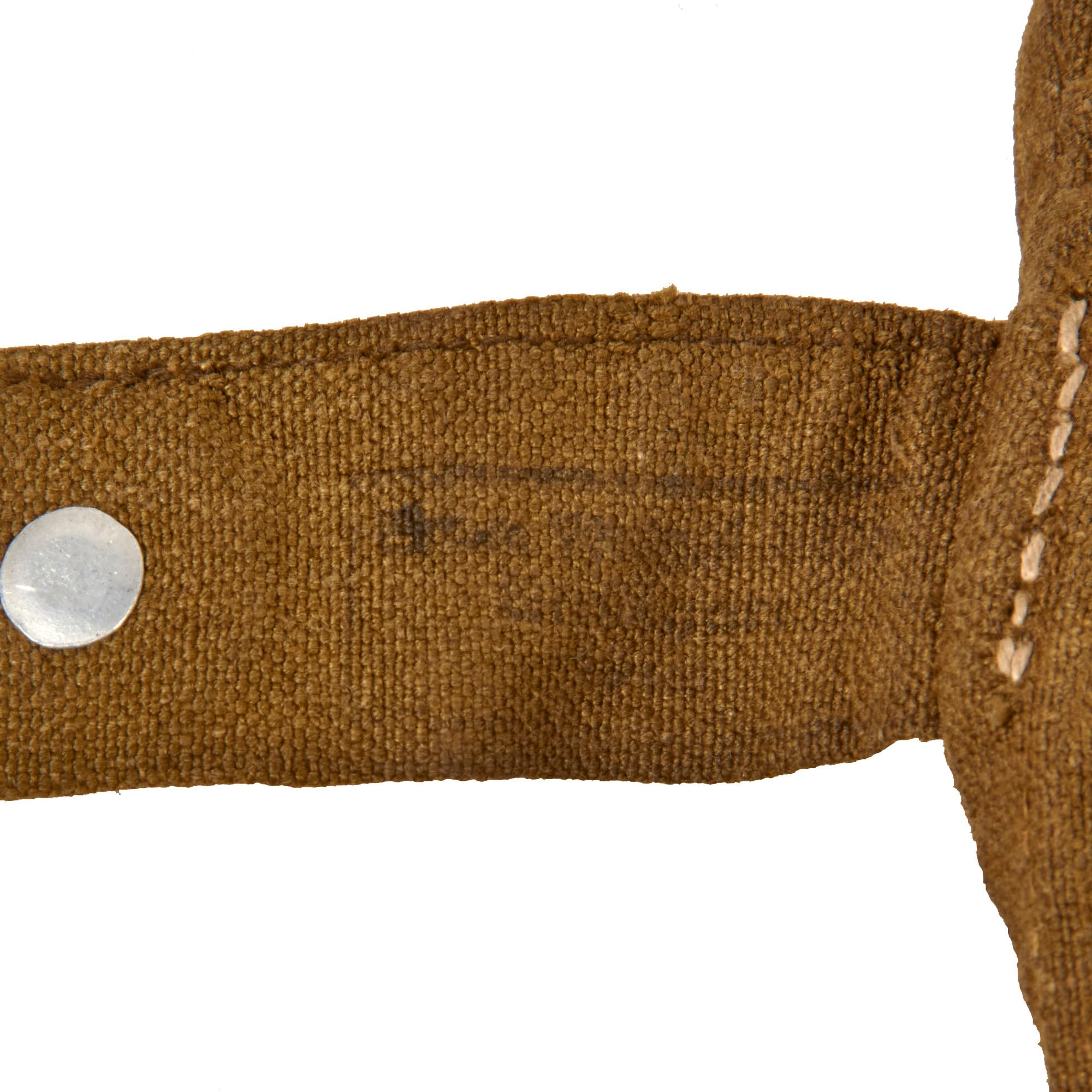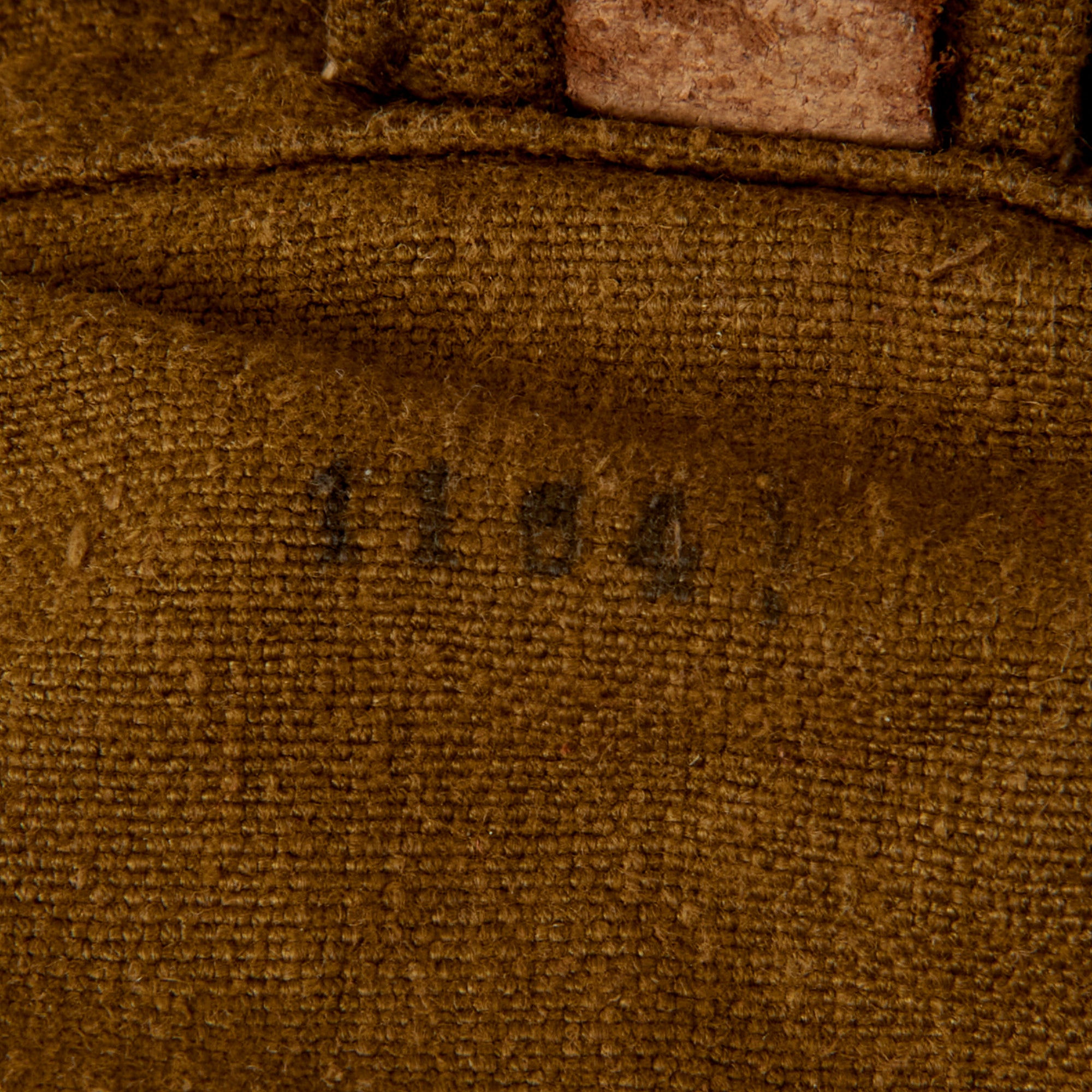 Original Item: Only One Available. This is a wonderful example of a Tropical DAK Issue M31 Haversack, also known as the “bread bag”, complete with an original DAK shoulder strap. The bag itself does appear to be complete and has all original buttons, clips and leather securing tabs retained. The canvas body still has a lovely color to it, which is the correct Olive green for a tropical issued bread bag, and many of the leather straps and fittings are replaced with the iconic tan DAK webbing.