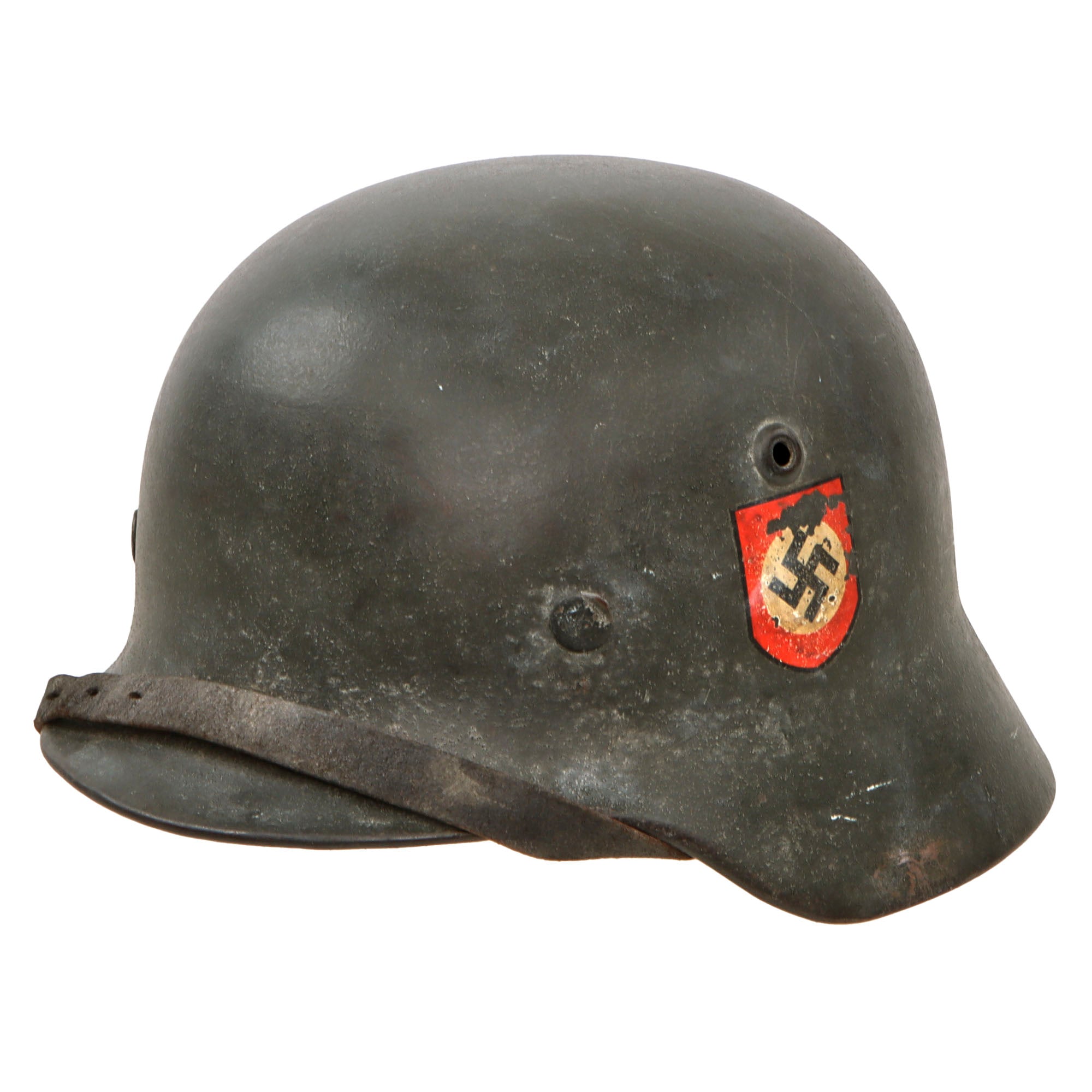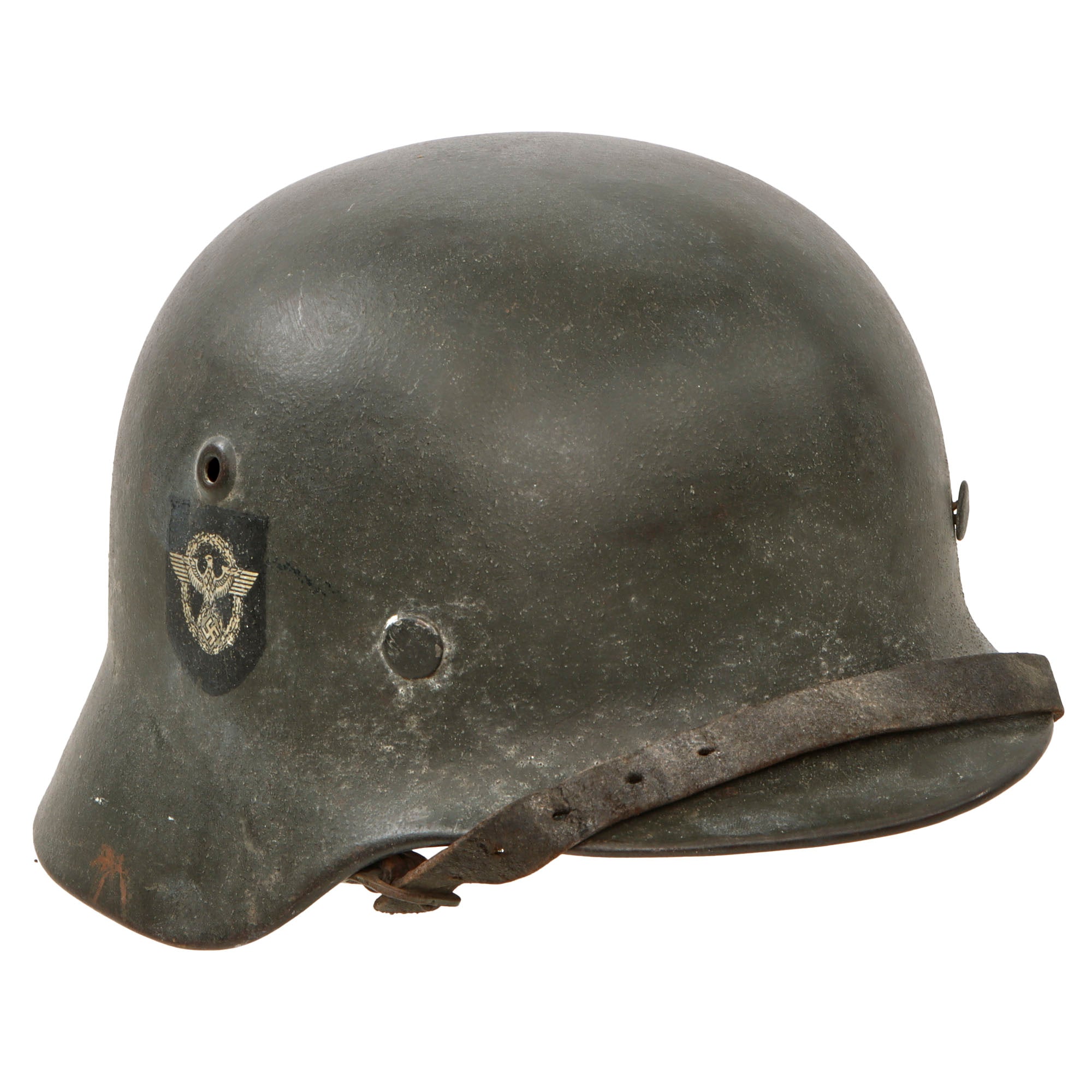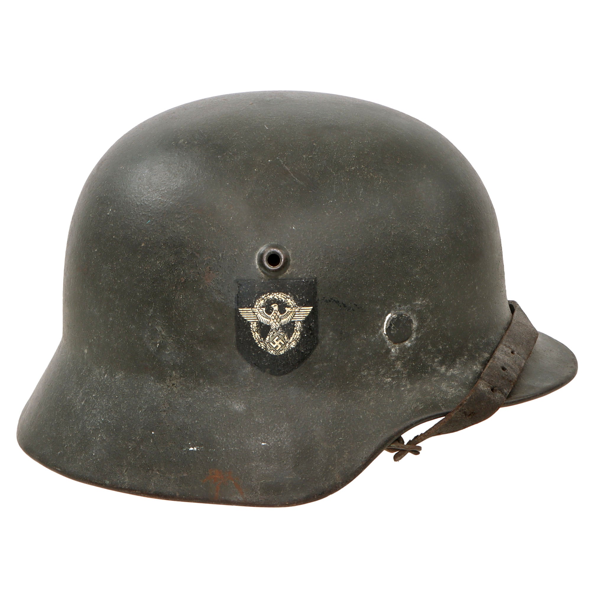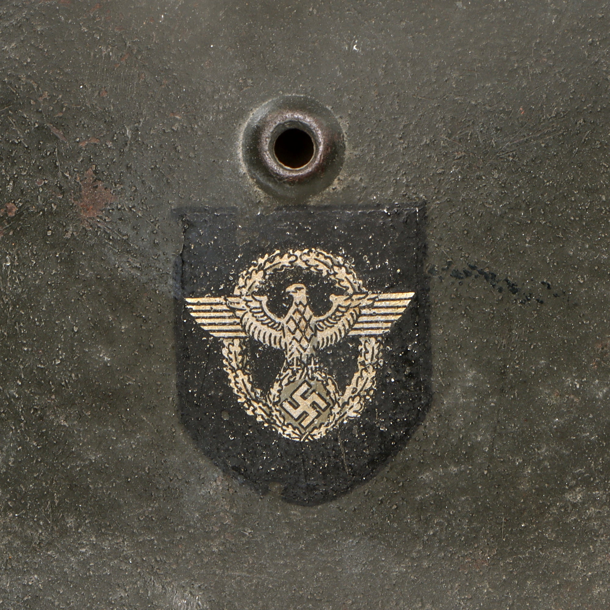 Original Item: Only One Available. This is a great all original extra small example of a German WWII M40 Police Combat Helmet, complete with original paint and decals. This is an eye catching helmet, and the first example we have been able to offer in years. It is a truly lovely helmet, in very good condition with just the right amount of period wear to give it that great "broken in" look. Field Police units served in frontline capacity, serving on the front, and also operating behind the lines fighting partisans. The Feldpolizei units operated under the guise of the SS.