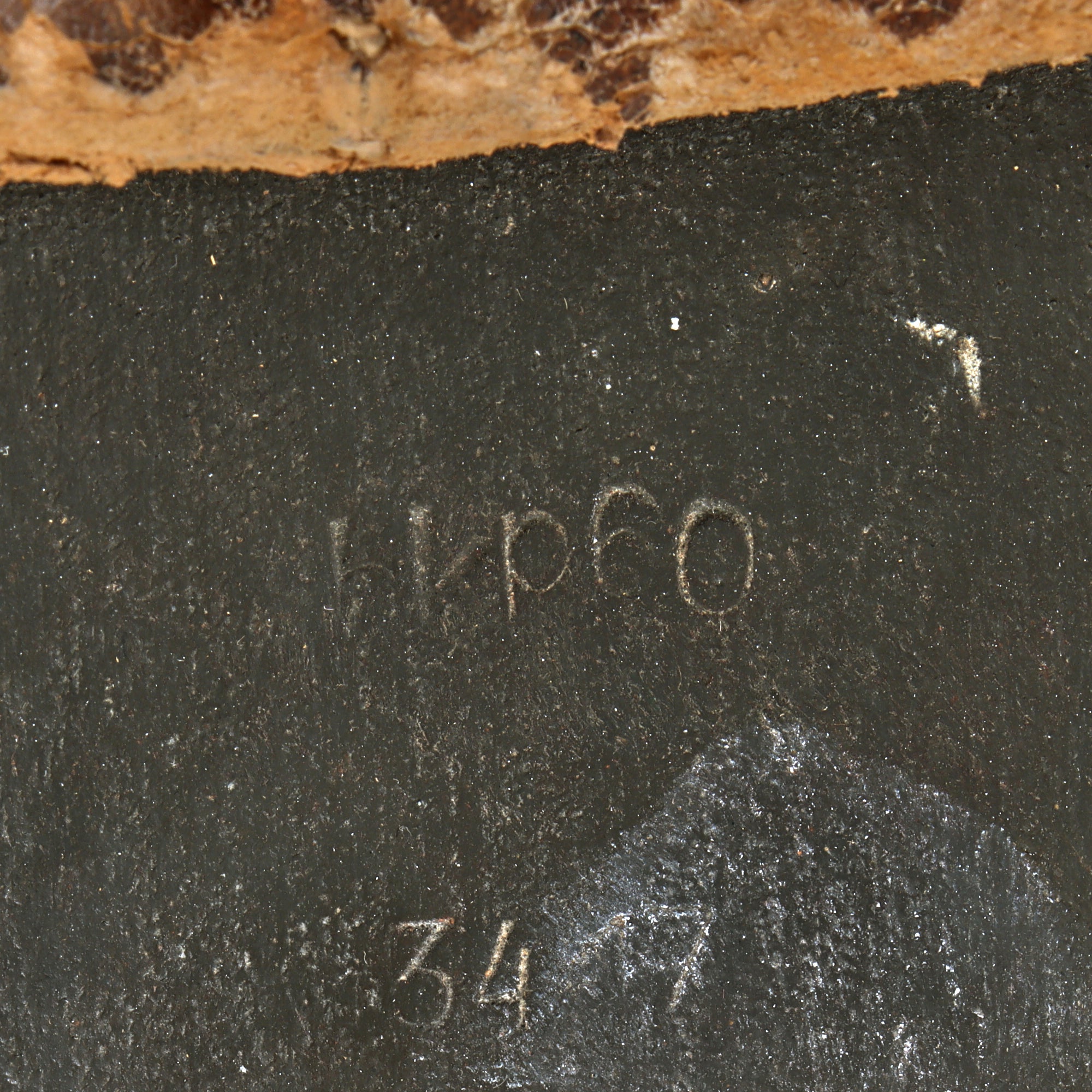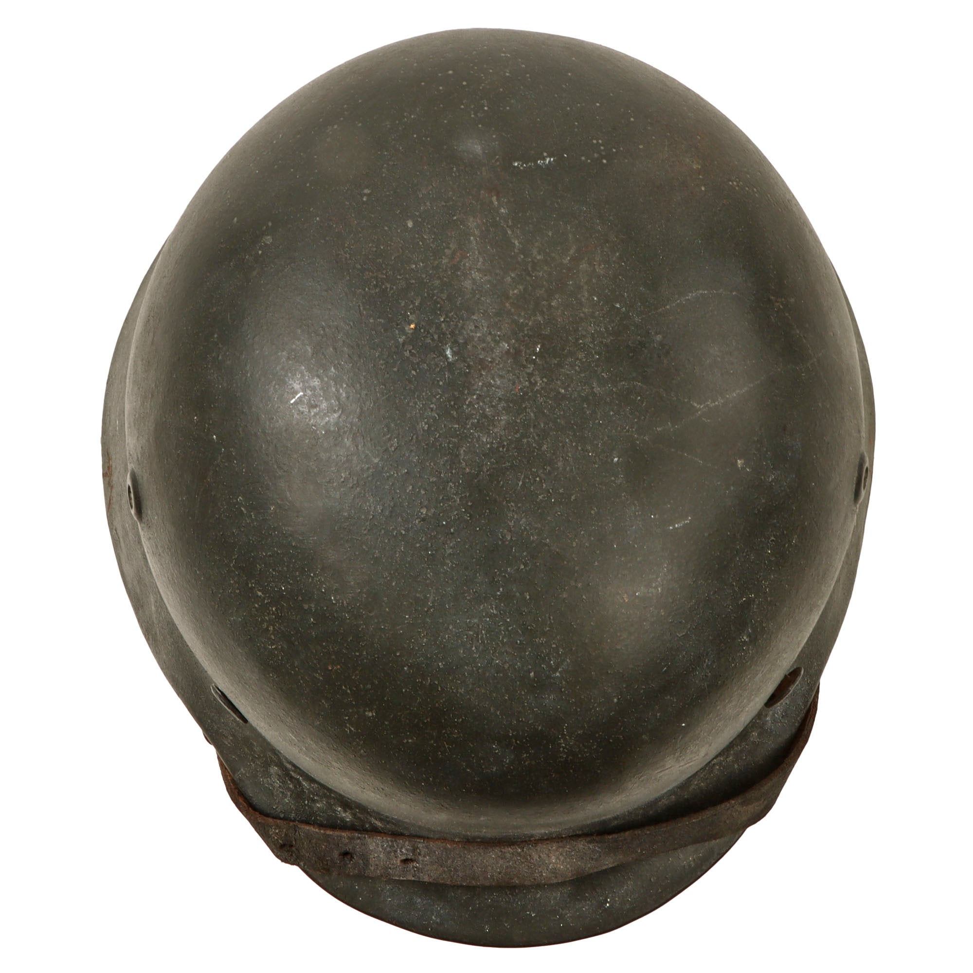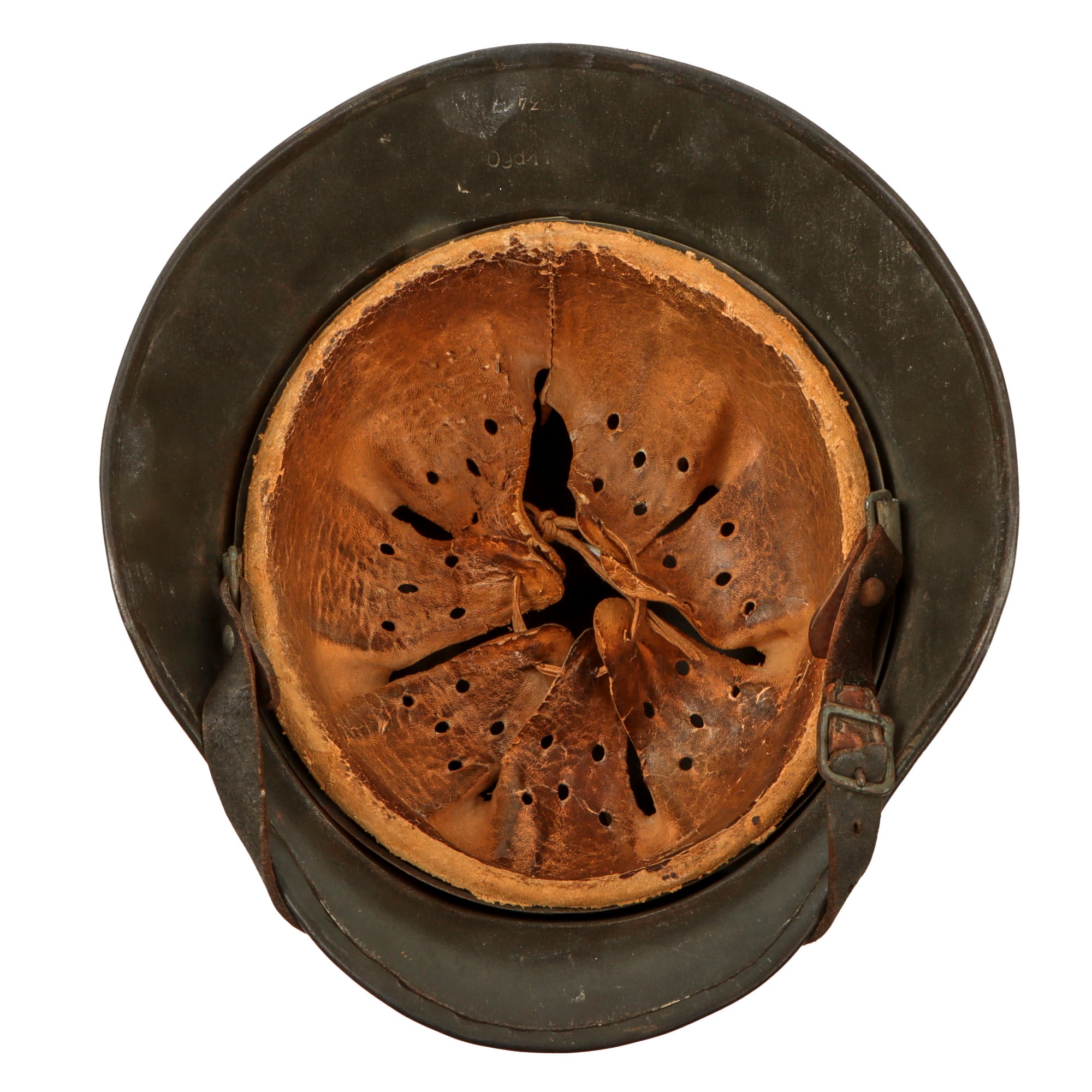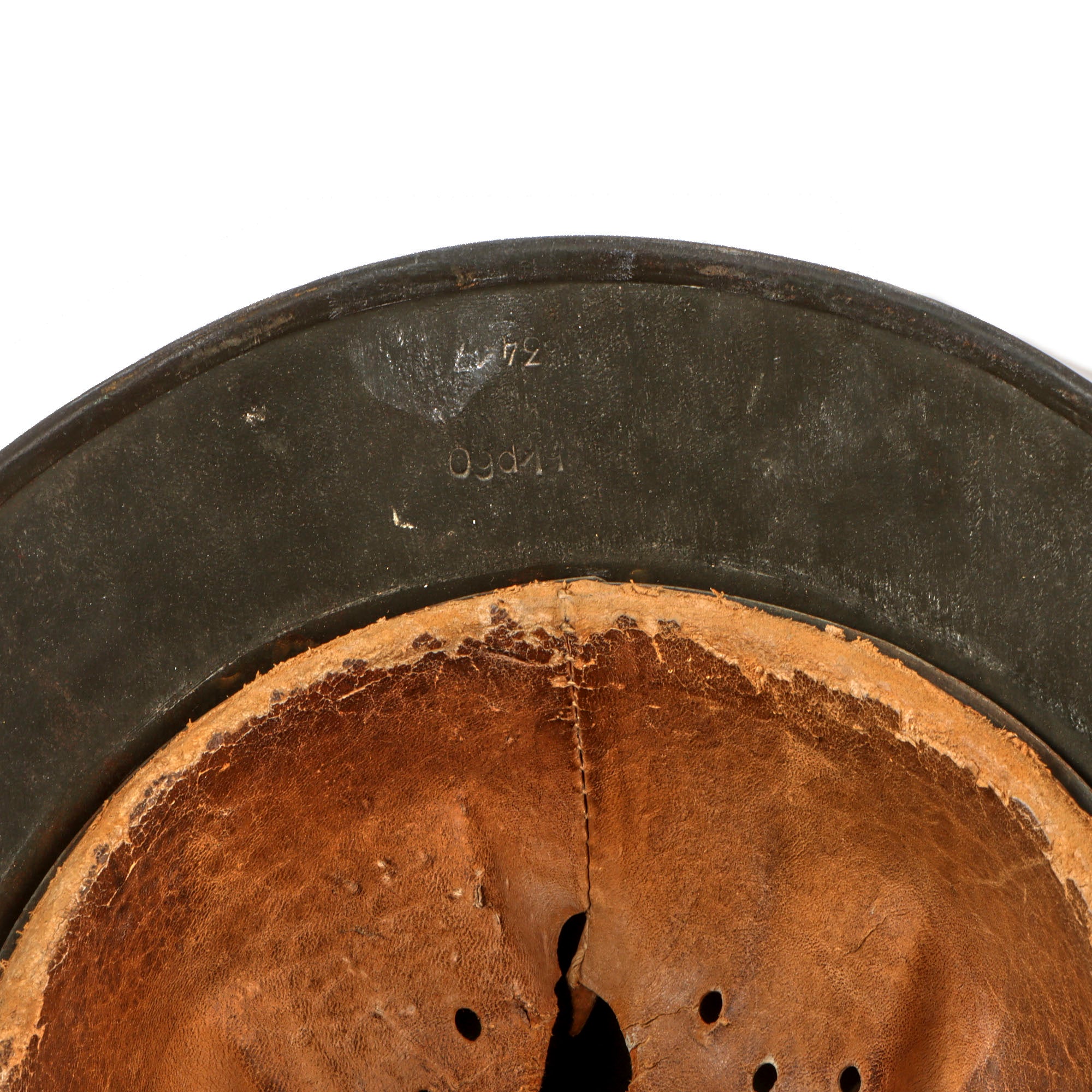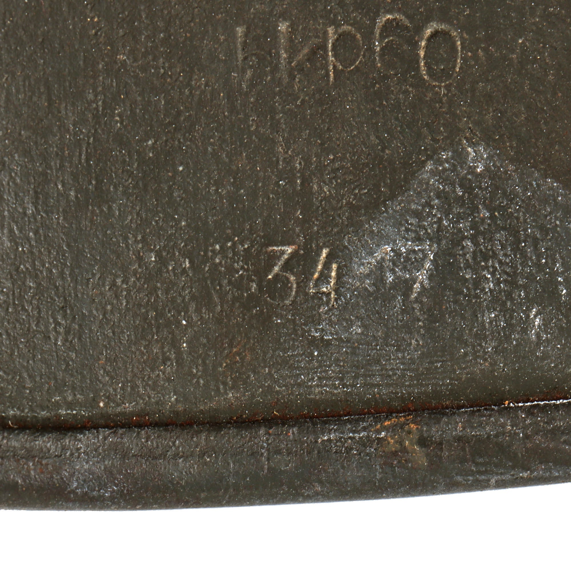 The shell is stamped with hkp 60 on the rear skirt above heat lot 3417, indicating that Sächsische Emaillier und Stanzwerke A.G. of Lauter, Germany manufactured it. Towards the end of the war, the SE marking was discontinued in favor of the three letter code hkp, and then was moved to the rear skirt to save production time. Size 60 is a very small size that can accommodate liners from 52cm to 53cm or US 6 1/2 to 6 3/8. Shells this small are extremely rare, and we have only had a handful, even when compared to the extra large size 68.