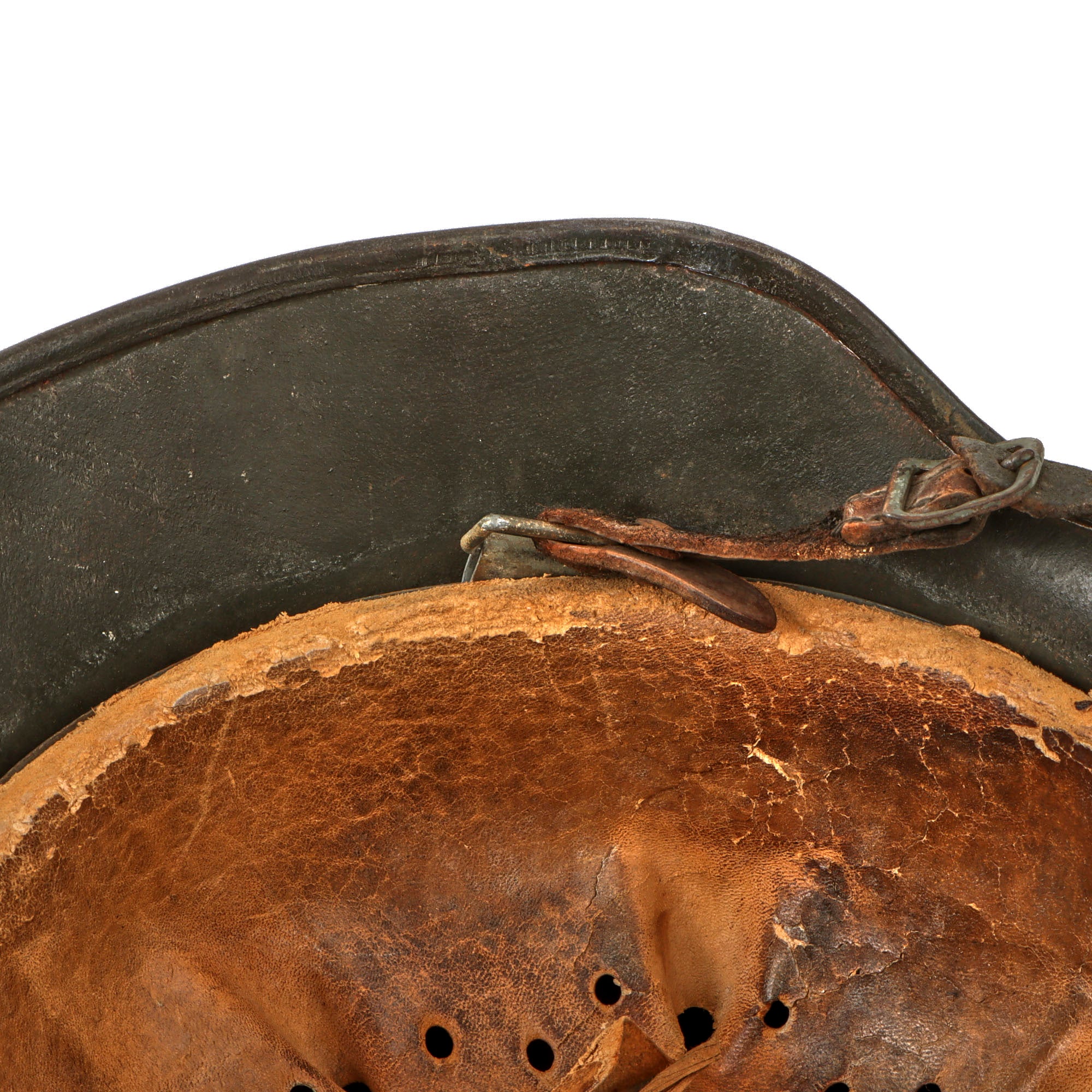 This indicates production by the metal and leather working company Werner Zahn, based in Berlin - Charlottenburg, in the year 1942, which fits right into the mid war period. There is still an original chinstrap attached to the liner, which has the correct steel hardware for this time period. The leather is however degraded, and the longer section has broken off just after the 5th size adjustment hole, so it is missing a significant part.