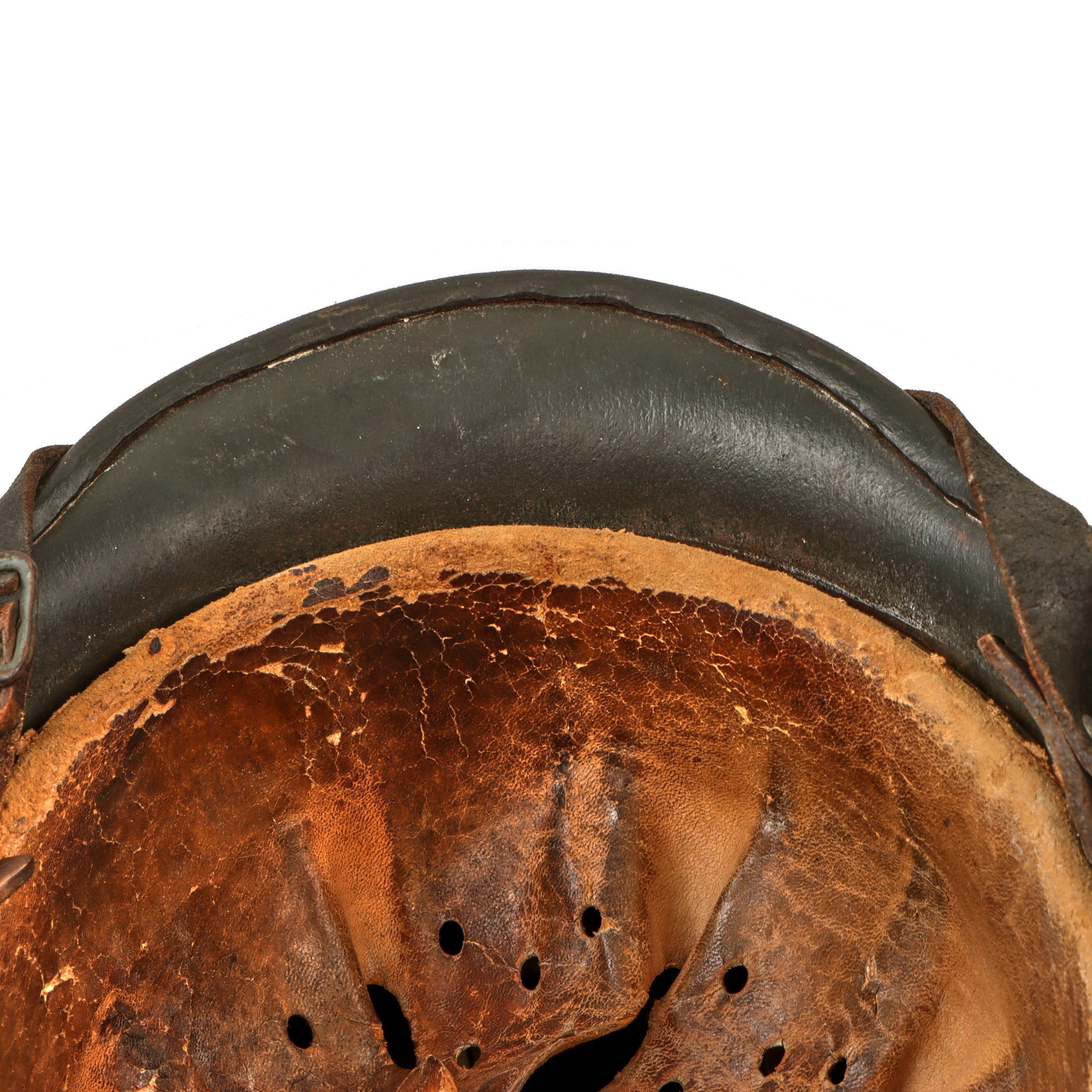 All three original liner retaining pins are present with almost all of the original lightly textured present on all three. The interior of the helmet still has an original M31 leather present, with all SEVEN "fingers" present, only seen on these extra small liners. The leather is still soft for the most part, but it does show flaking of the surface layer overall, particularly around the rim, and the top tie has been replaced with a piece of twine. The wartime issue galvanized steel liner band is faintly marked on the left outer side with 60 n.A. / 53, indicating that the liner band is a size 53, intended for a 60 shell. The right side has the full maker information lightly stamped: