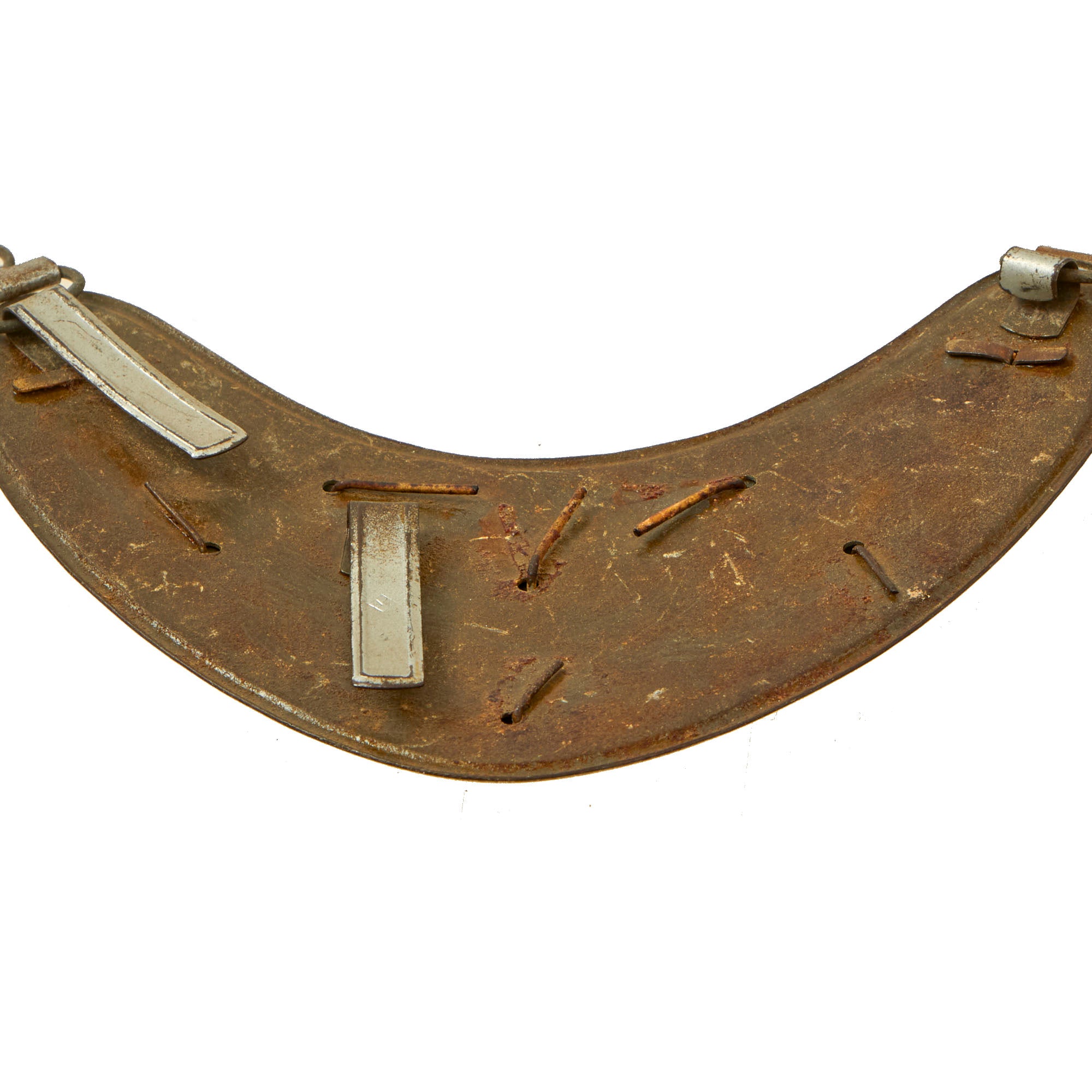 The back of this gorget has unfortunately lost the original backing, which on Maedicke made examples is usually woven wool fabric, however we can definitely still see the glue residue on the back. The aluminized paint finish shows light wear, with some scratches around the edges, and the phosphorescent paint is retained at over 80%! There is only some light wear, and it still glows great in the dark.