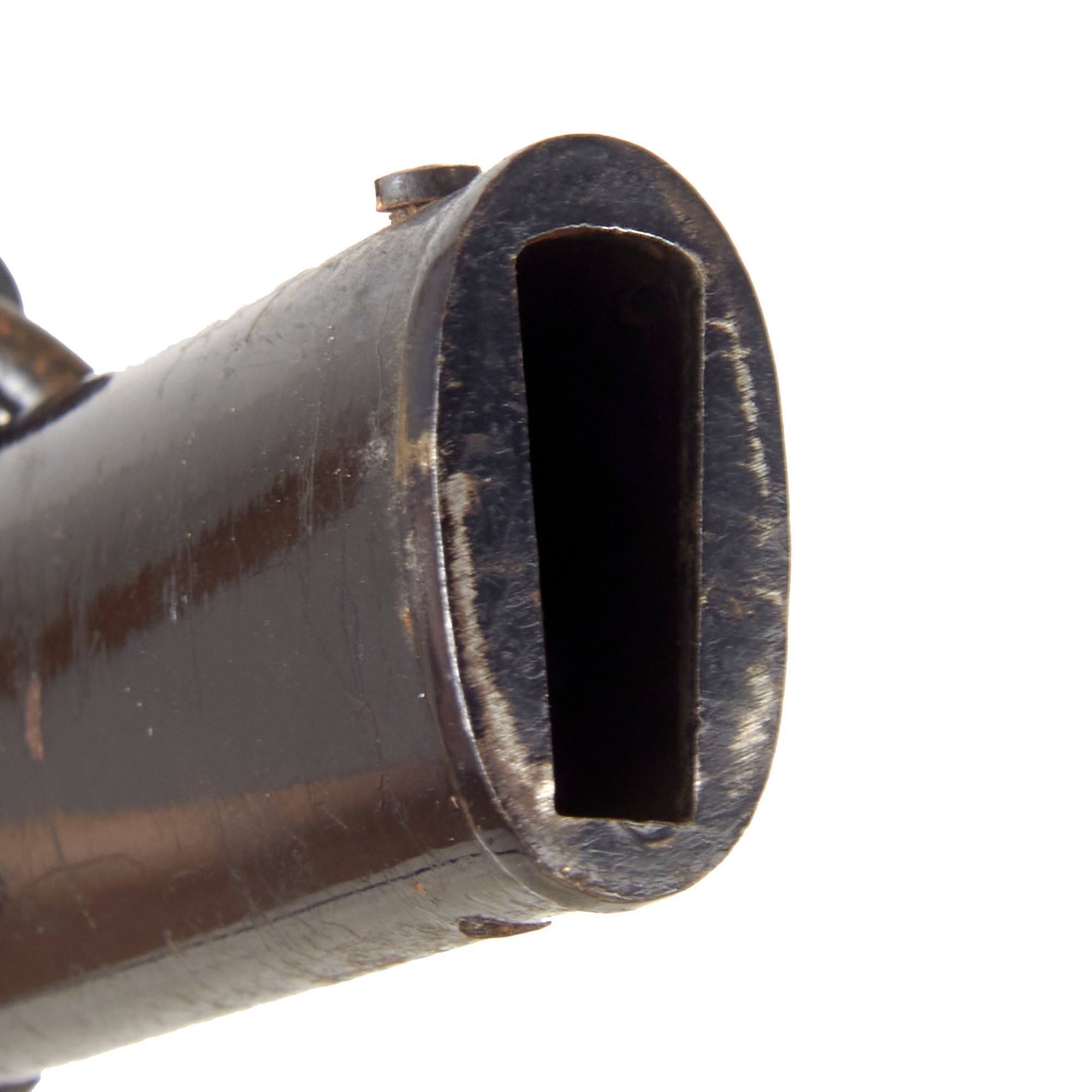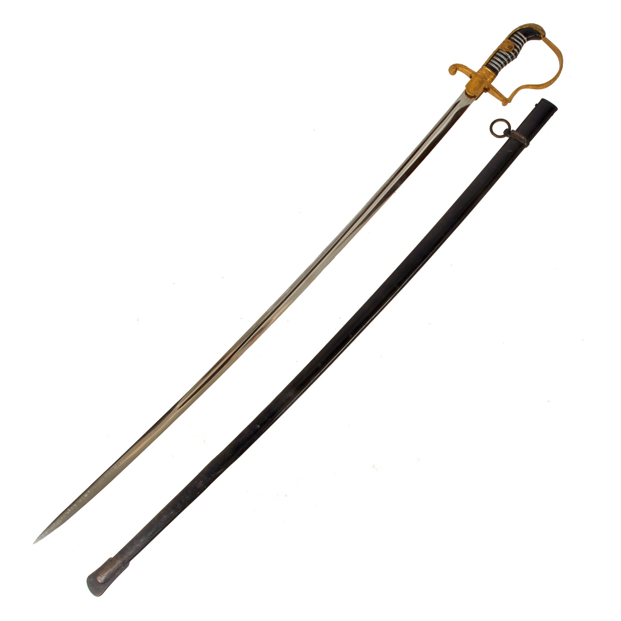 The scabbard of this example still has a very good black enamel finish, retained at over 70%, though there is some denting and a "dogleg" bent at about 10 inches above the drag. This looks almost like it was closed in a door, and it does not interfere with sheathing the blade at all. There is a lovely pattern of checking and crazing in the enamel, and we do not see any evidence that it has ever been repainted. There are a some areas of finish loss where it has oxidized a bit, but overall this is one of the better examples that we have seen. There is some wear near the hanger ring through to the base metal as is typical, and the rectangular ring for "hitching up" the sword is still intact.
