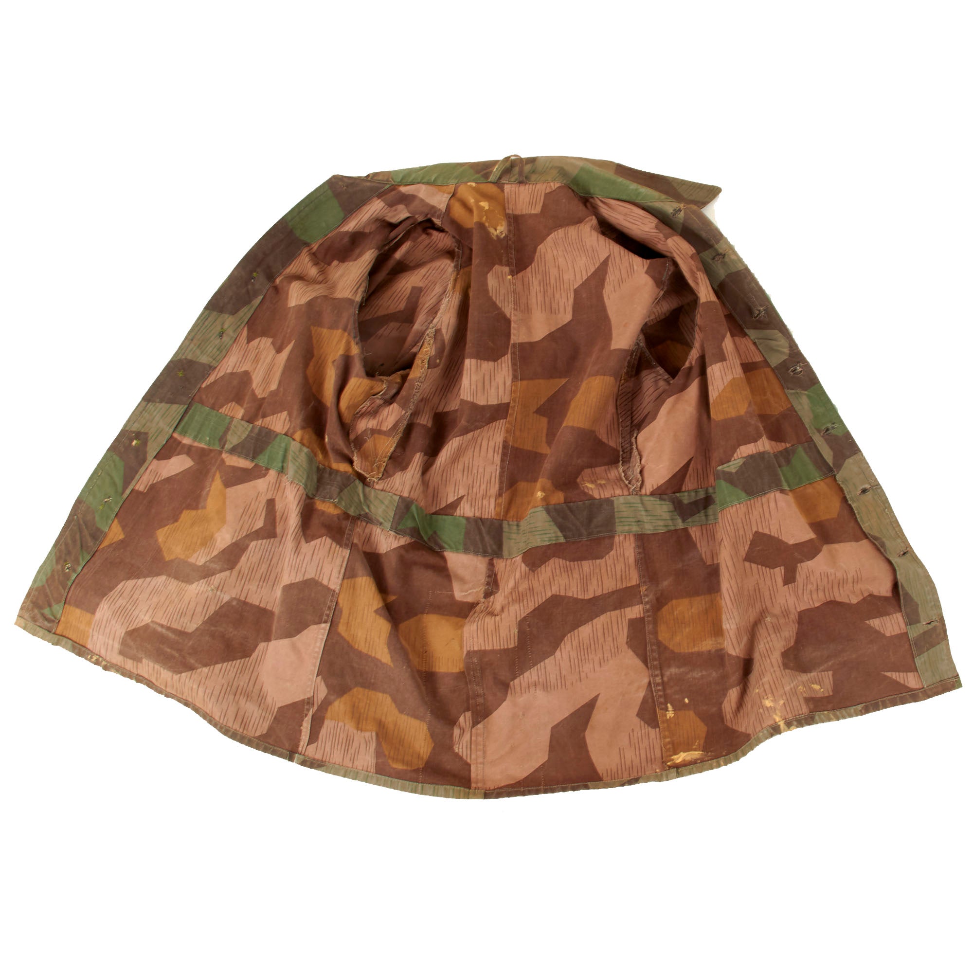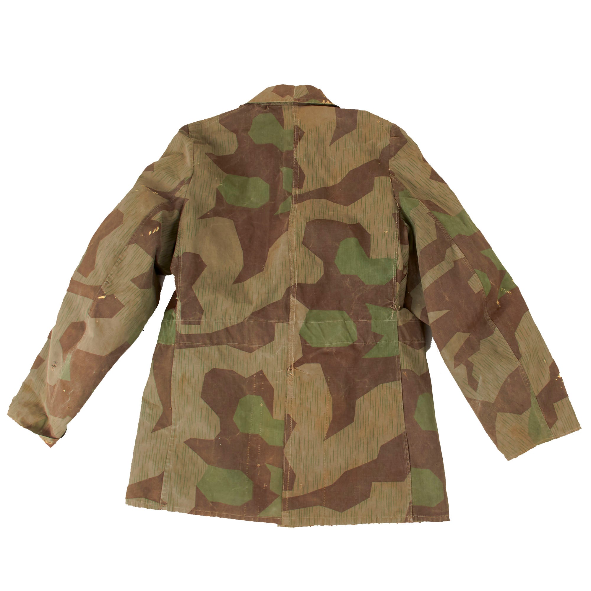 The jacket does show staining, tears, fraying, and other signs of use, so it definitely was used for a good amount of time after being constructed zeltbahn fabric. We can also see some areas that look to have either been exposed to bleach or watered down tan paint, which has resulted in some light areas on the jacket.