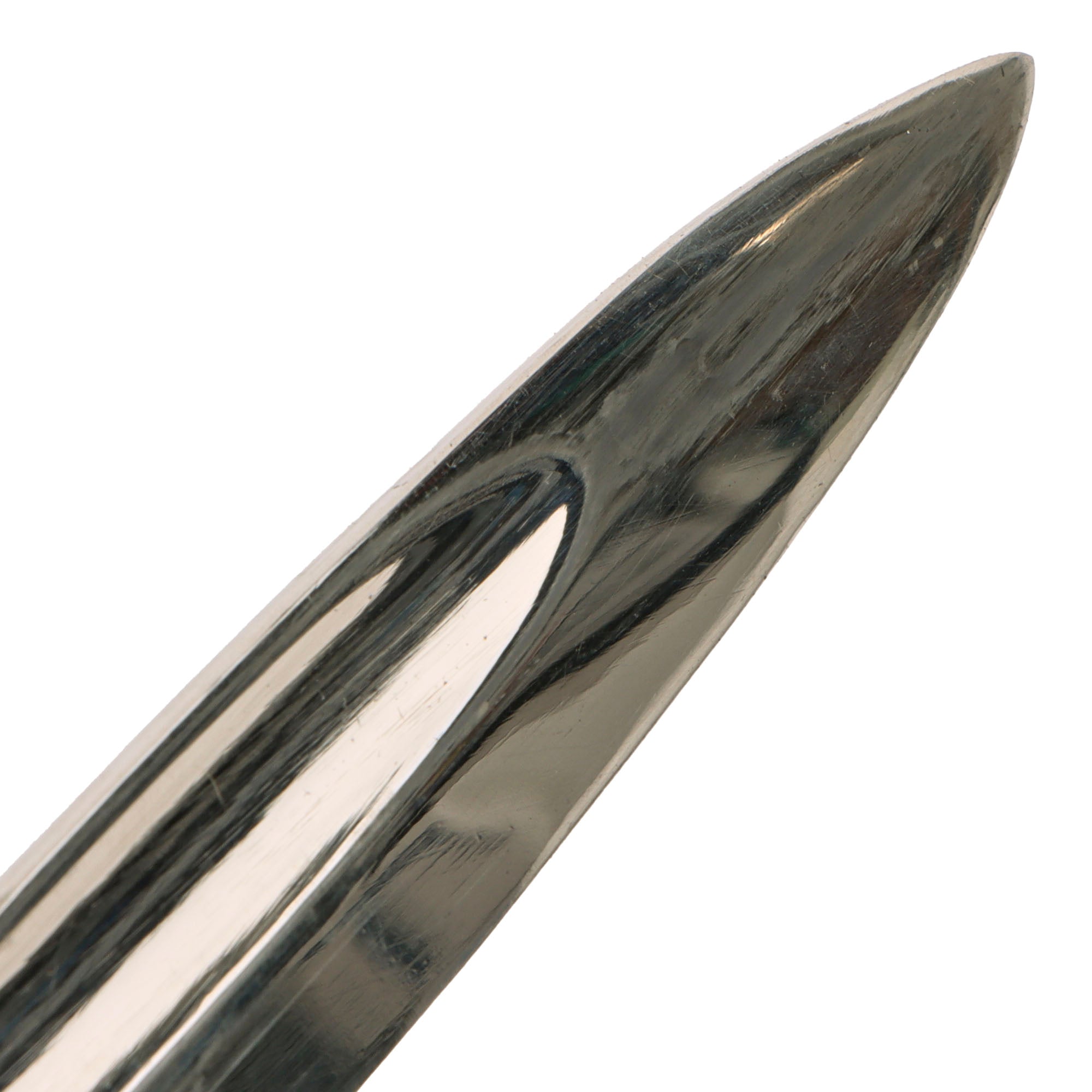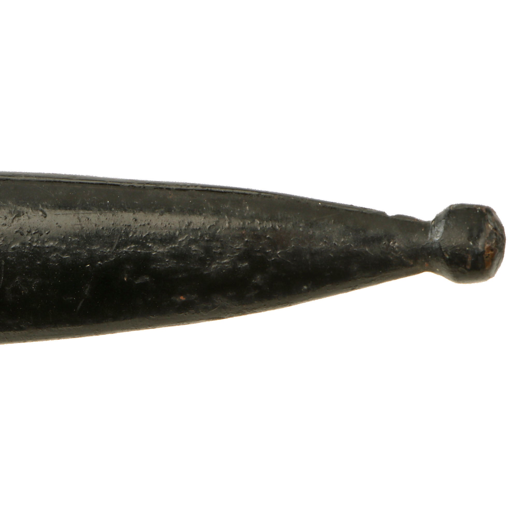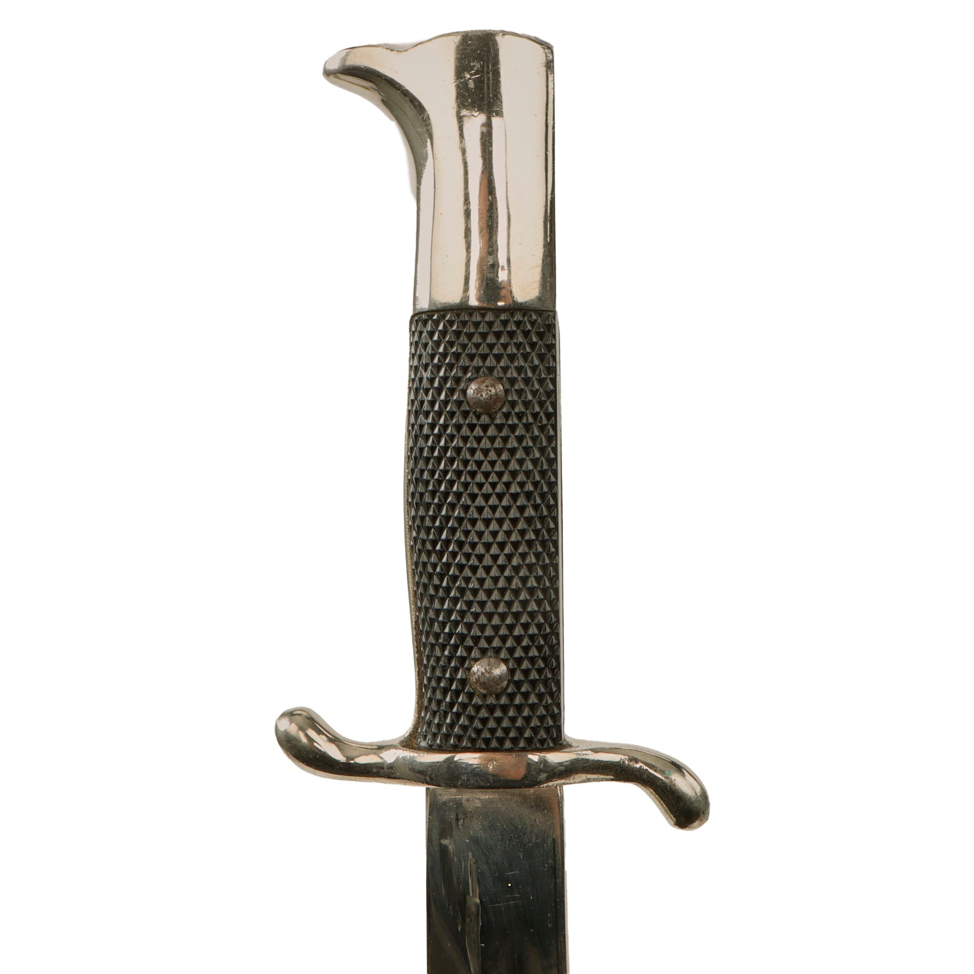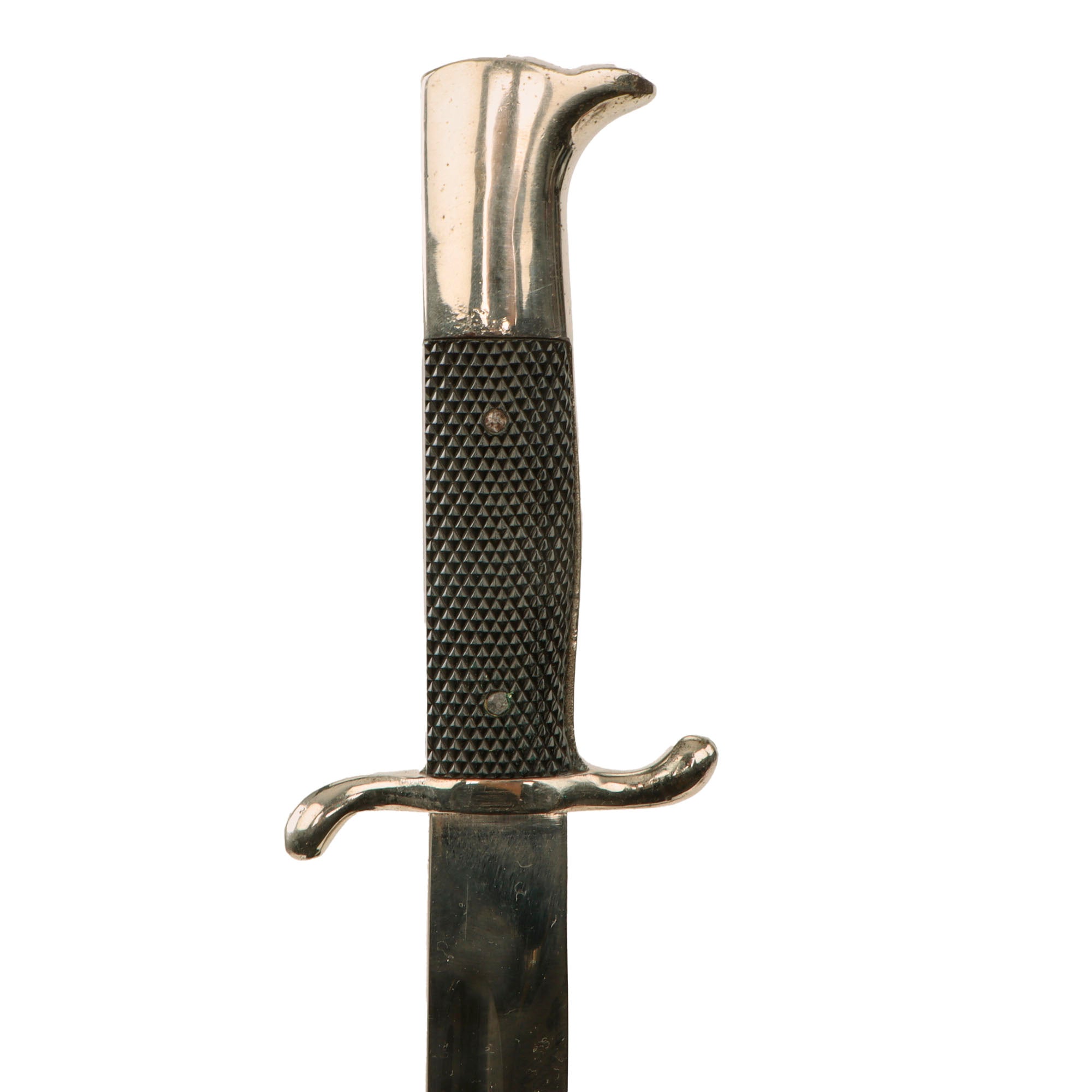 This Fireman's Bayonet is in very good condition throughout, and is the 9 3/4-inch blade "long" version. It comes complete with its original black enameled scabbard, black patent leather frog, and even a leather and bullion "troddel" knot. The nickel hilt plating is bright throughout and remains 95% intact, with just some wear and light oxidation in places on the steel hilt. It has the typical "S" shape crossguard used on the Fireman issue bayonet. The grip plates are the checkered black Bakelite type, in excellent condition and retained by nickel plated steel rivets with dressed obverse heads, which show plating loss and oxidation.