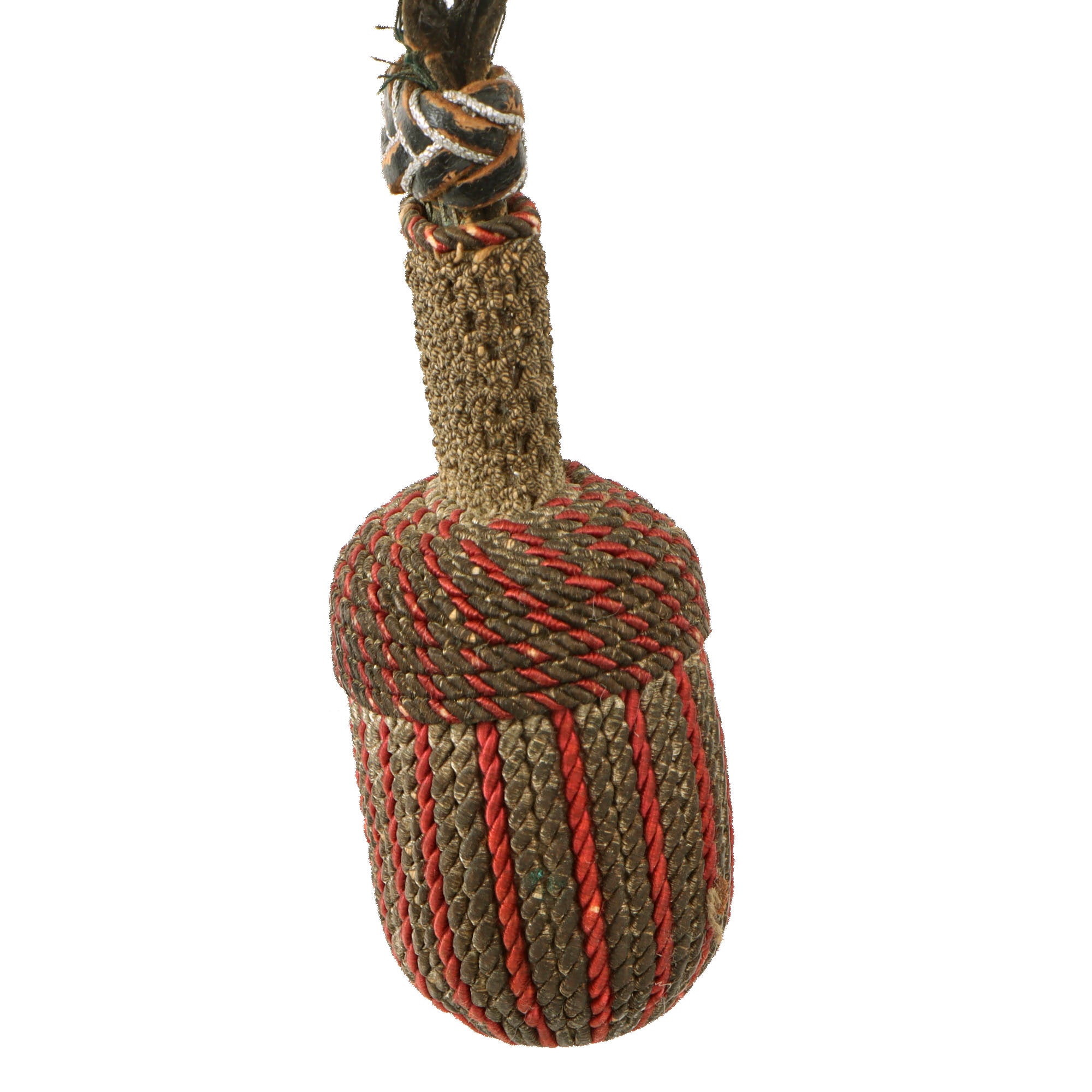 The scabbard is quite nice and still has over 90% of the original black enamel paint, with some thin scratches through the enamel on both sides. There are no dents, and just light wear, and we can see age crazing and checking in the finish, showing that it has not been refinished. The body is held by the included black leather frog, which is in very good used condition. The black gloss finish is in great shape, with the stitching is mostly intact, and it fits the scabbard nicely. Wrapped around it is a fireman's troddel knot, with a leather strap with three lines of metal thread, and a silver and carmine red colored end knot, correct for a member of the fire service. The leather strap is torn in places, and the metal stripes show oxidation.