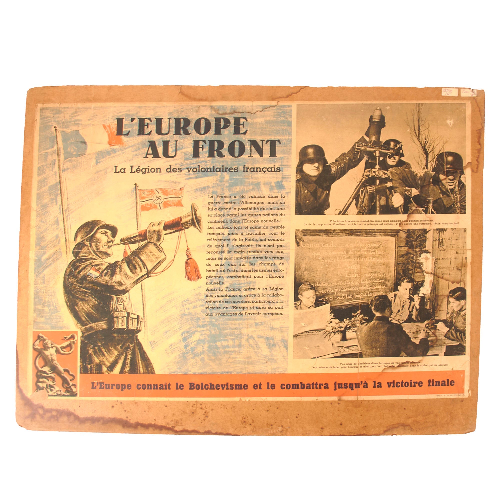The first is in French and is titled “L’Europe au Front / La Legion des volontaires francais” or “Europe at the Front / The Legion of French Volunteers”. It notes that France was defeated in the War against Germany, but that they did not reject the hand extended to them, but rather joined the ranks of those who are “Fighting for a New Europe”. The particle board measures 27 ¼ x 35 ⅛” and the poster itself measures 23 ¼ x 33 ¼”. It is dated 1943. There is heavy water damage to the particle board.