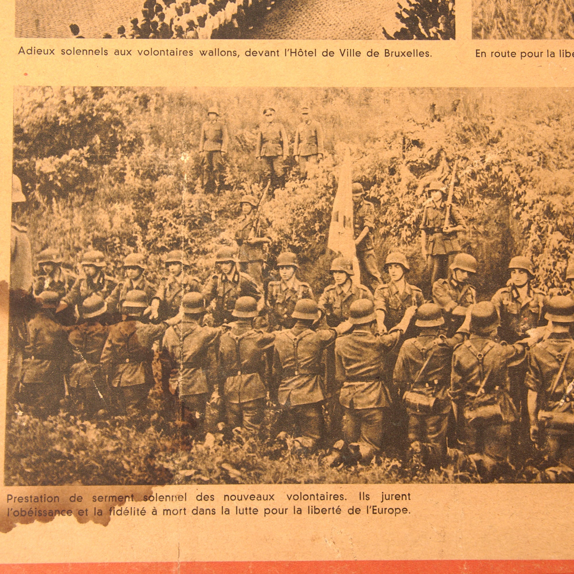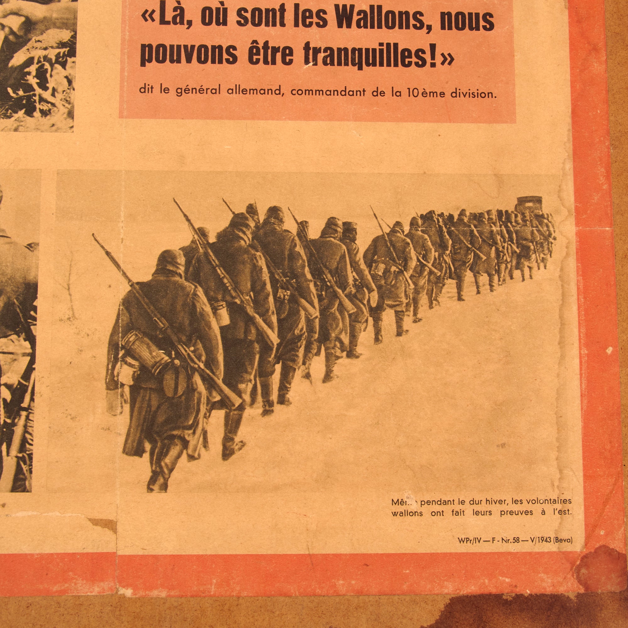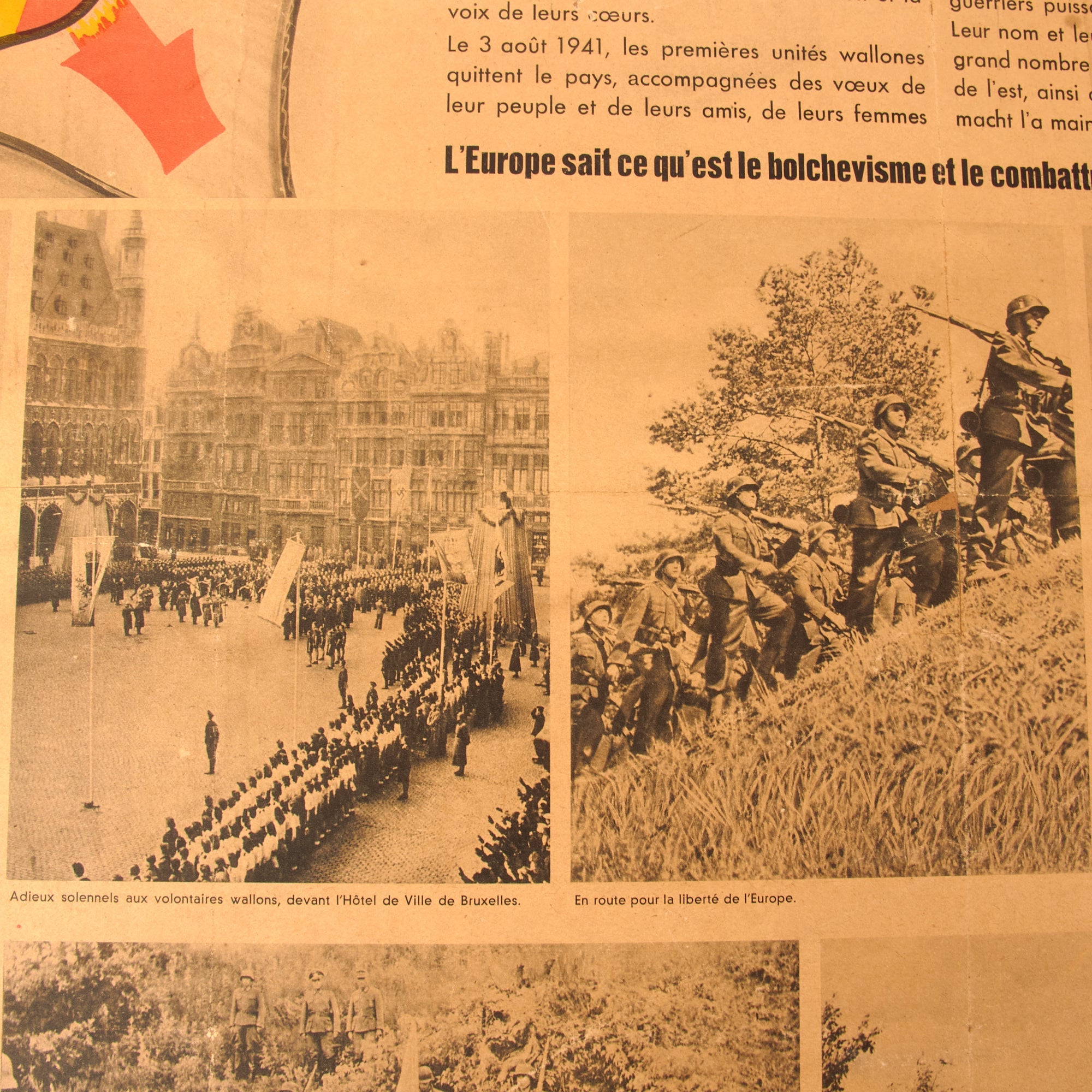 The third and final poster is in French, but is marketed toward the people of Wallonia, Belgium, and is titled “Les Wallons combattent pour la liberte de l’Europe”, or “The Walloons fight for the freedom of Europe!” Walloons are a Gallo-Romance ethnic group native to Wallonia, Belgium. The poster discusses how the Walloons proved themselves as powerful warriors, worthy of their tradition. Bolshevism is a disease that must be culled from Europe. There is some damage to the poster. The particle board is 29 ¾ x 38 ¼”, and the poster itself is 24 ¼ x 33 ¾”.