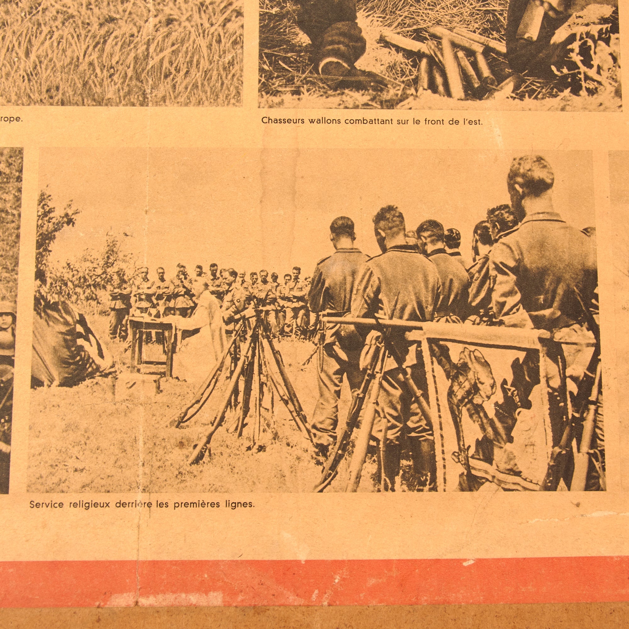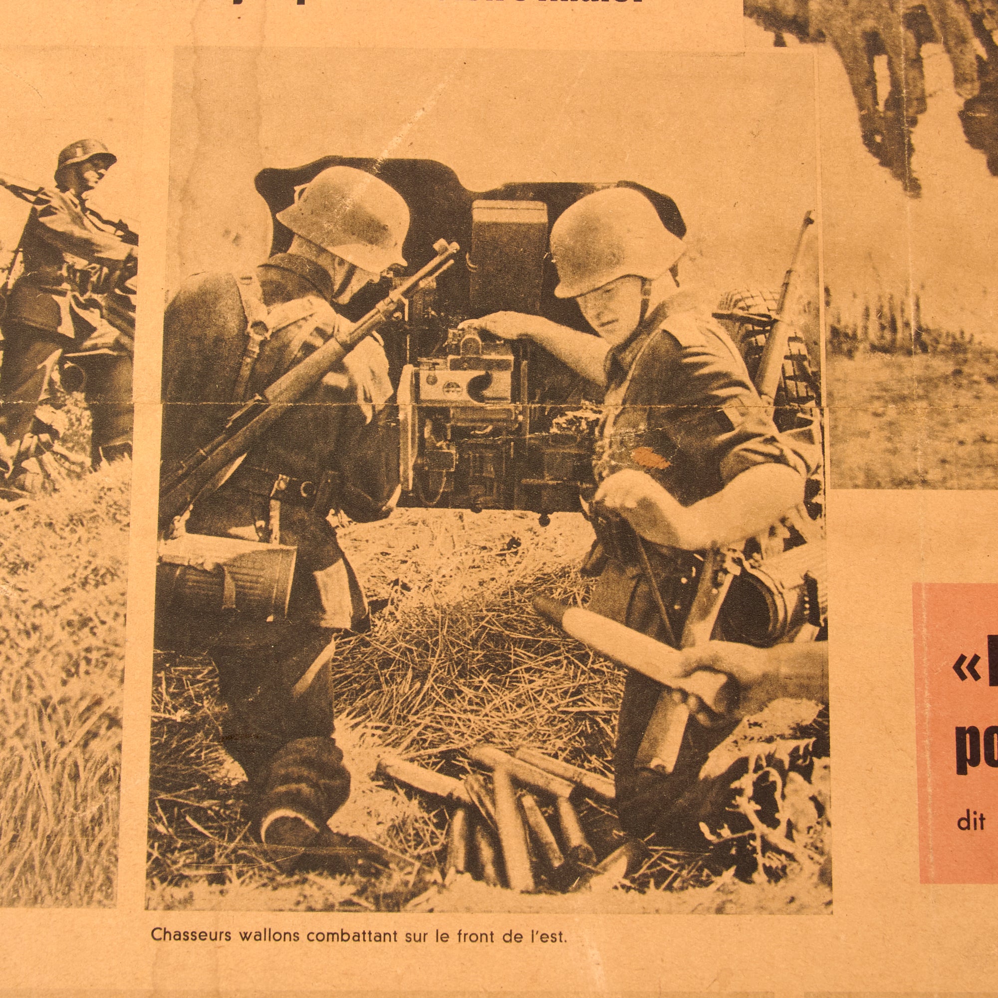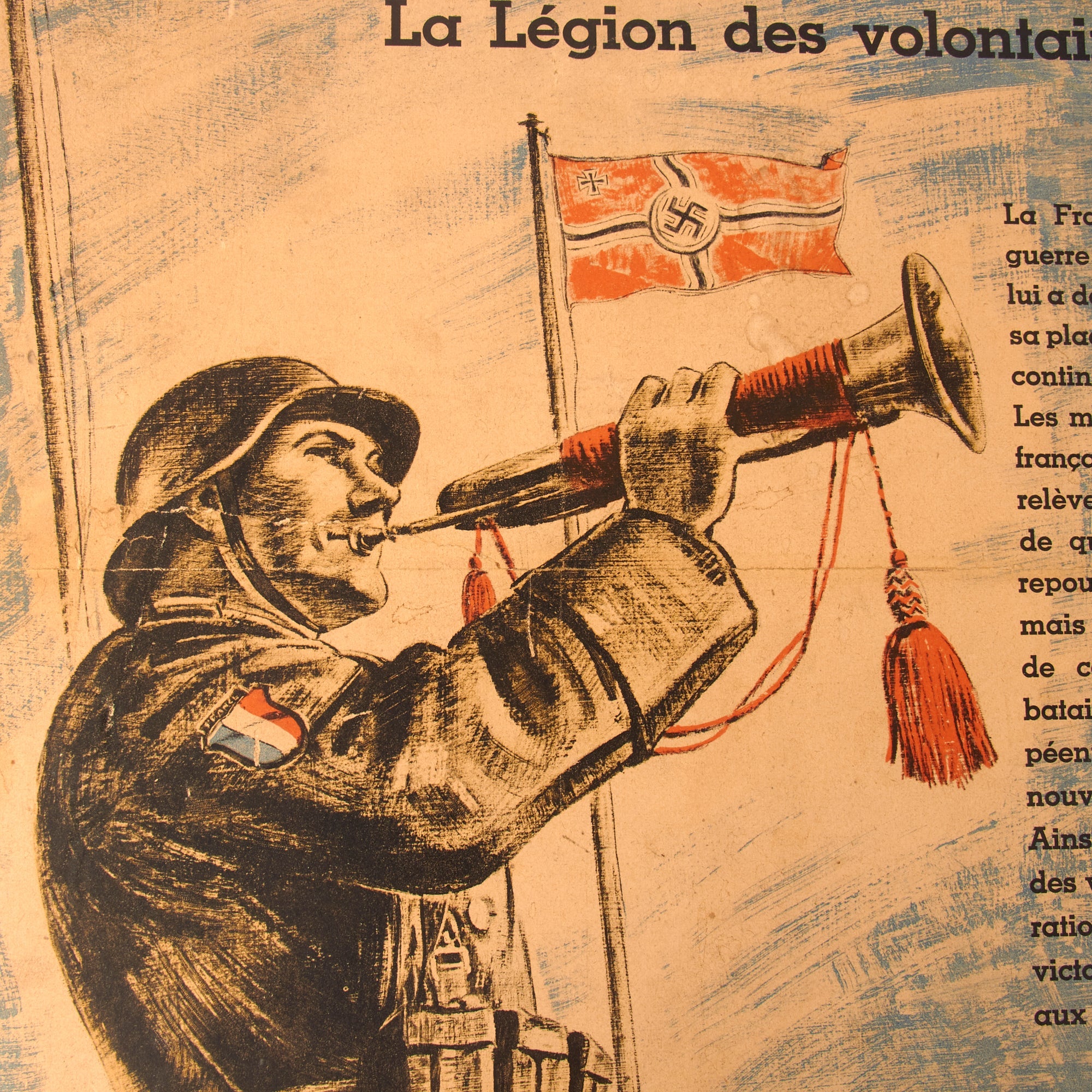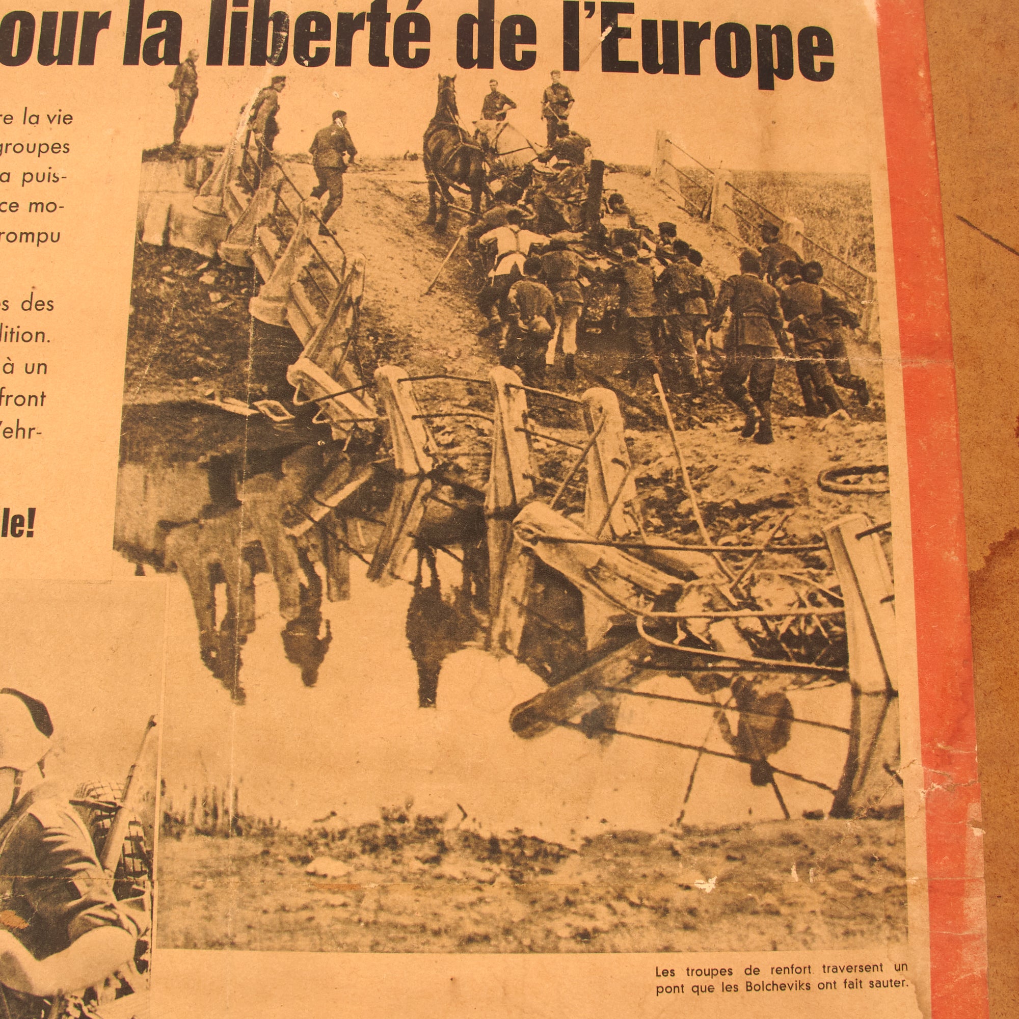 The third and final poster is in French, but is marketed toward the people of Wallonia, Belgium, and is titled “Les Wallons combattent pour la liberte de l’Europe”, or “The Walloons fight for the freedom of Europe!” Walloons are a Gallo-Romance ethnic group native to Wallonia, Belgium. The poster discusses how the Walloons proved themselves as powerful warriors, worthy of their tradition. Bolshevism is a disease that must be culled from Europe. There is some damage to the poster. The particle board is 29 ¾ x 38 ¼”, and the poster itself is 24 ¼ x 33 ¾”.