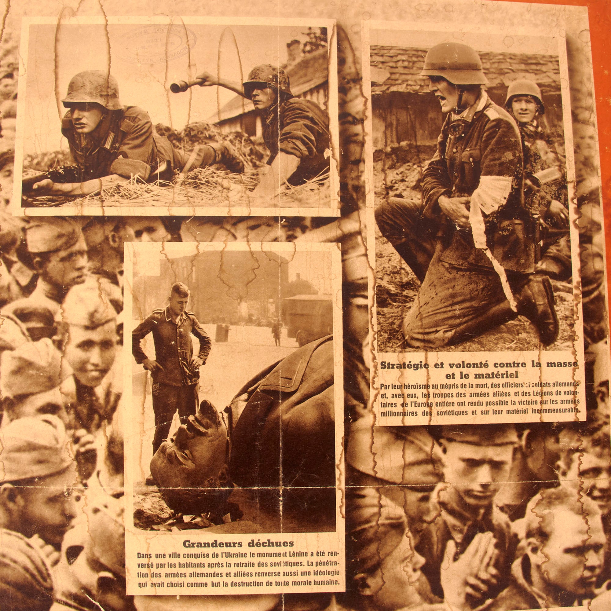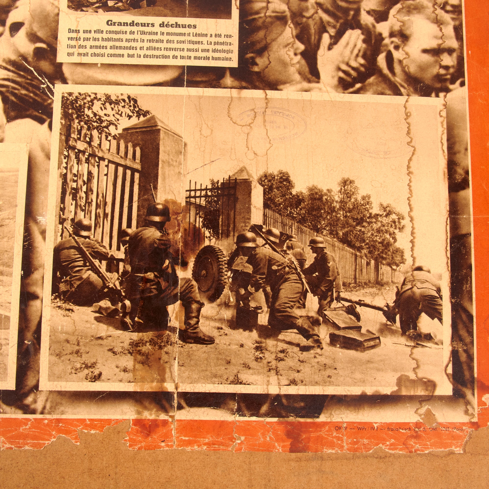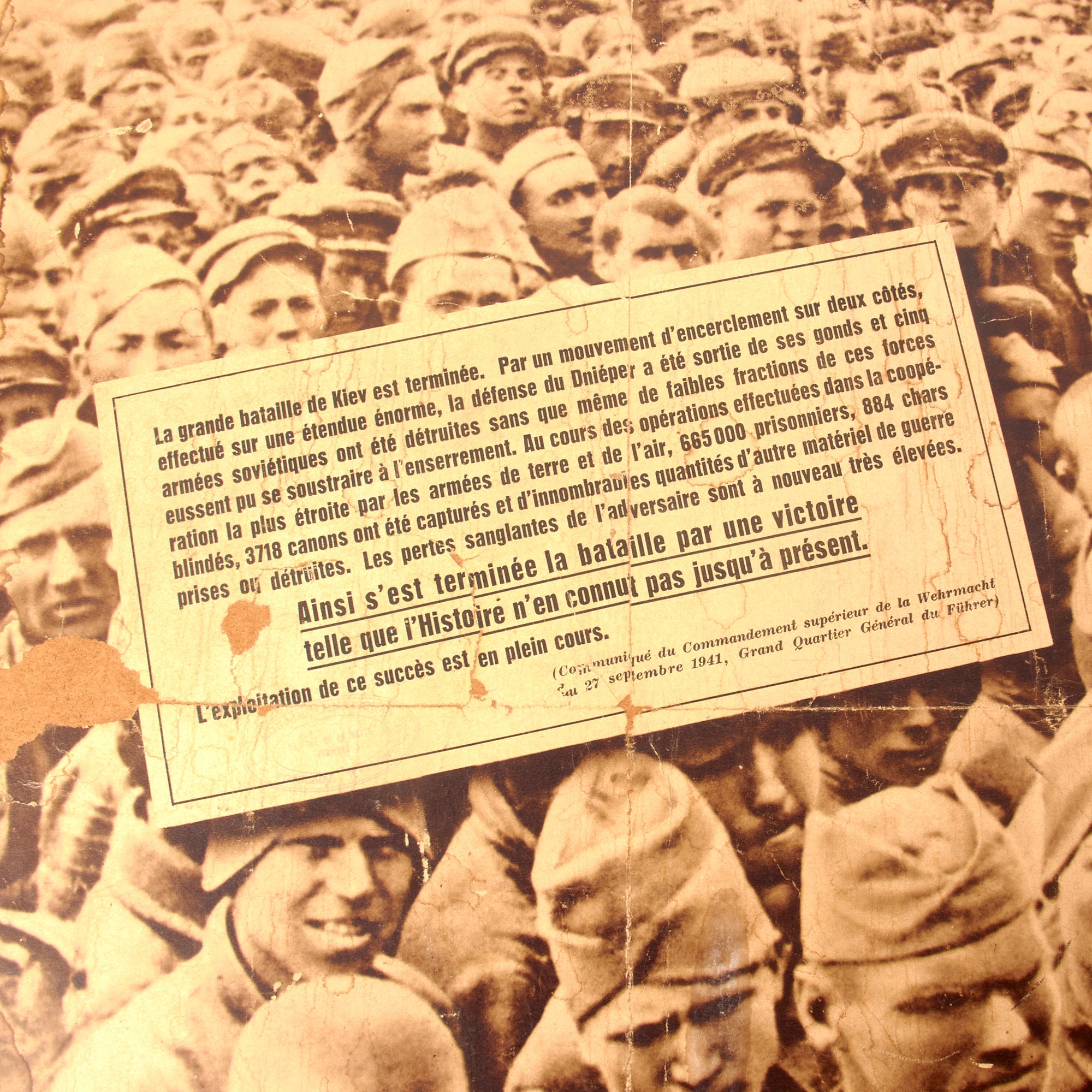The second poster is also in French and is titled “KIEV - la plus grande victoire sur l’ennemi mortel de l’Europe!” or “KIEV - The greatest victory over Europe’s hammered enemy!”. This poster discusses the conclusion of the Battle of Kiev, and how it is such a substantial victory that history has not known until now. This poster is in the worst condition of the three, with heavy tearing and loss of material across. The particle board measures 29 ½ x 38” and the poster itself measures 24¼ x 33⅜”. There is heavy water damage to the particle board. This poster is dated 1941.