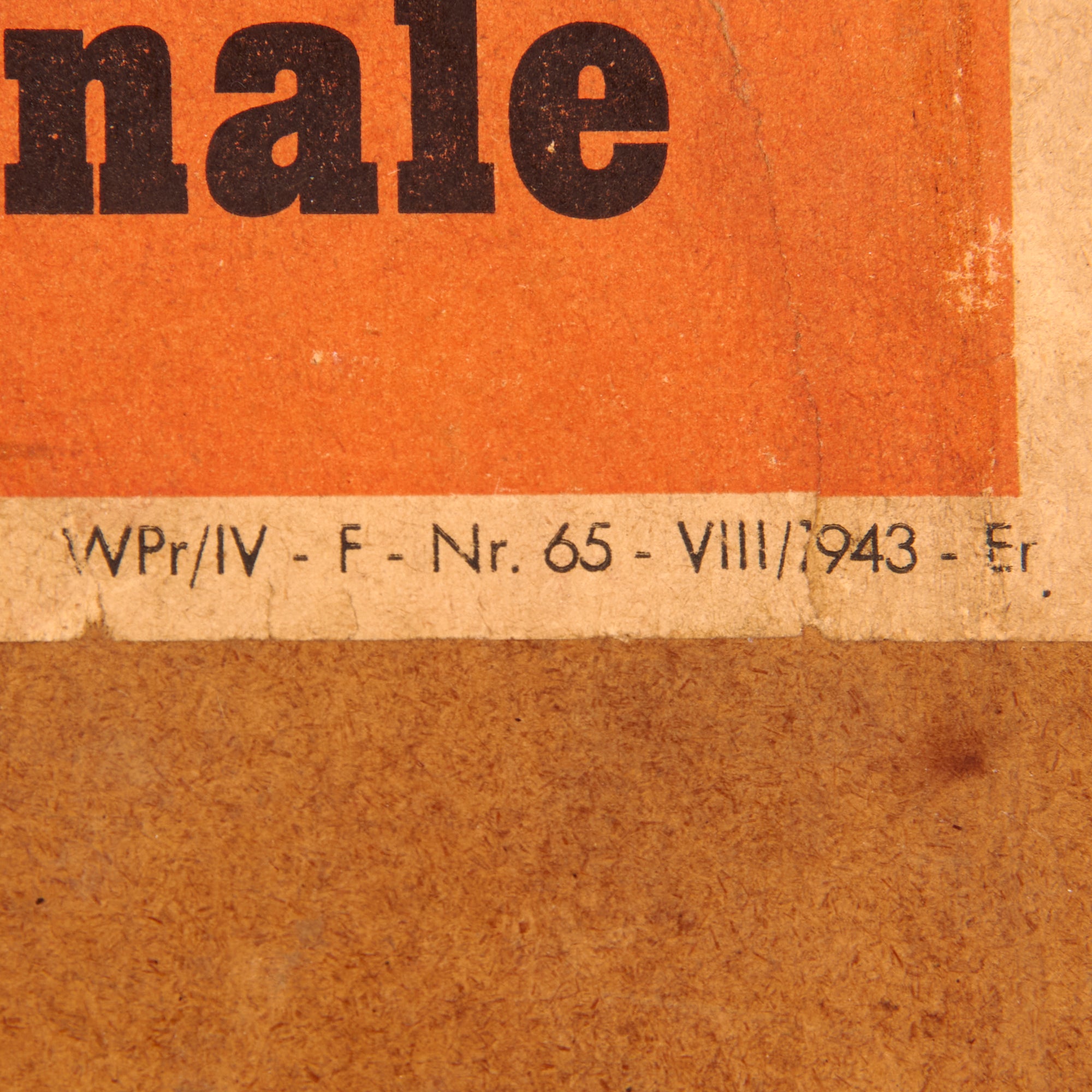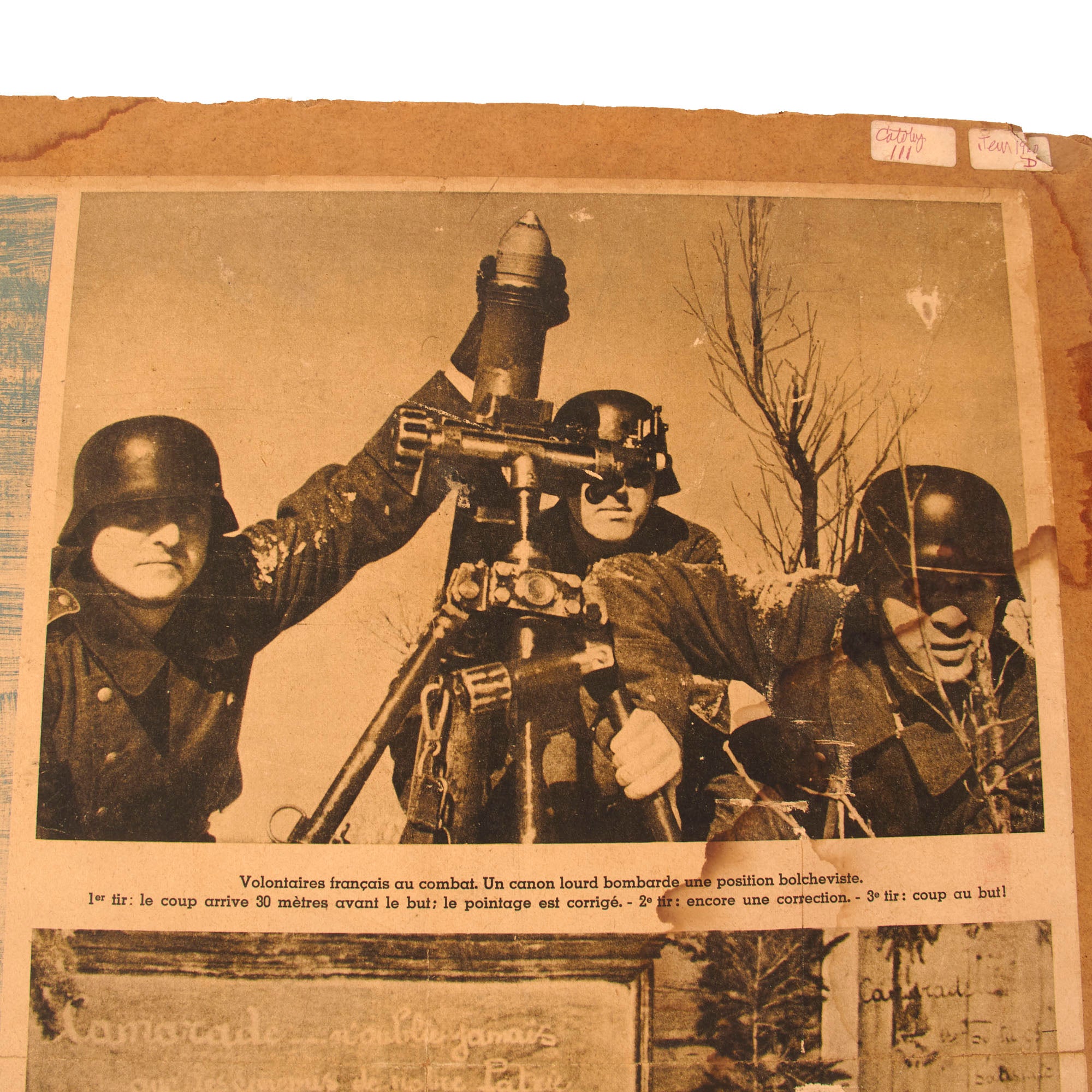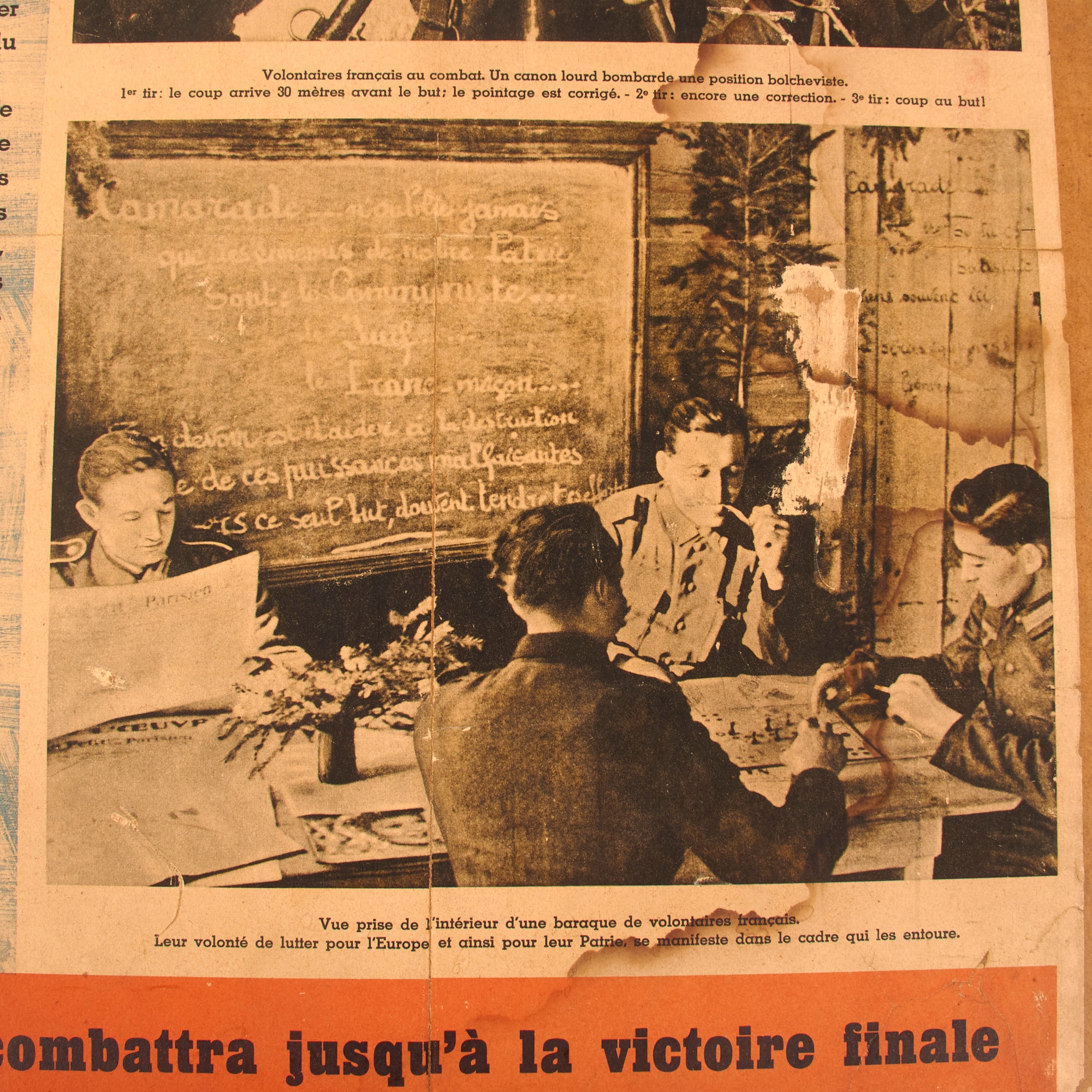 The second poster is also in French and is titled “KIEV - la plus grande victoire sur l’ennemi mortel de l’Europe!” or “KIEV - The greatest victory over Europe’s hammered enemy!”. This poster discusses the conclusion of the Battle of Kiev, and how it is such a substantial victory that history has not known until now. This poster is in the worst condition of the three, with heavy tearing and loss of material across. The particle board measures 29 ½ x 38” and the poster itself measures 24¼ x 33⅜”. There is heavy water damage to the particle board. This poster is dated 1941.