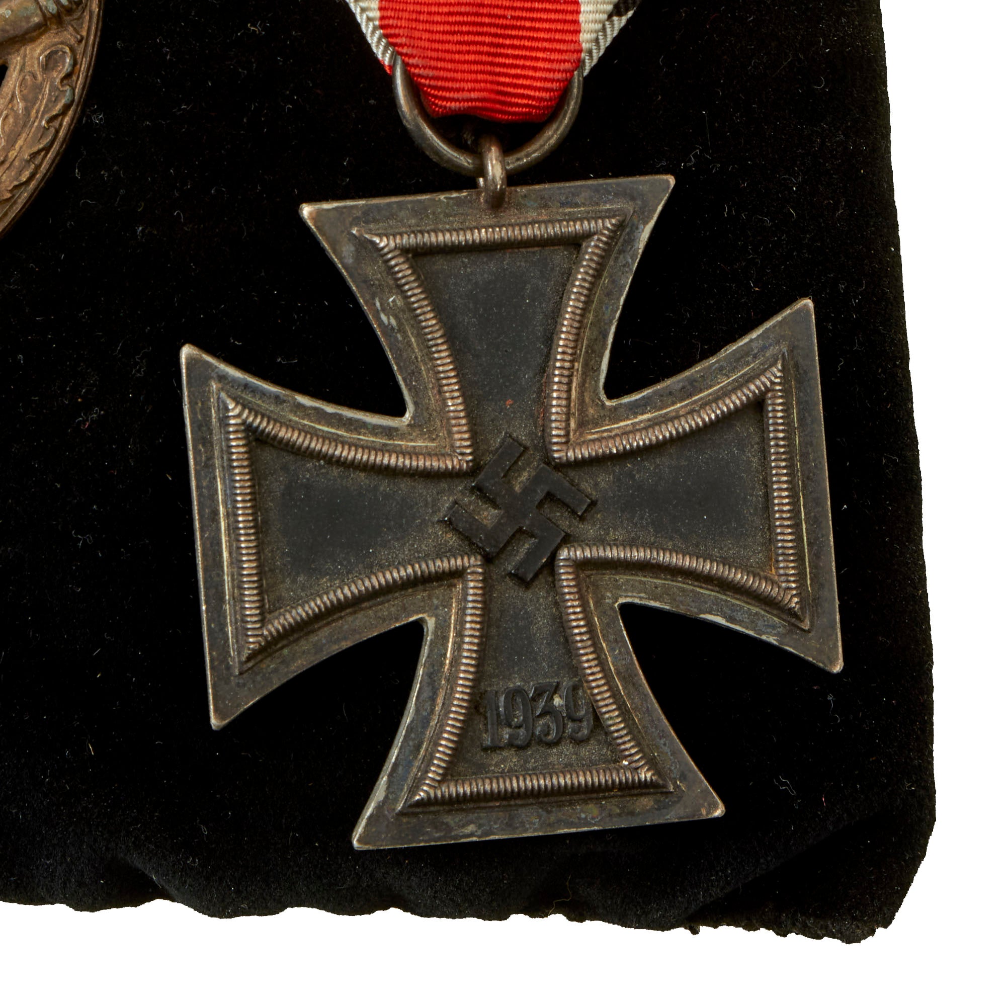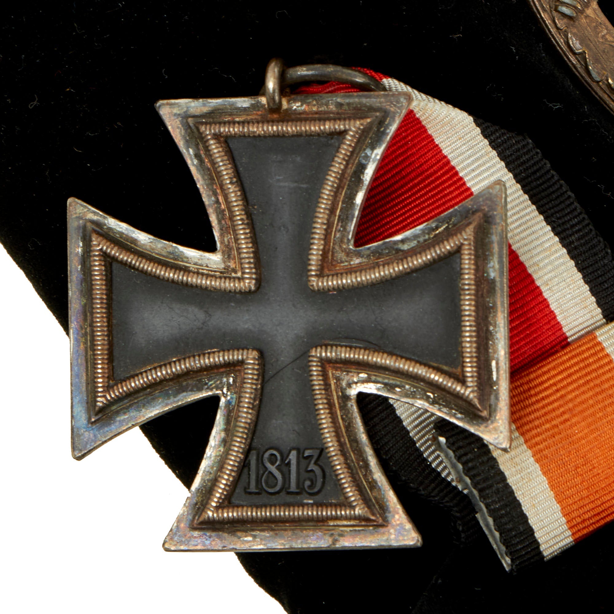 - One German WWII Iron Cross 2nd Class 1939 (Eisernes Kreuz II. Klasse 1939) with Ribbon and ribbon pin. This fine example is in very good condition, with a very good condition rayon tri-color ribbon showing some light toning and wear, while the ribbon pin shows some fading. The silver border has a lovely tarnished patina, showing that it is indeed real silver.
