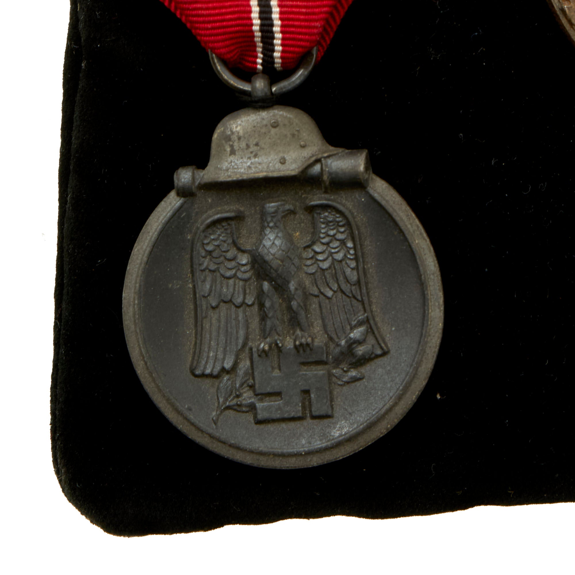 - One German WWII Eastern Front Medal (Ostmedaille) with ribbon and ribbon pin. The medal is fully intact, showing a lovely oxidized patina on the silvered portions, and the ribbon and pin are also in great shape. It is maker marked on the ring with Präsidialkanzlei des Führers Lieferant (Presidential Chancellery Supplier) number 93, which represents Richard Simm & Sohne of Gablonz.
