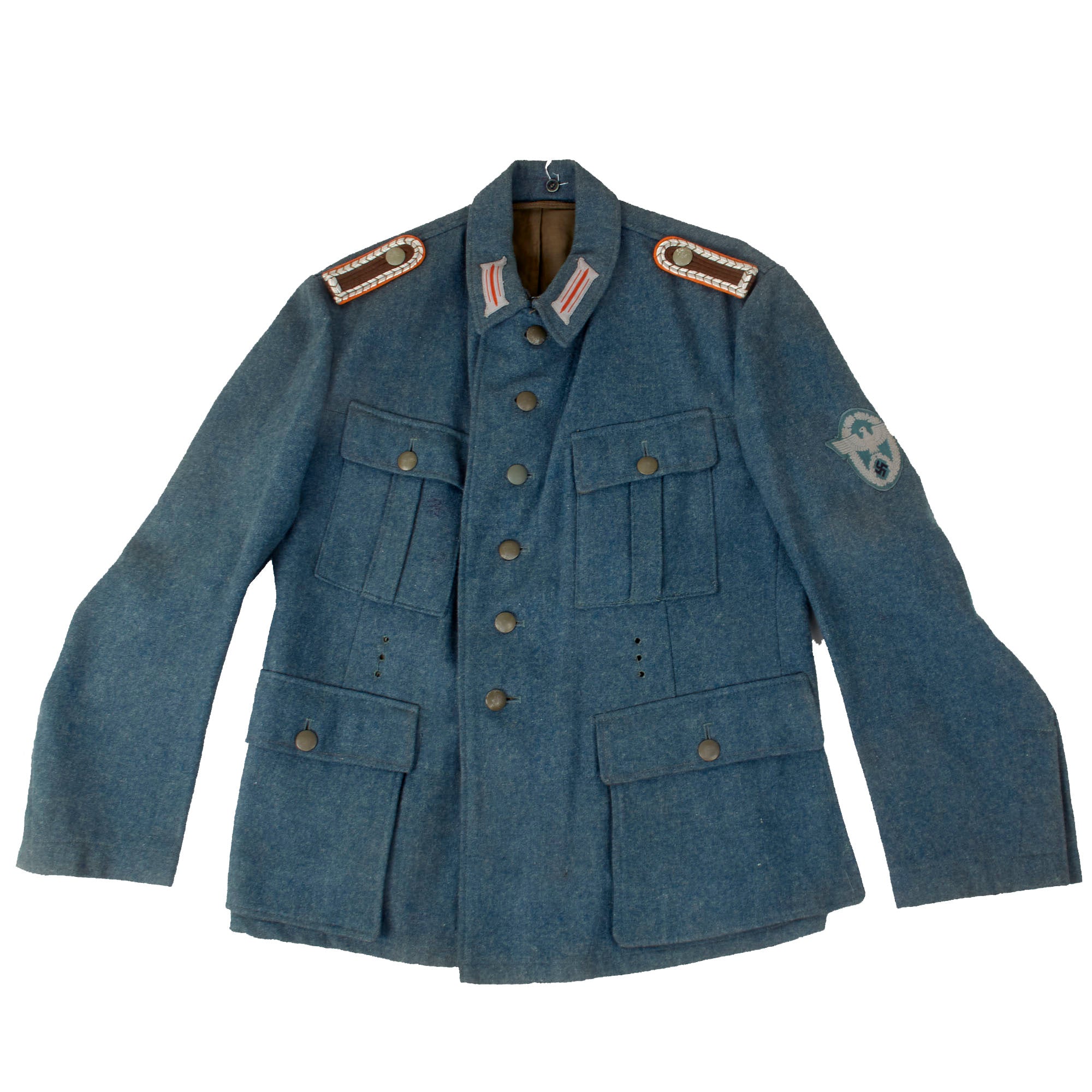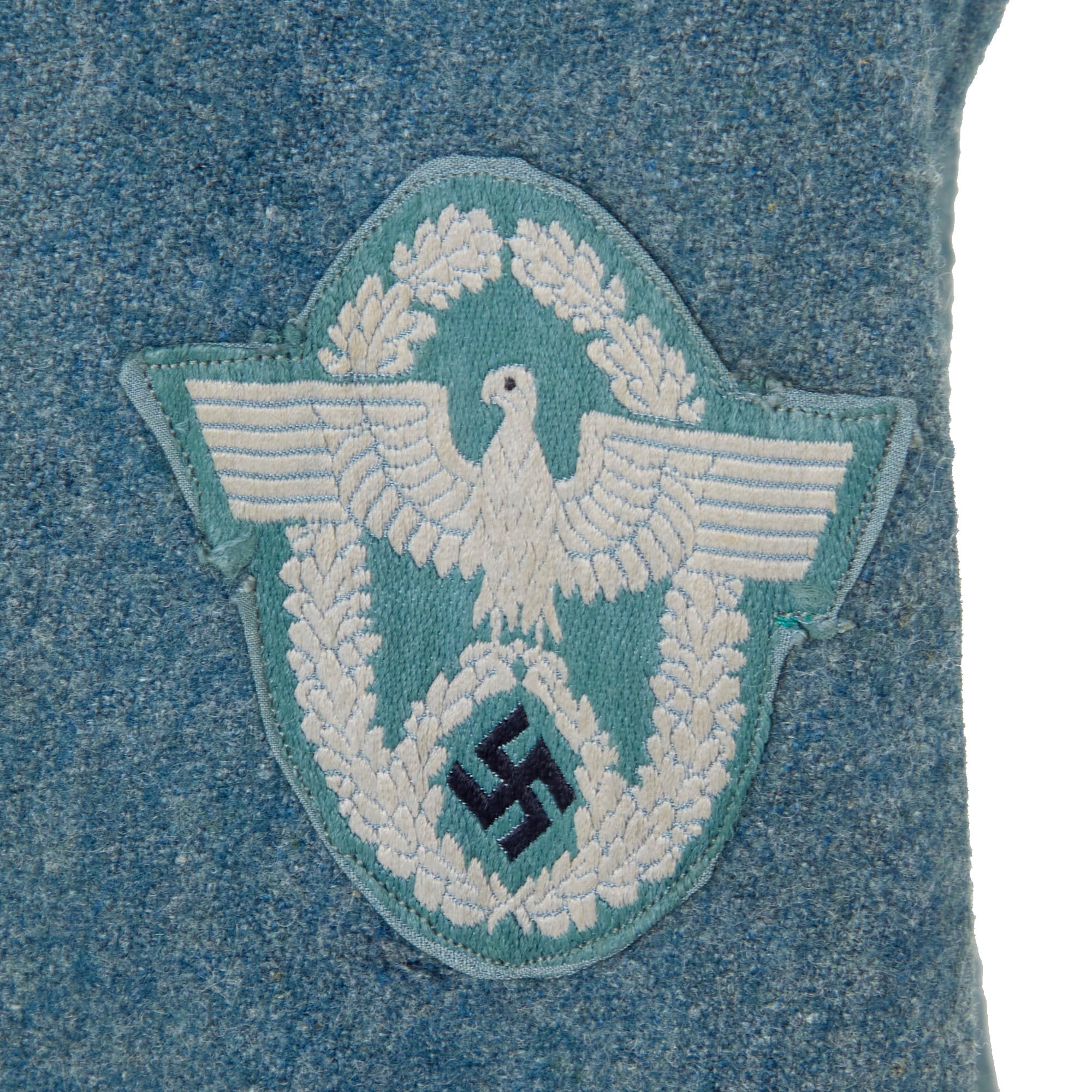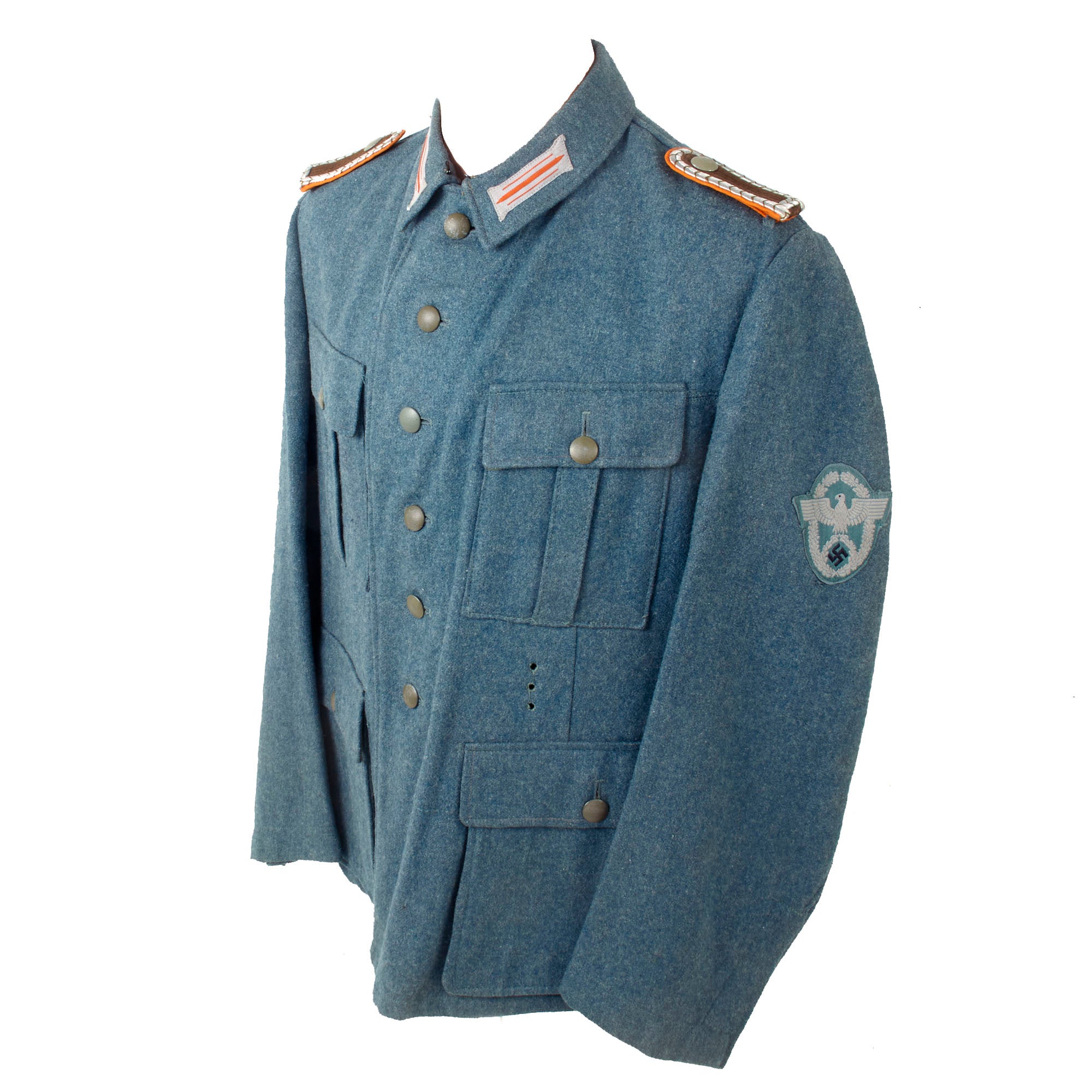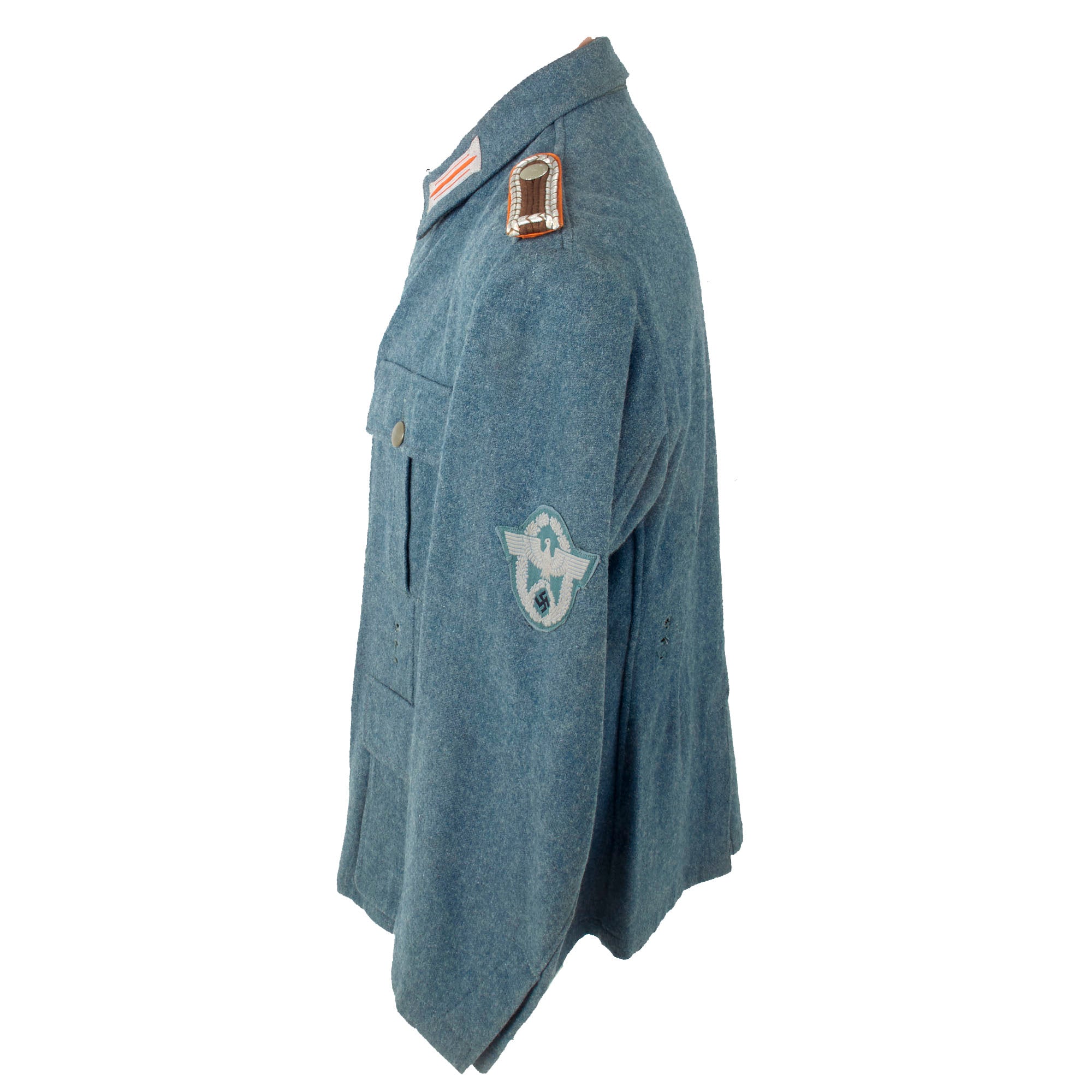 As this is a later war "field tunic", the brown "badge cloth" collar and sleeve adornments, as well as the piping, are not present. It features field style machine-woven police NCO's litzen collar patches on each side, made from light gray thread with Police Orange-gelb (Orange-yellow) stripes, the Truppenfarbe (Troop Color) of the Gendarmerie. As this is a Police tunic, there is no Wehrmachtadler breast eagle, and instead the uniform has a high quality machine embroidered Civic Police Eagle badge sewn to the left sleeve. As it is post 1941, there is no district marking, and it also is light gray on a police green background, which could be used for any branch.